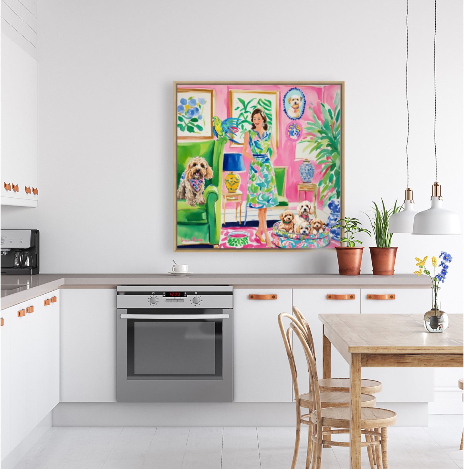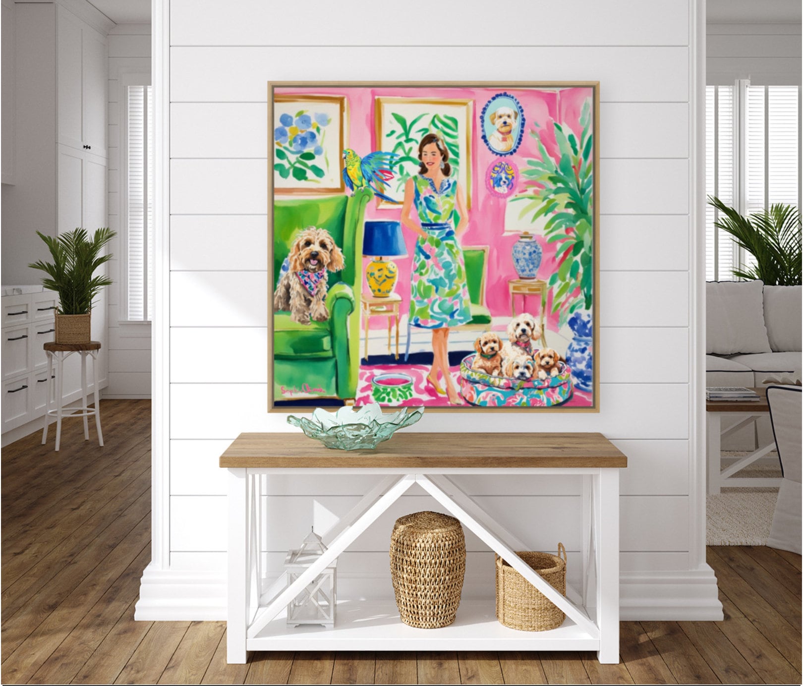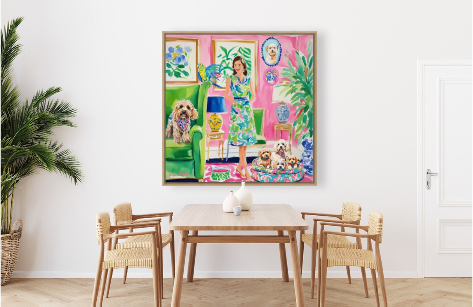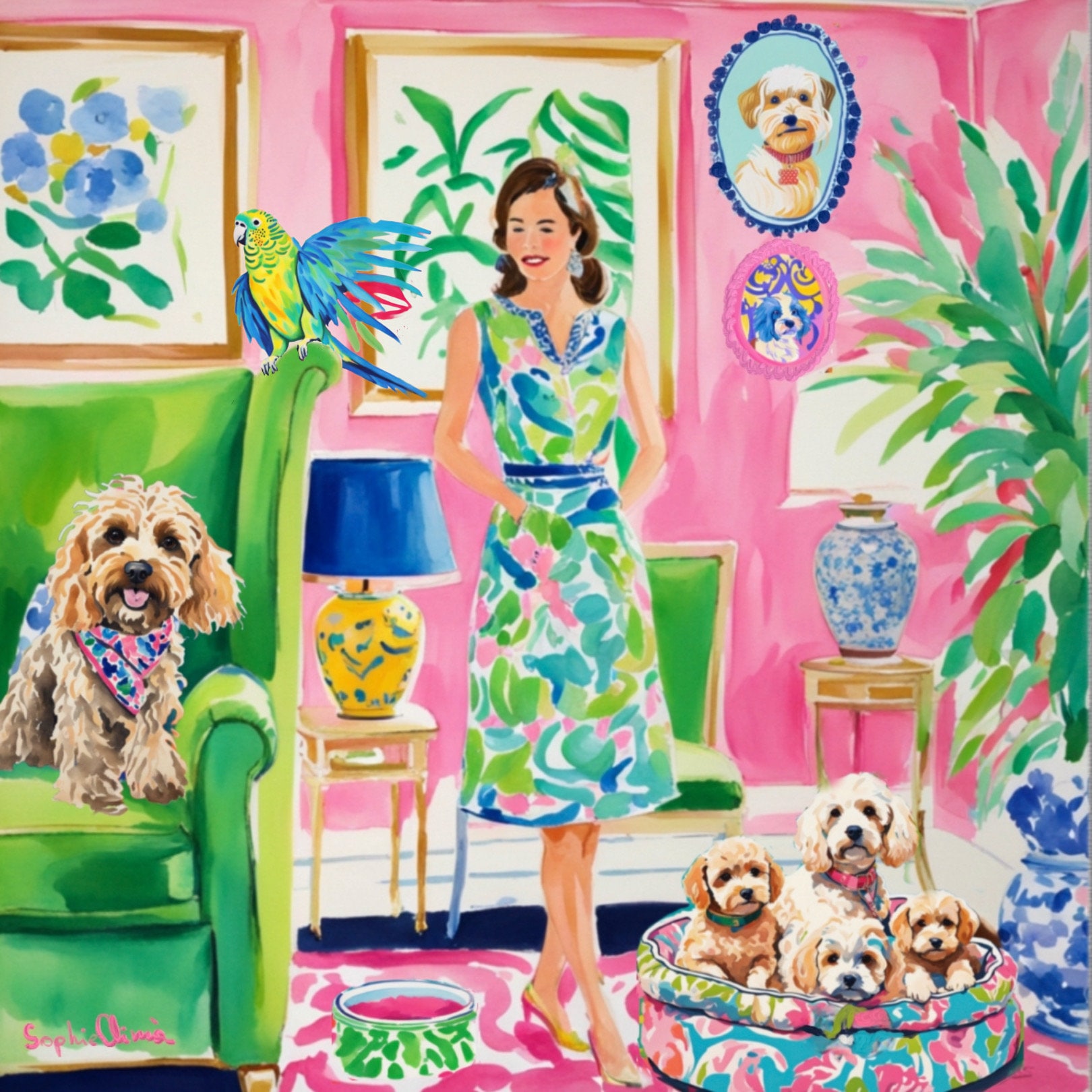 Parrot and Puppies Art Print: Whimsical Grandmillennial Decor