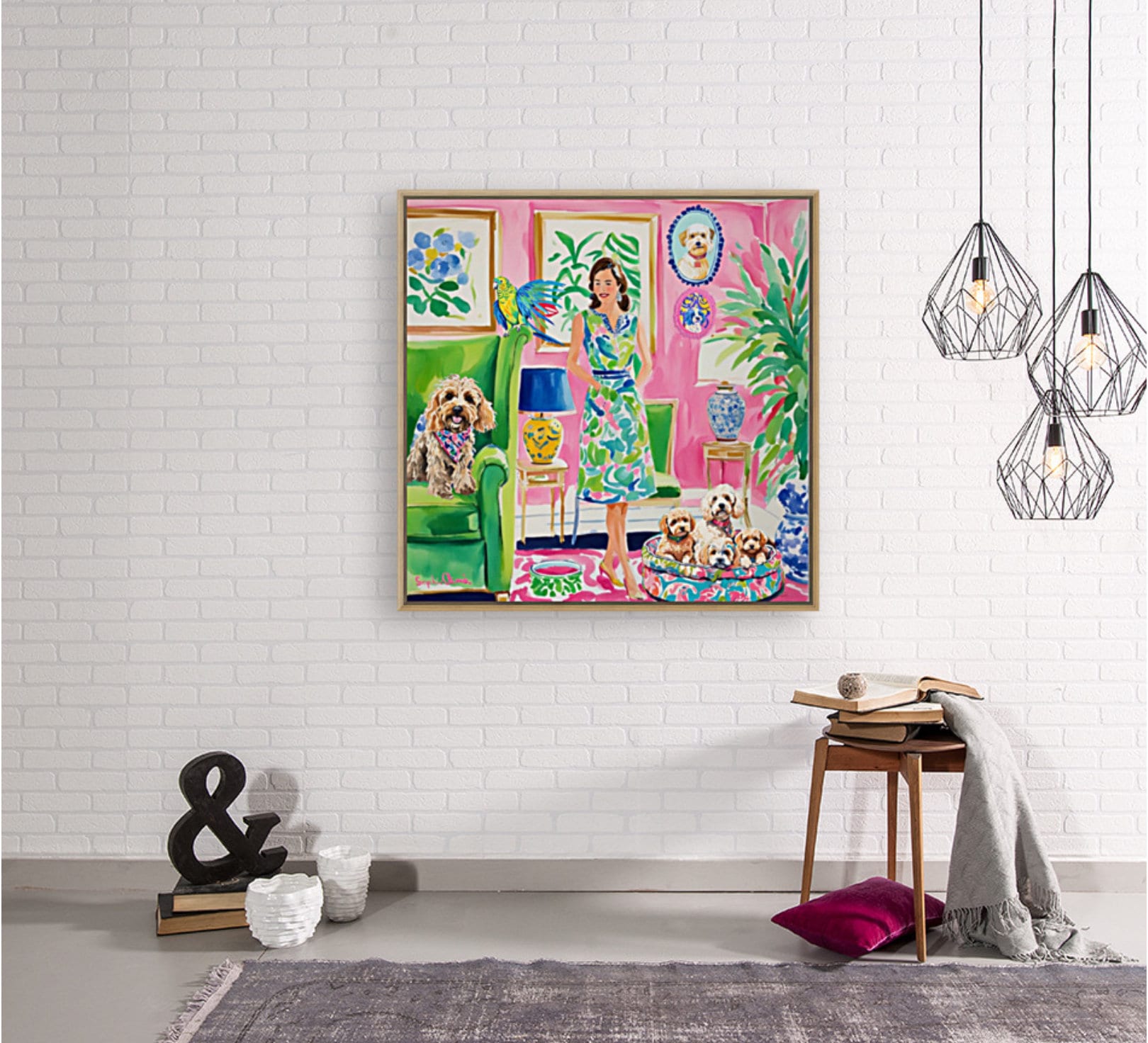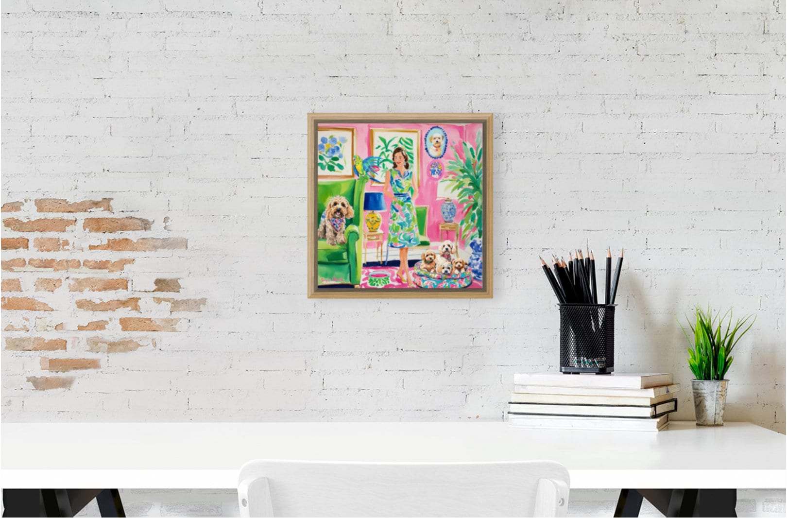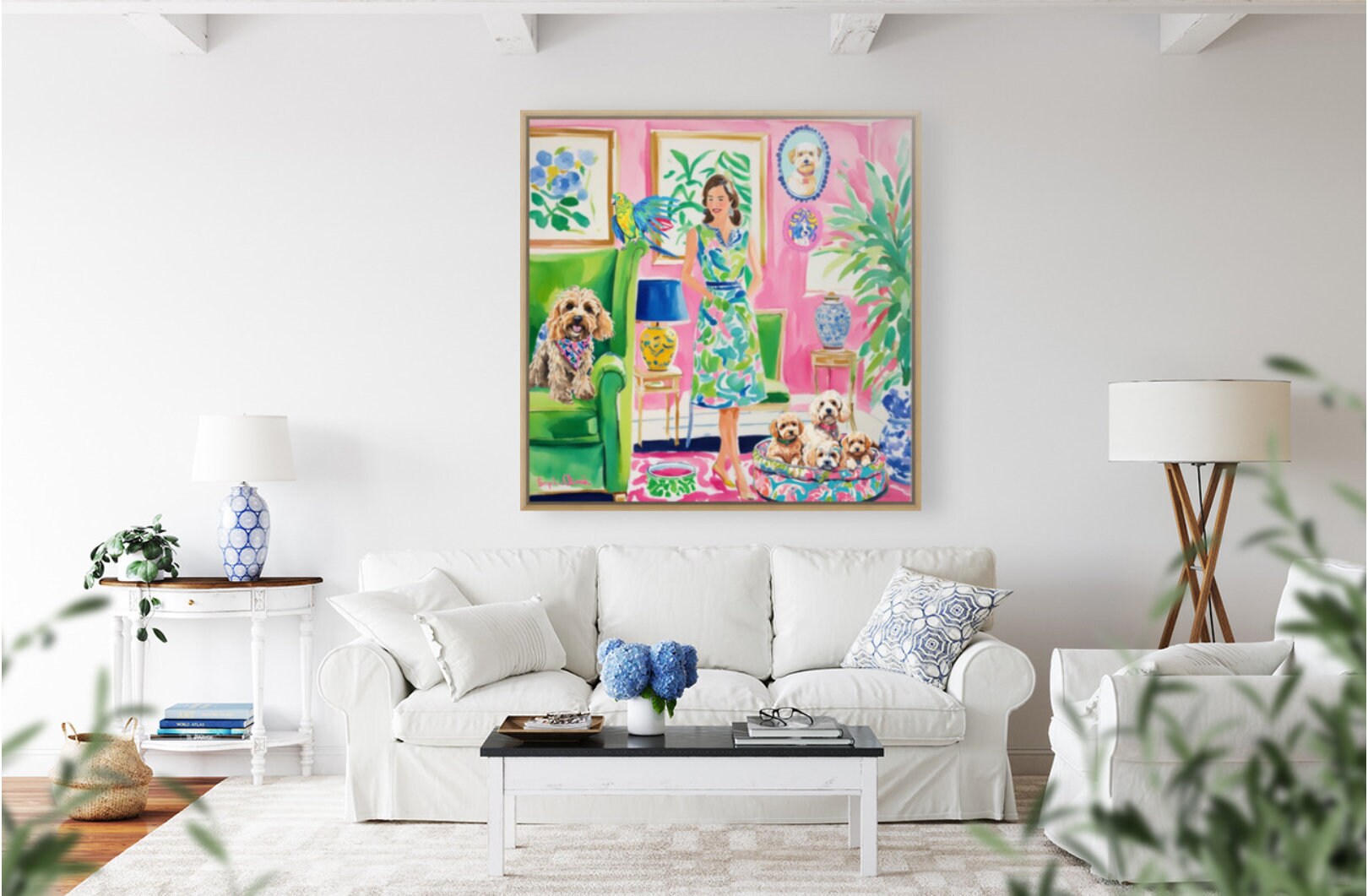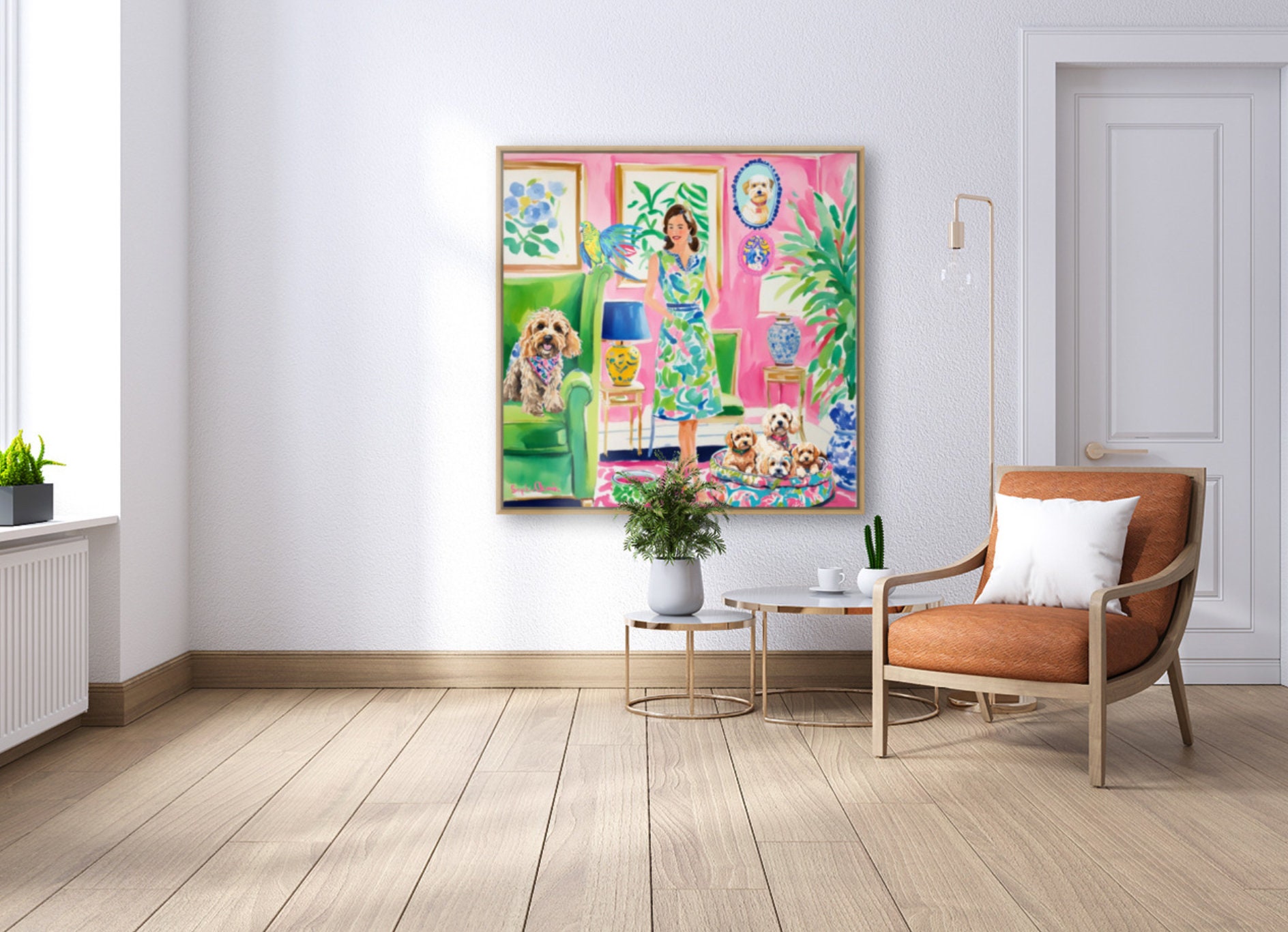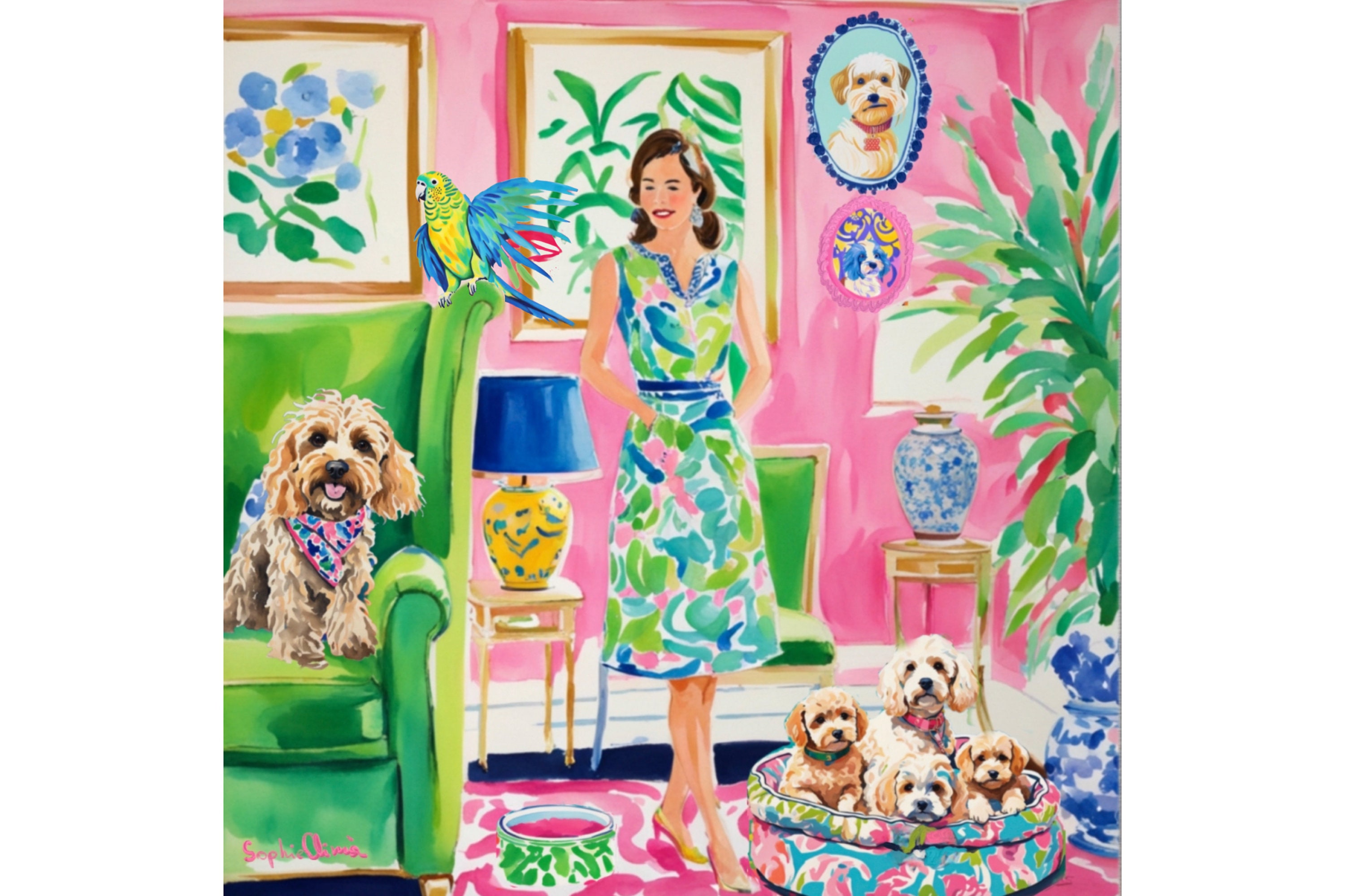 Parrot and Puppies Art Print: Whimsical Grandmillennial Decor