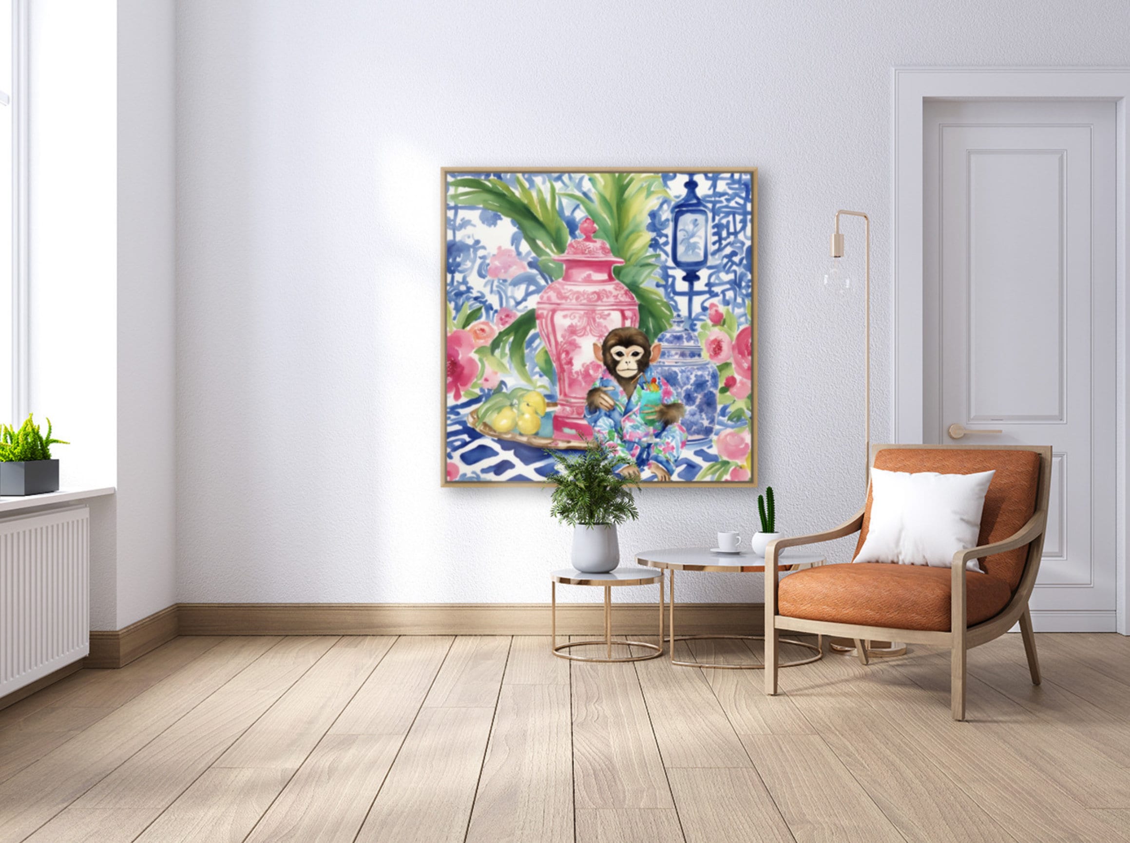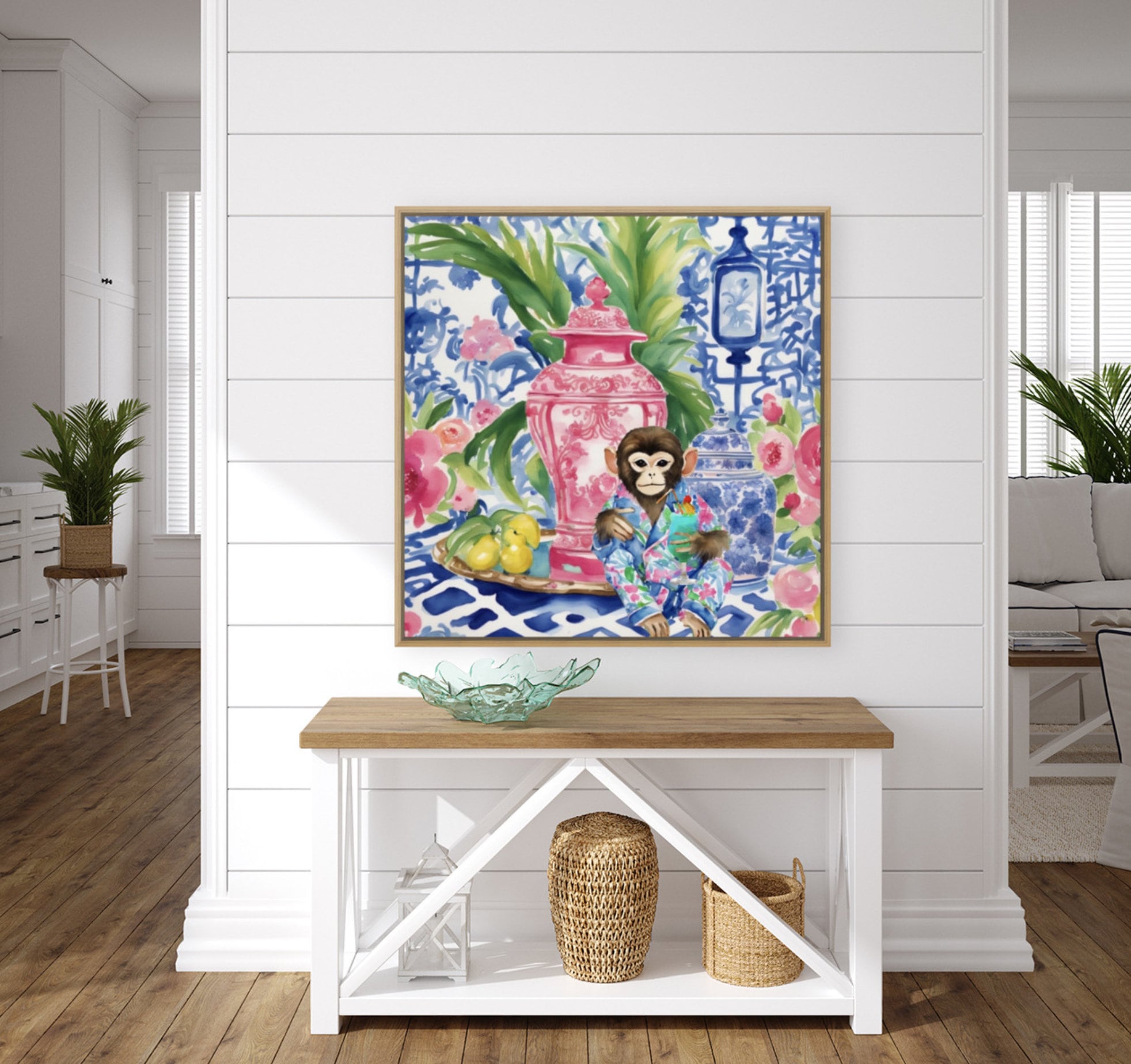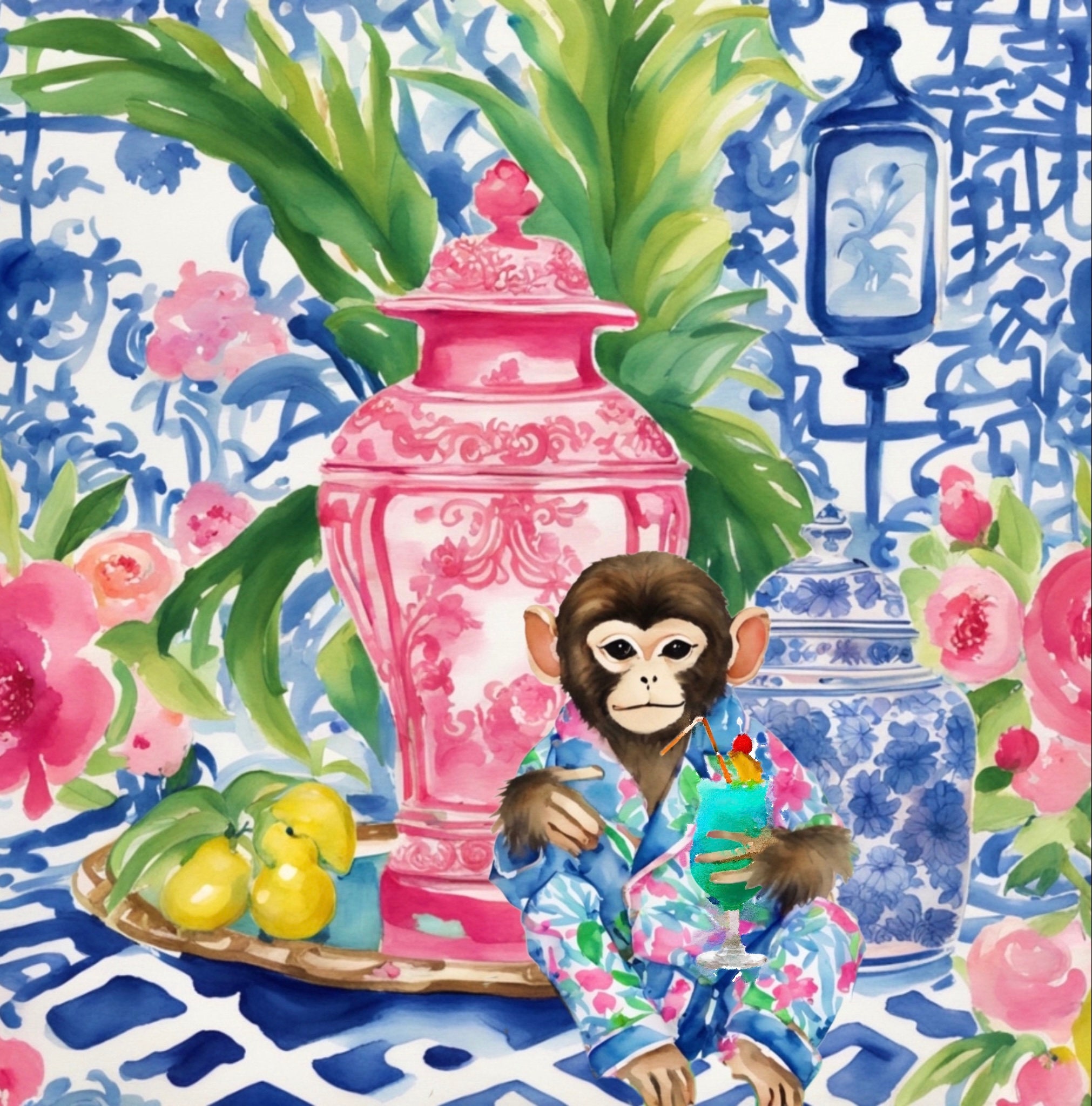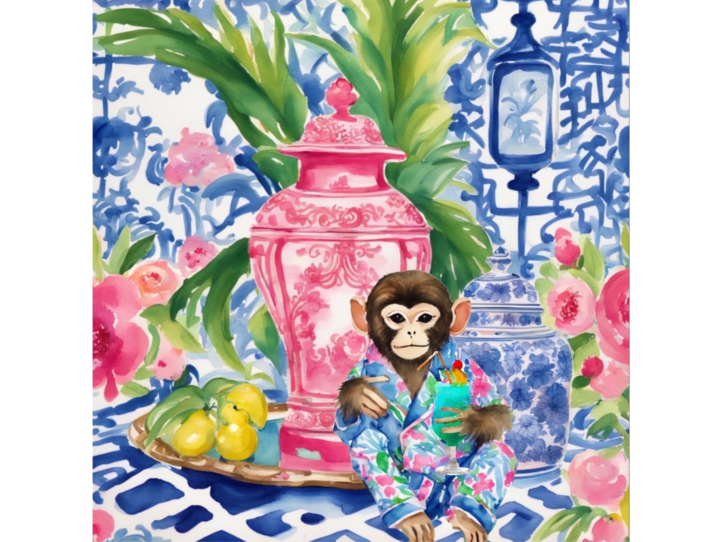 Chinoiserie monkey drinking cocktail in blue, white and red interior, whimsical watercolor