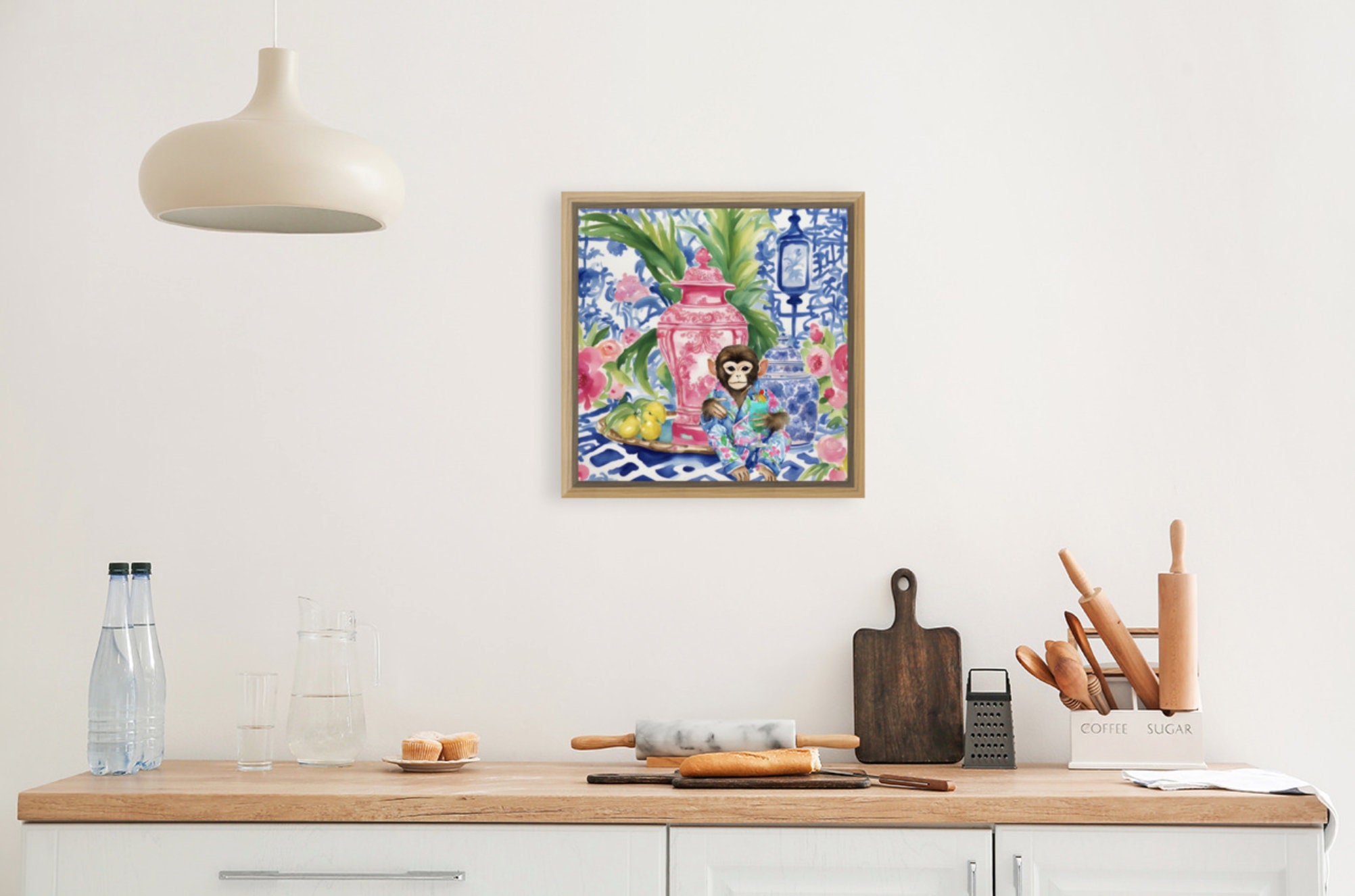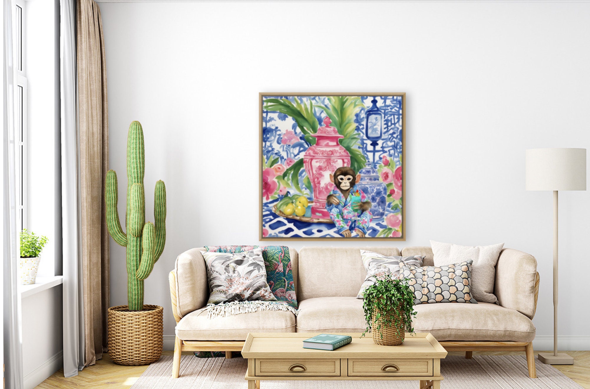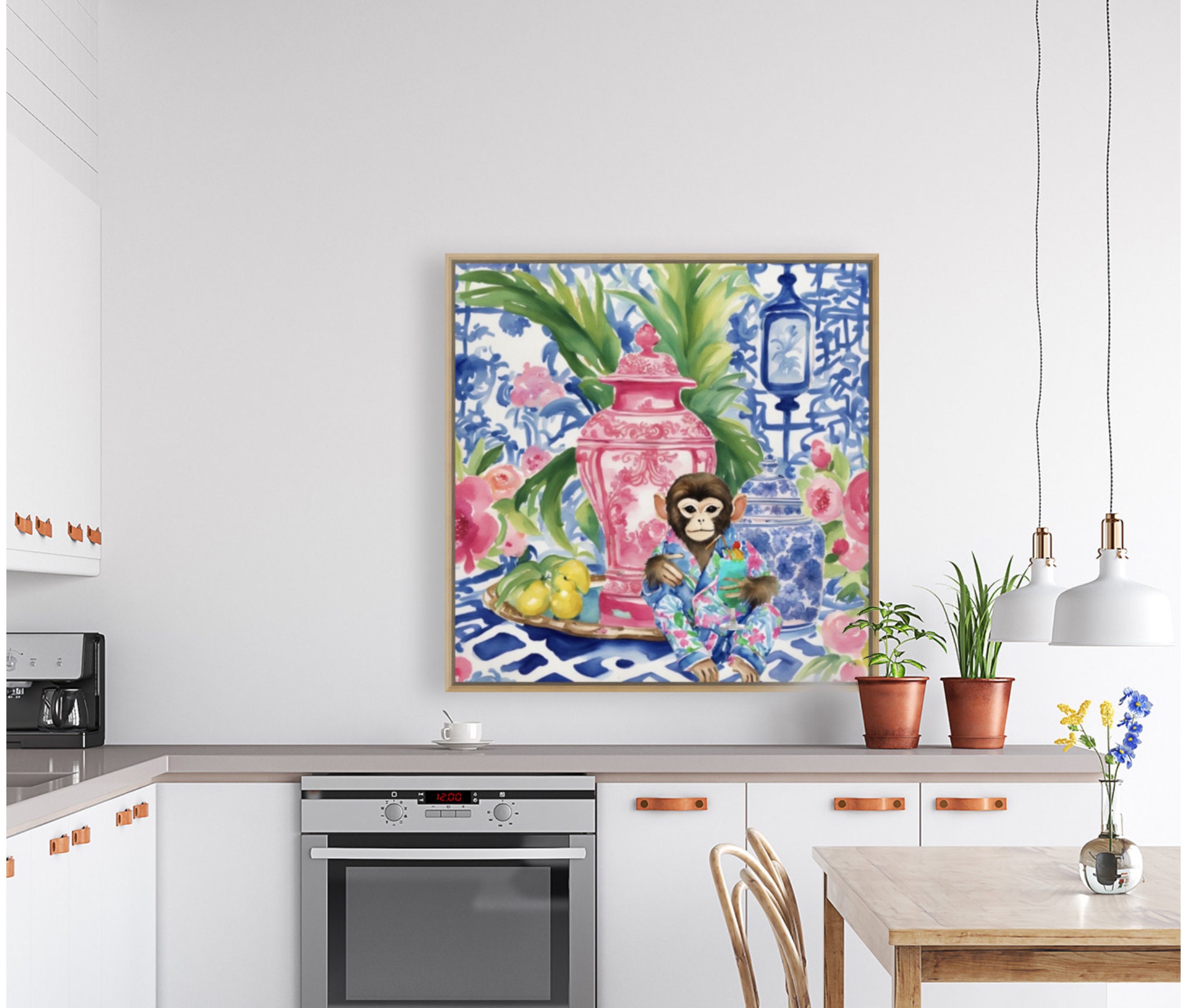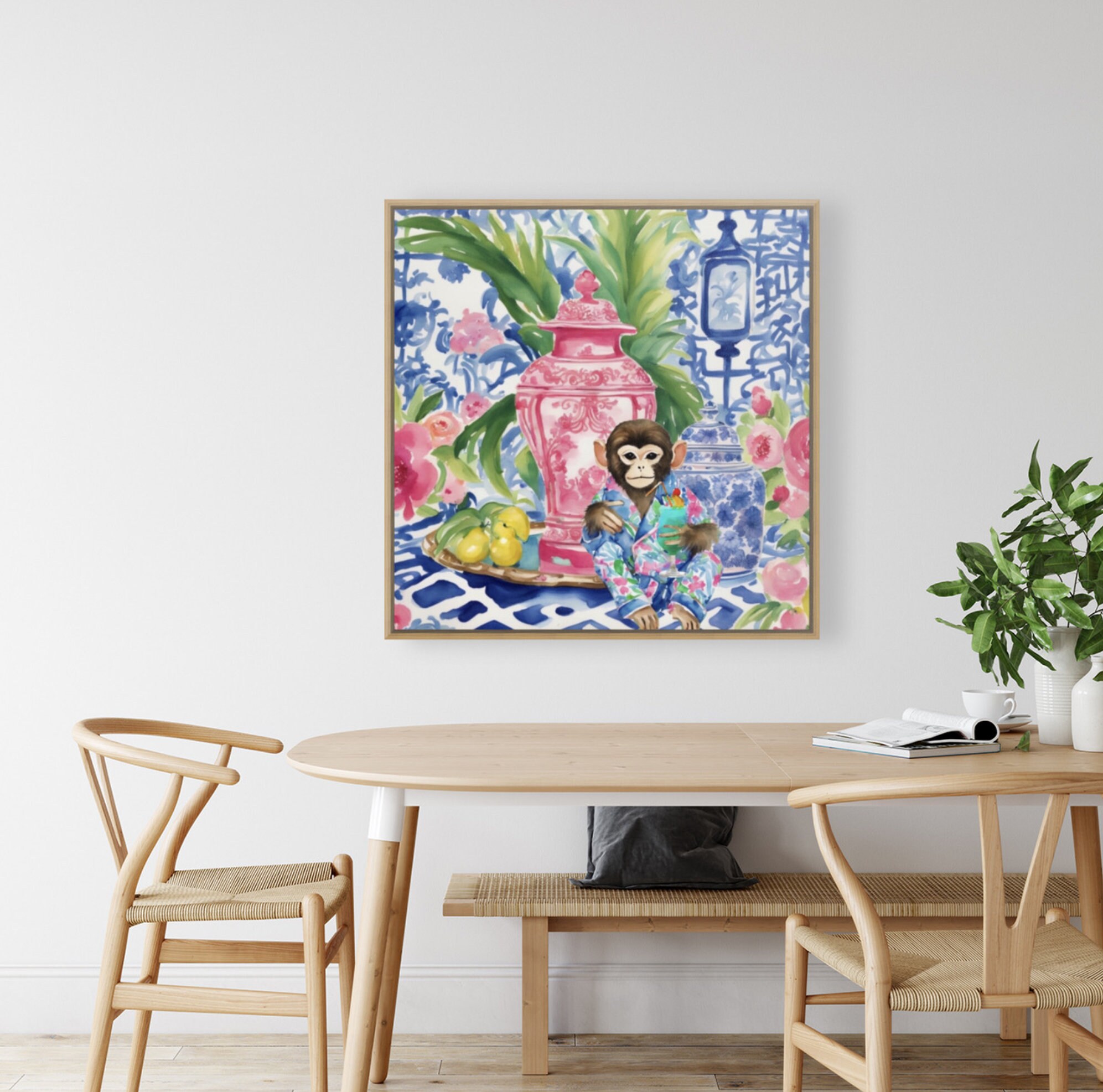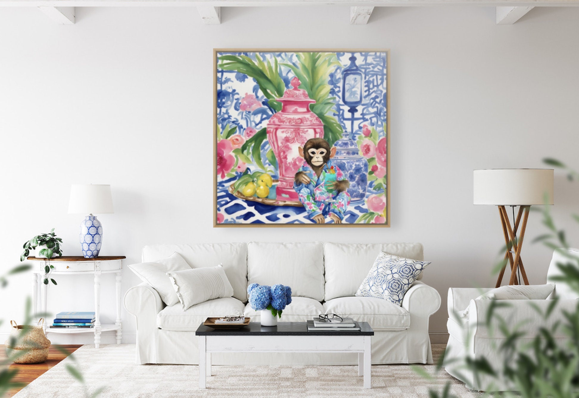 Chinoiserie monkey drinking cocktail in blue, white and red interior, whimsical watercolor