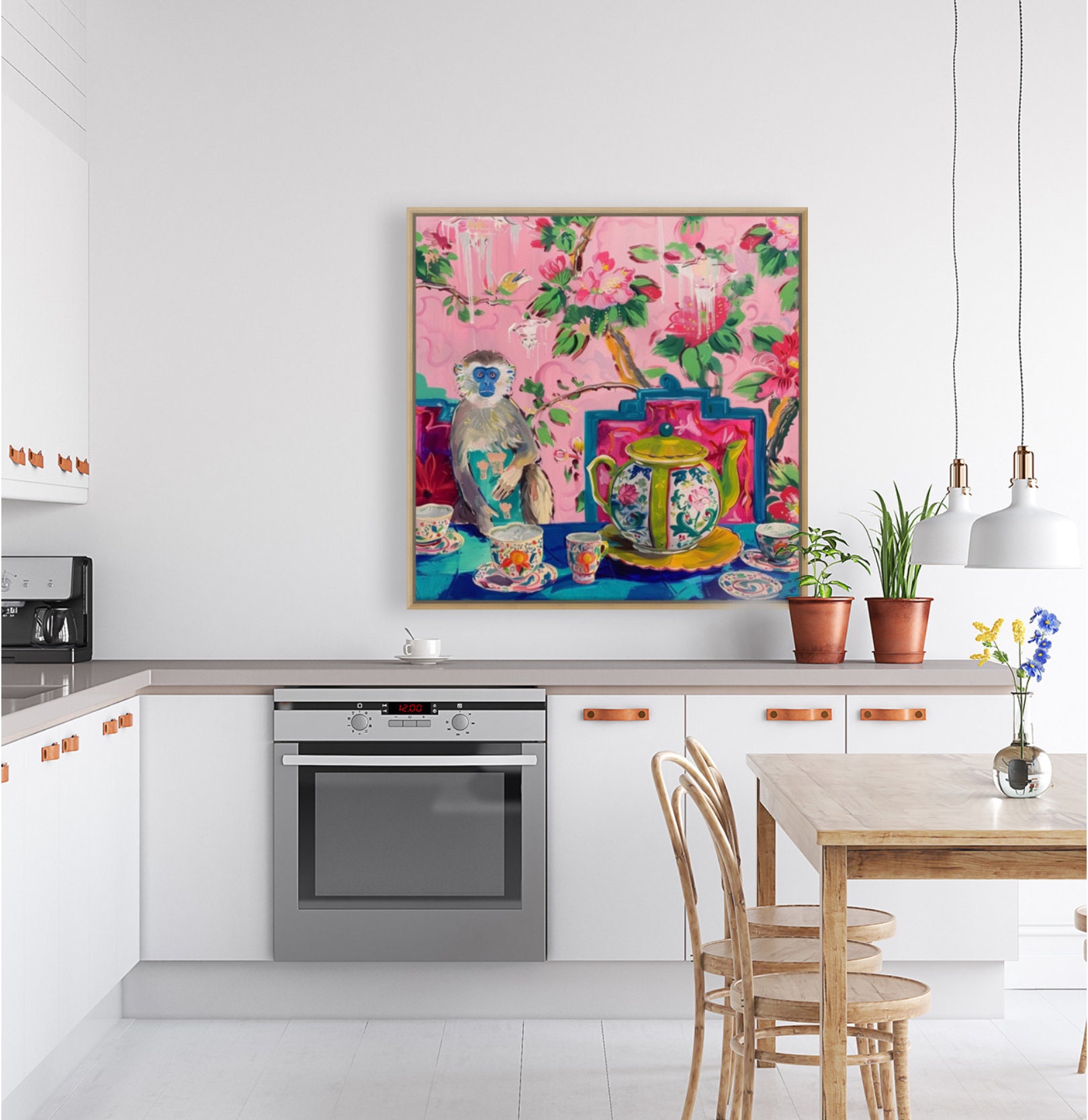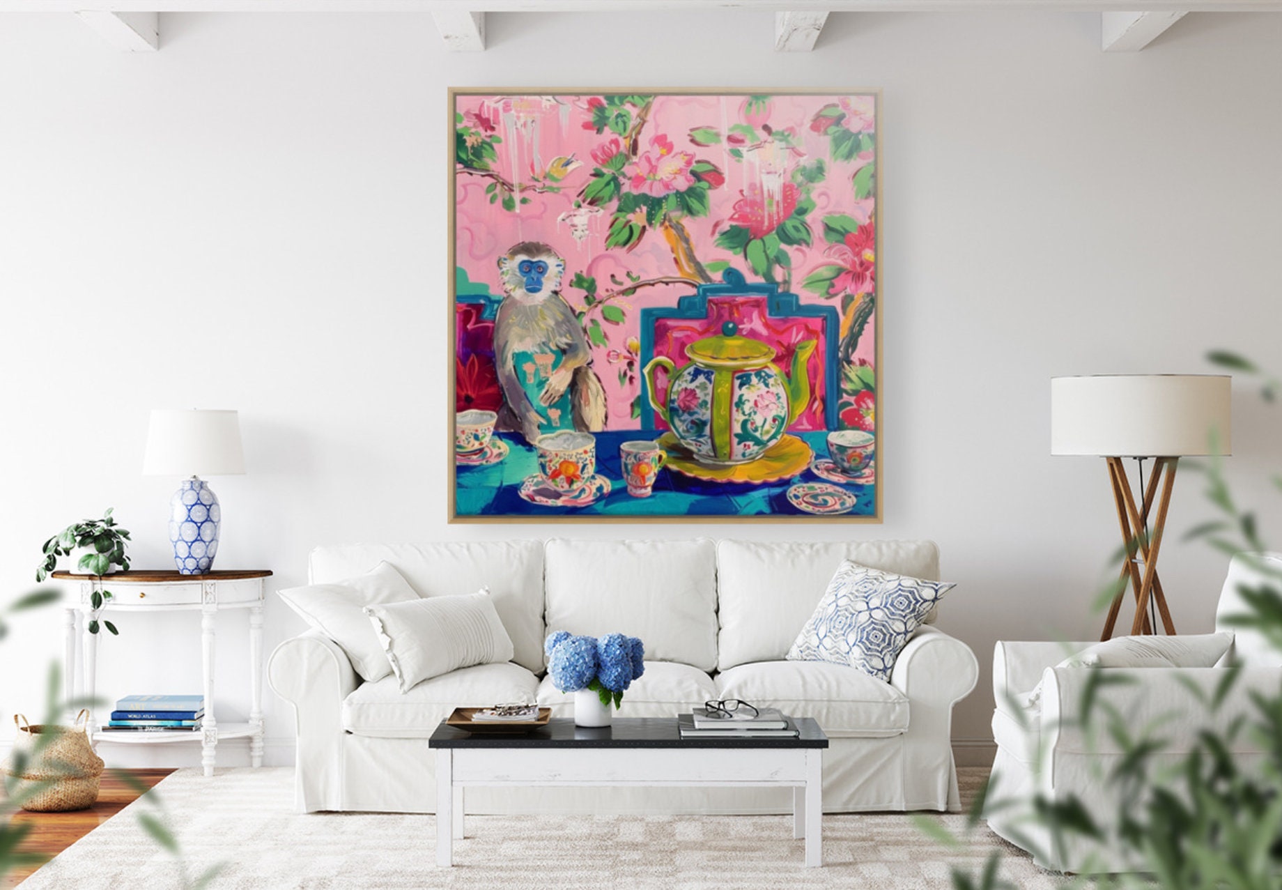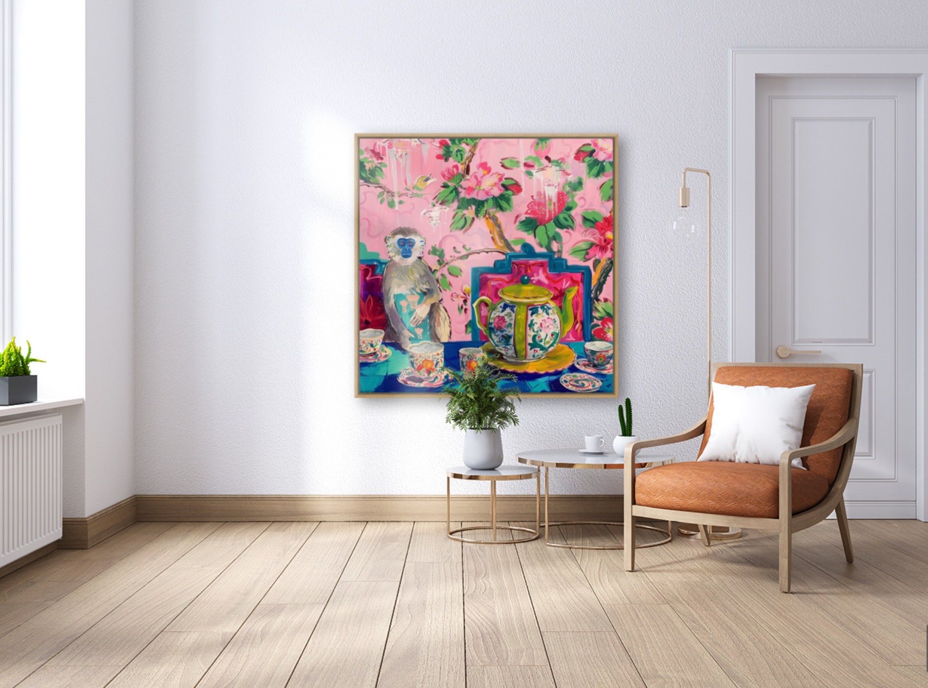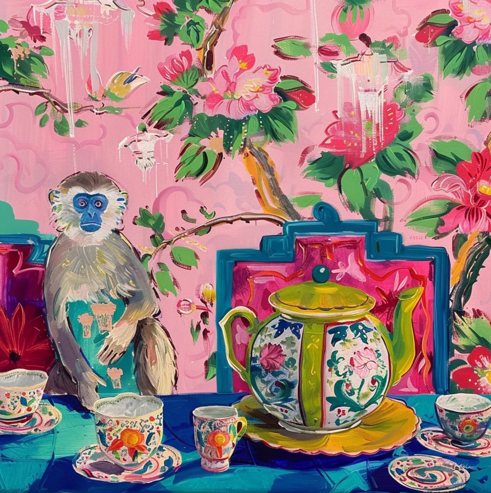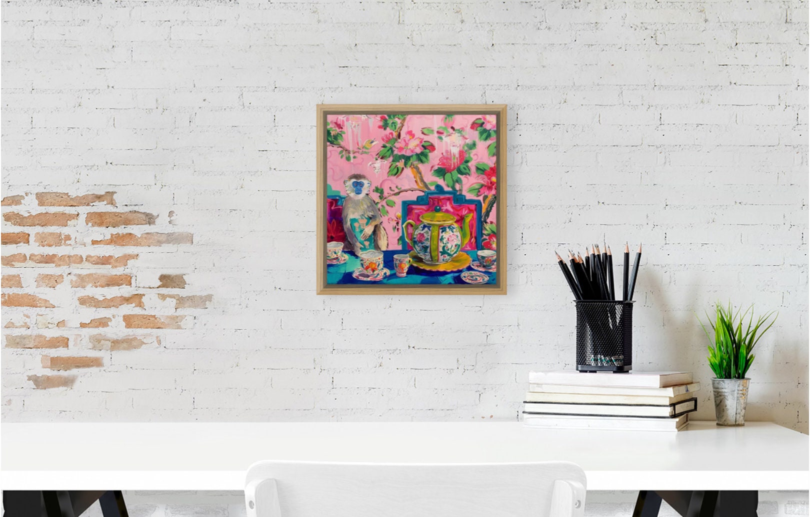 Sophie's art is the modern interpretation of Chinese artistic traditions featuring pagodas, landscapes, blue and white porcelain, ginger jars, pagodas, cheetahs and monkeys. Sophie developed her own recognizable style with bright colors and whimsical details.