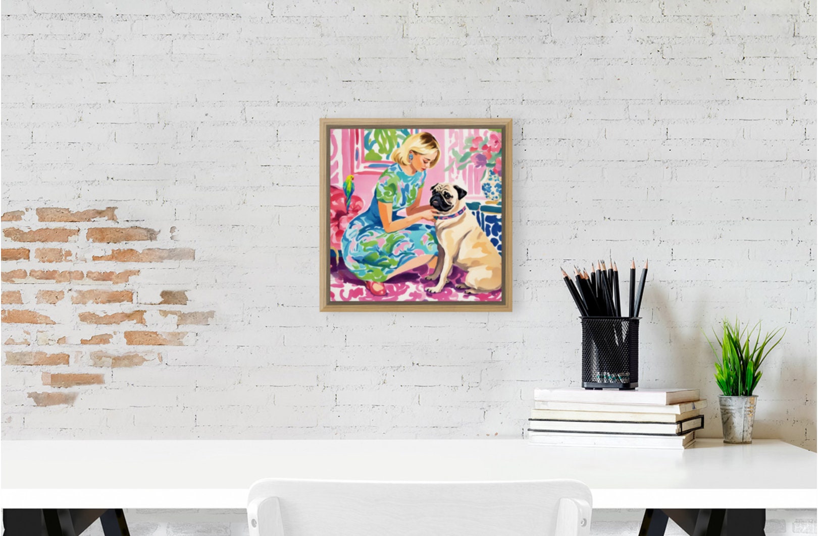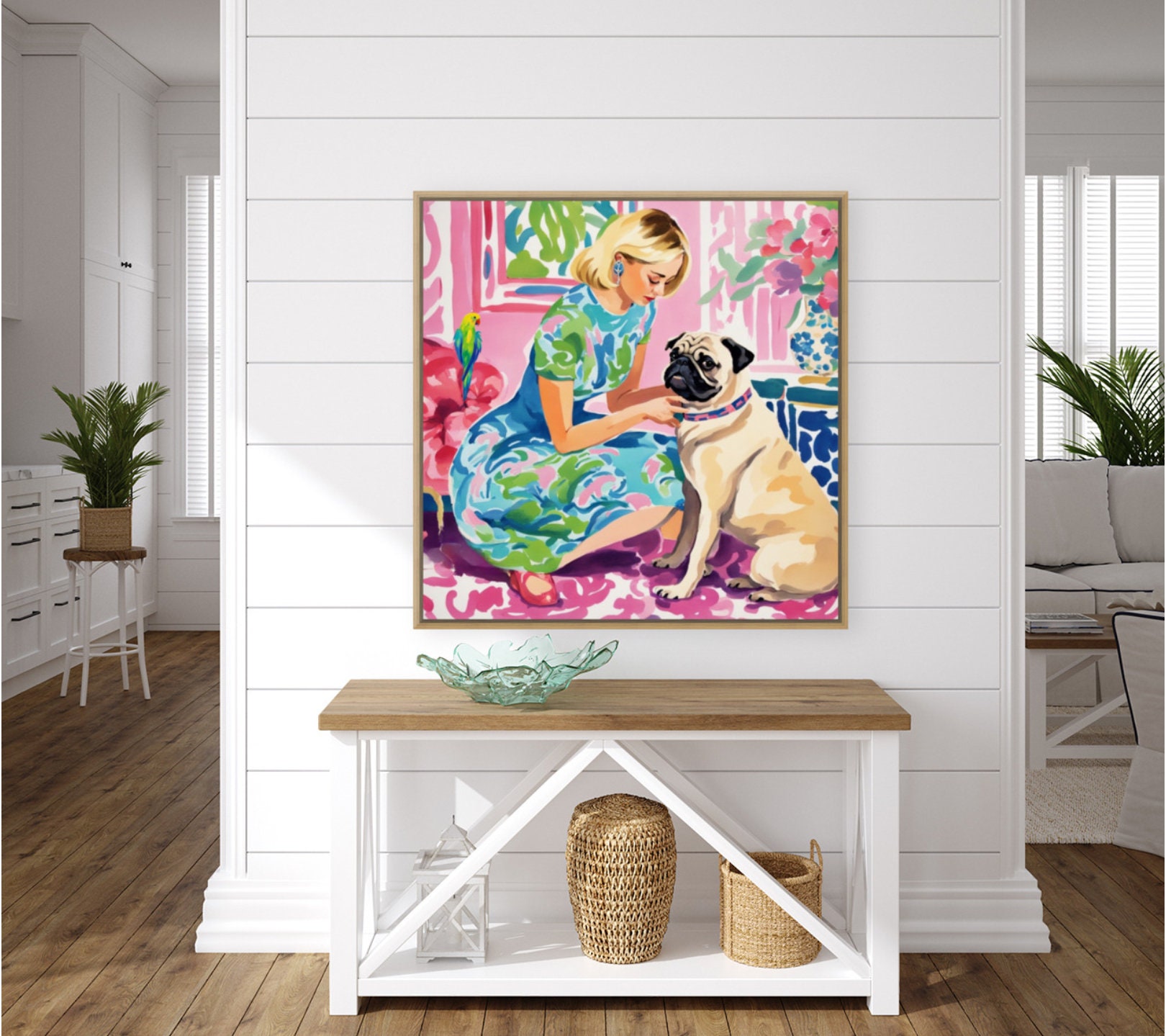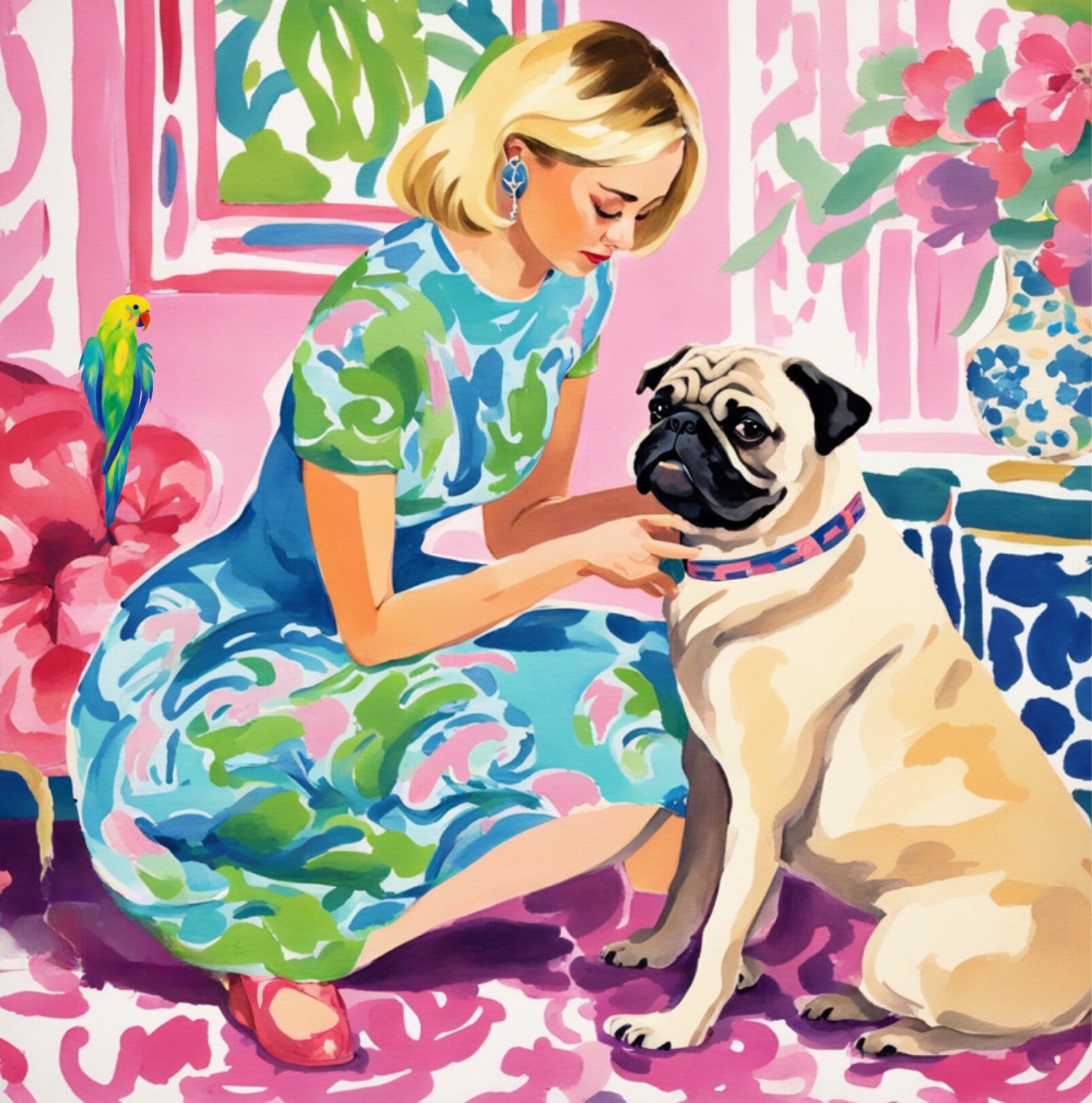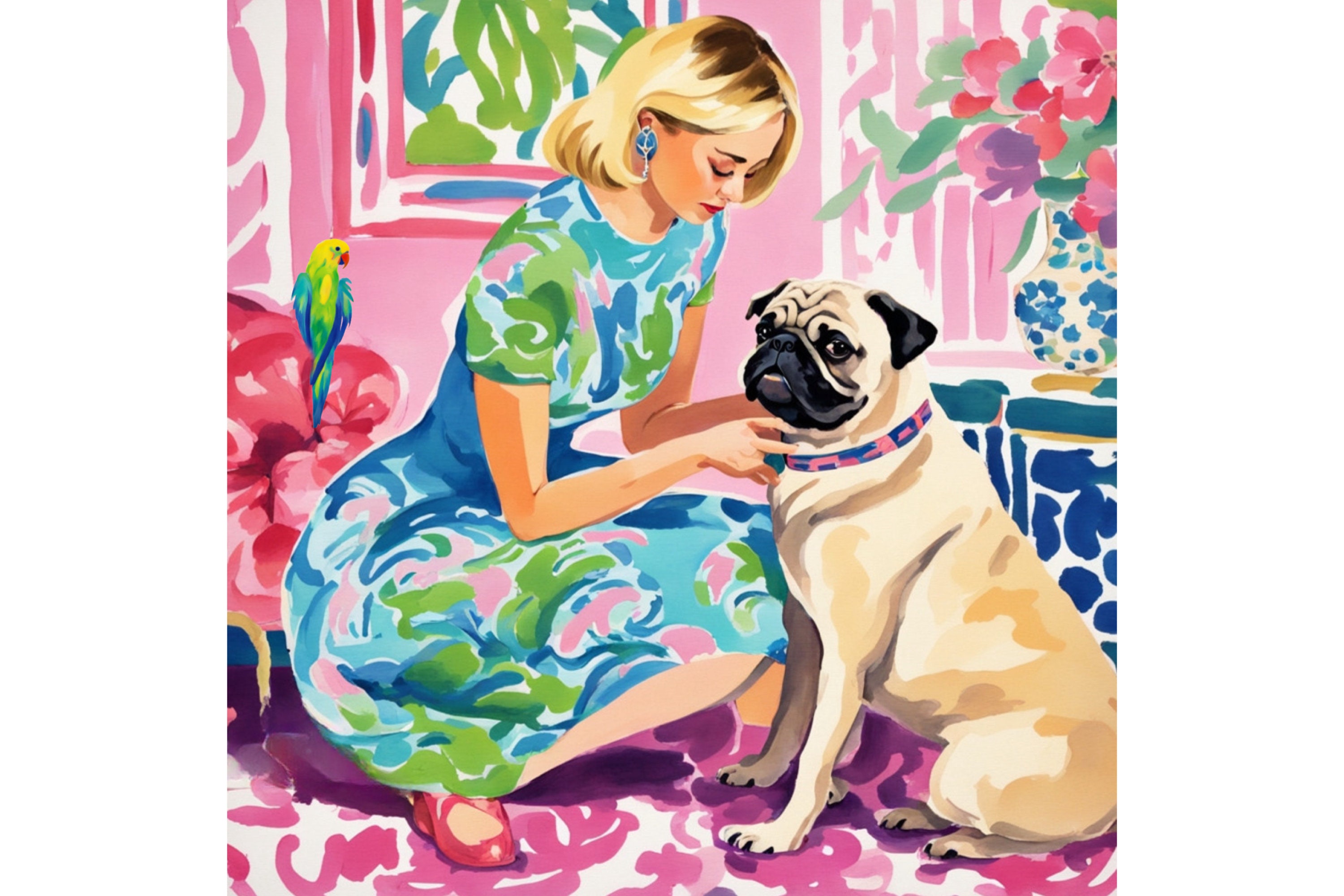 Parrot and Pug Art Print: Whimsical Preppy Wall Decor