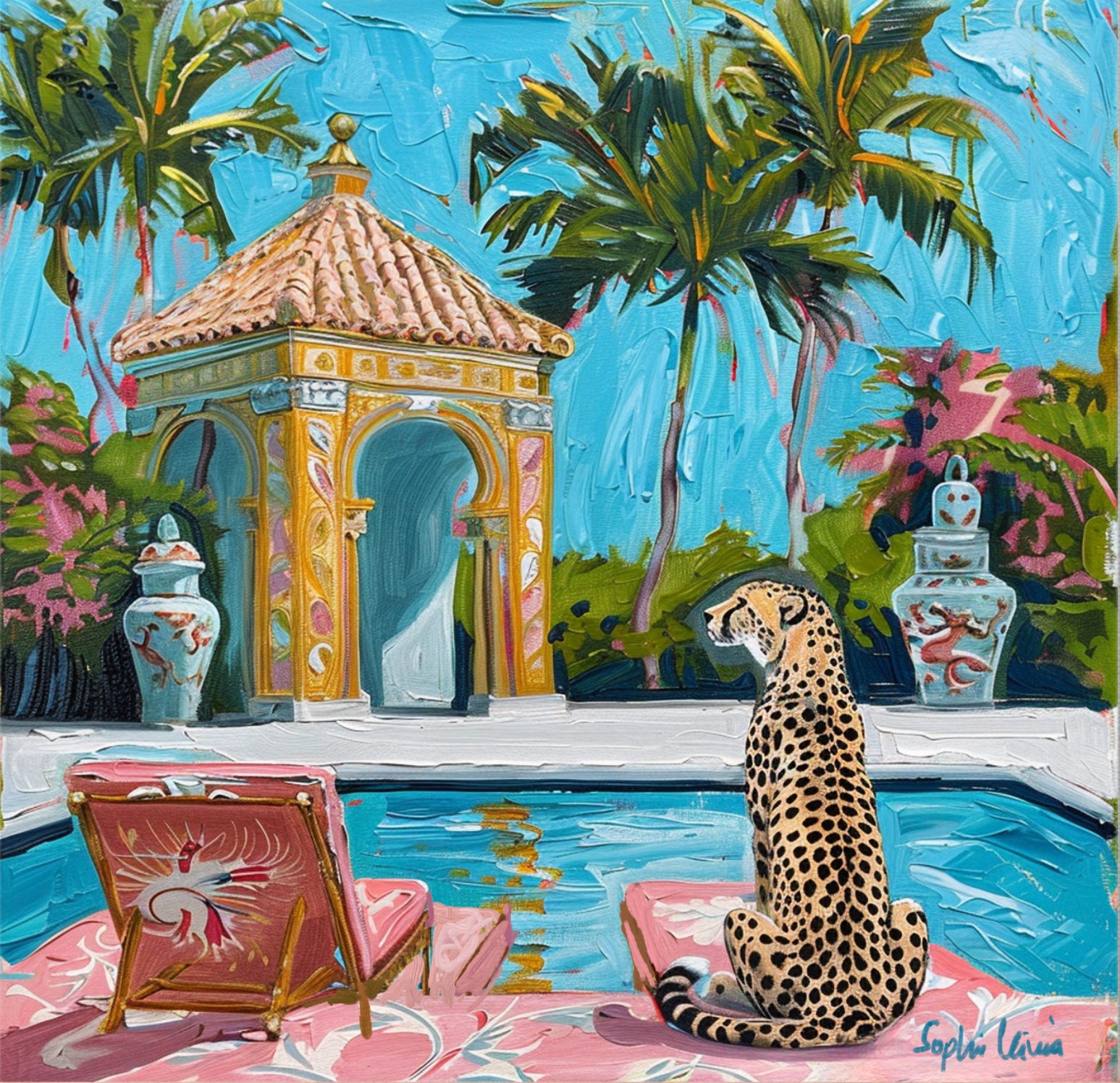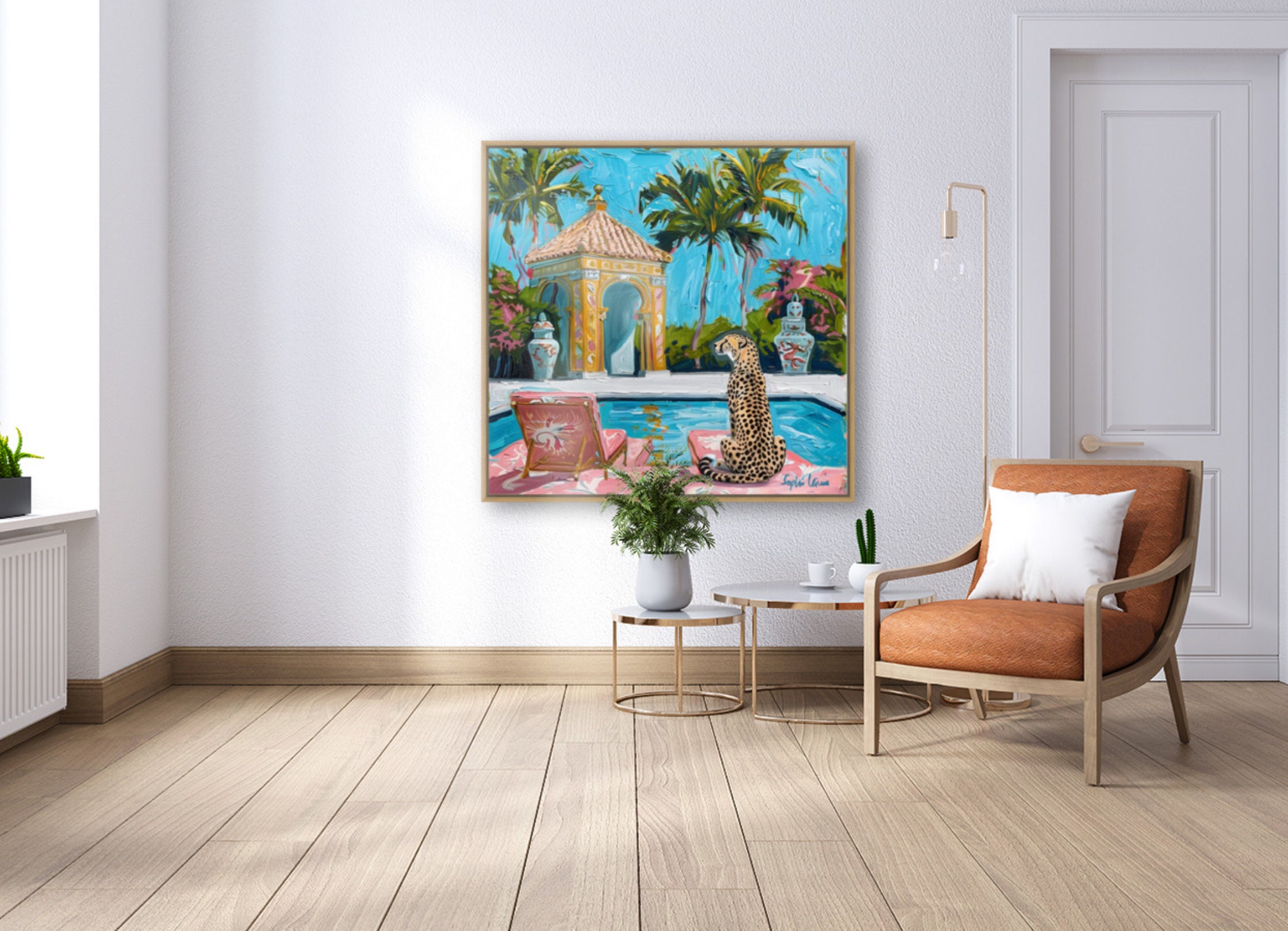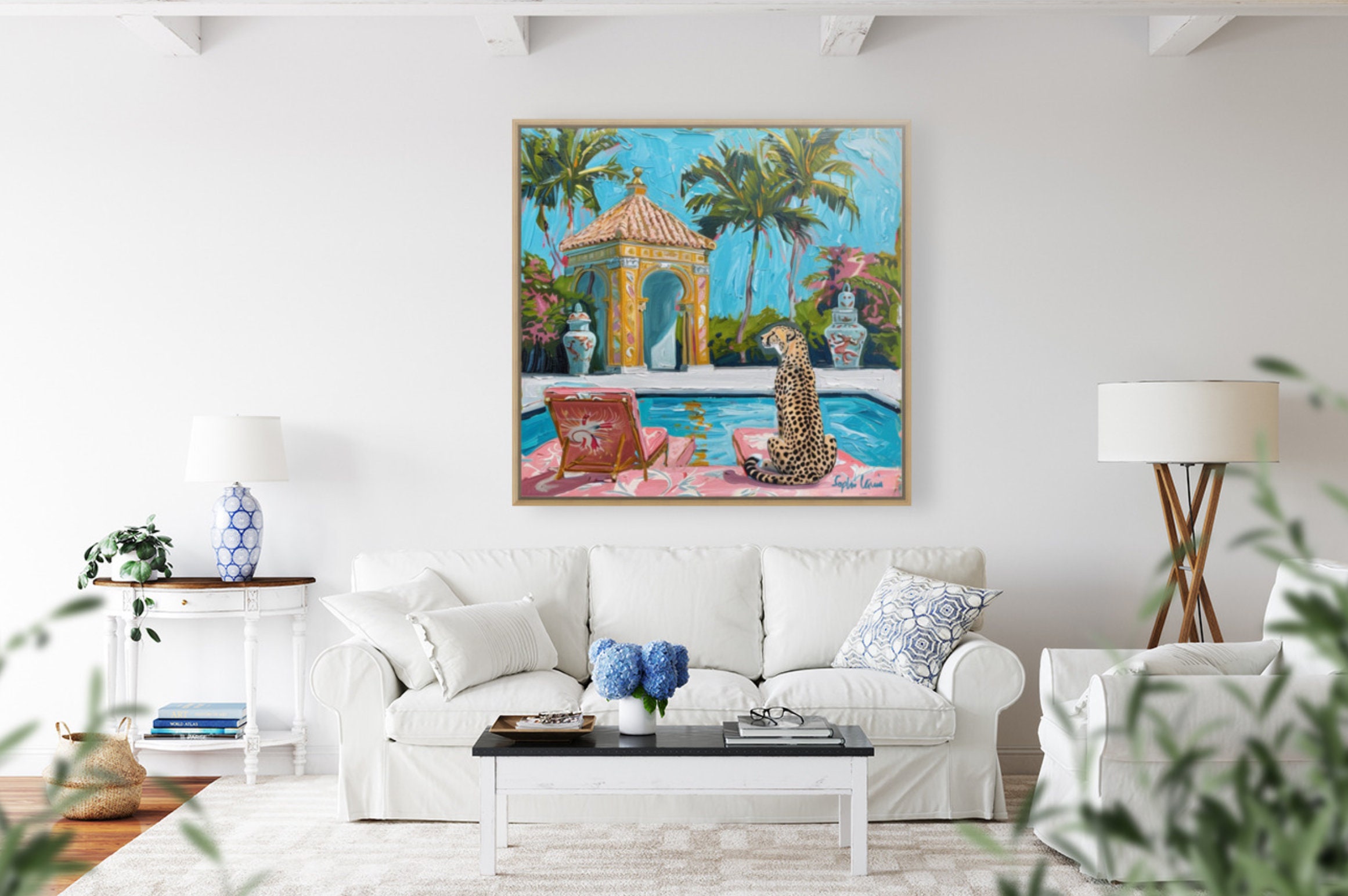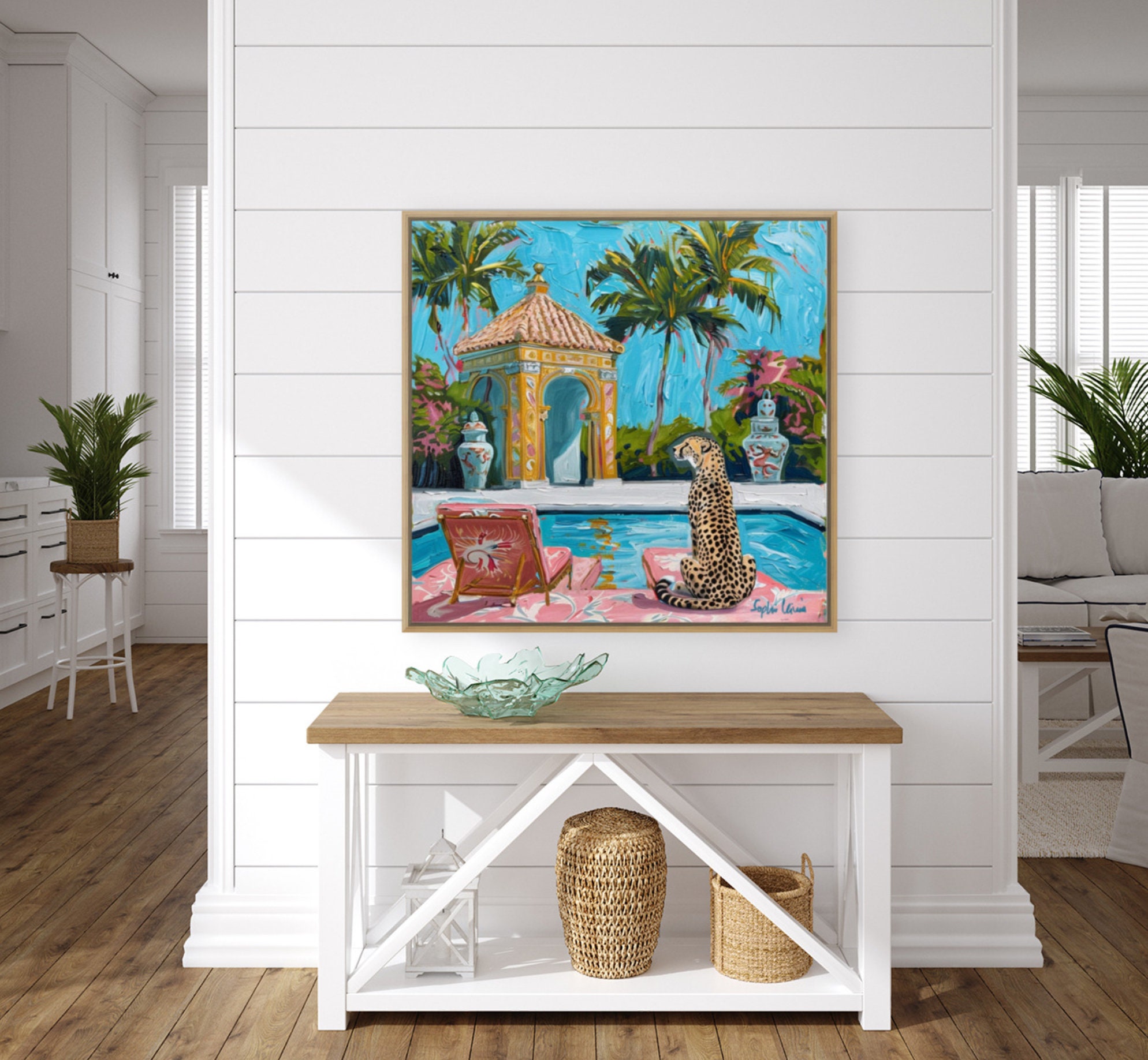 Grandmillennial art, Cheetah and yellow cabana, Palm Beach art