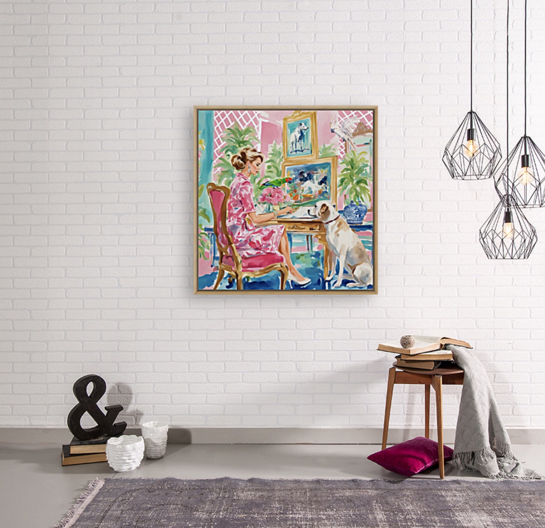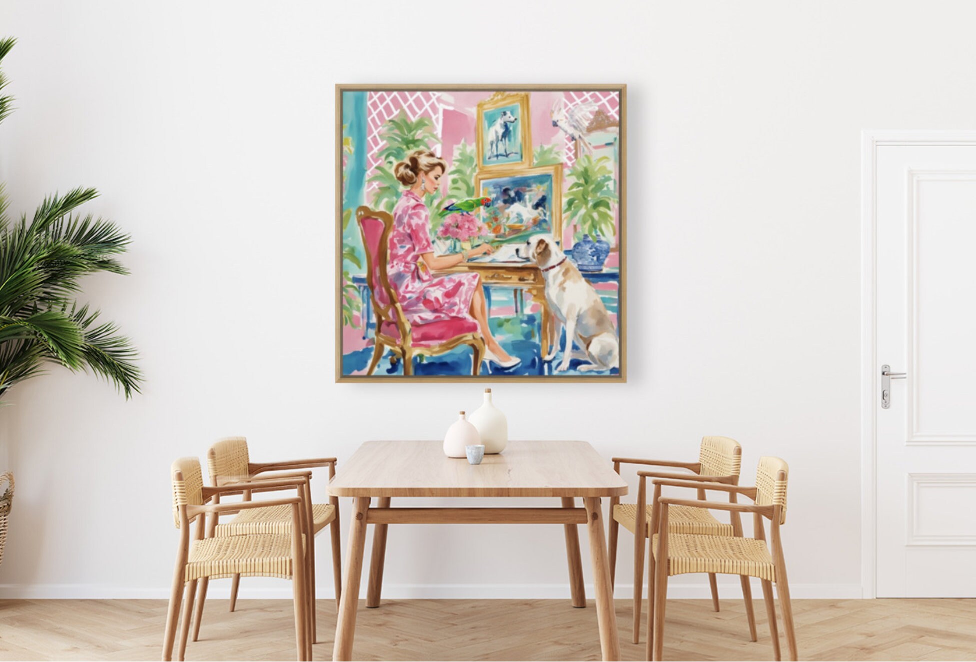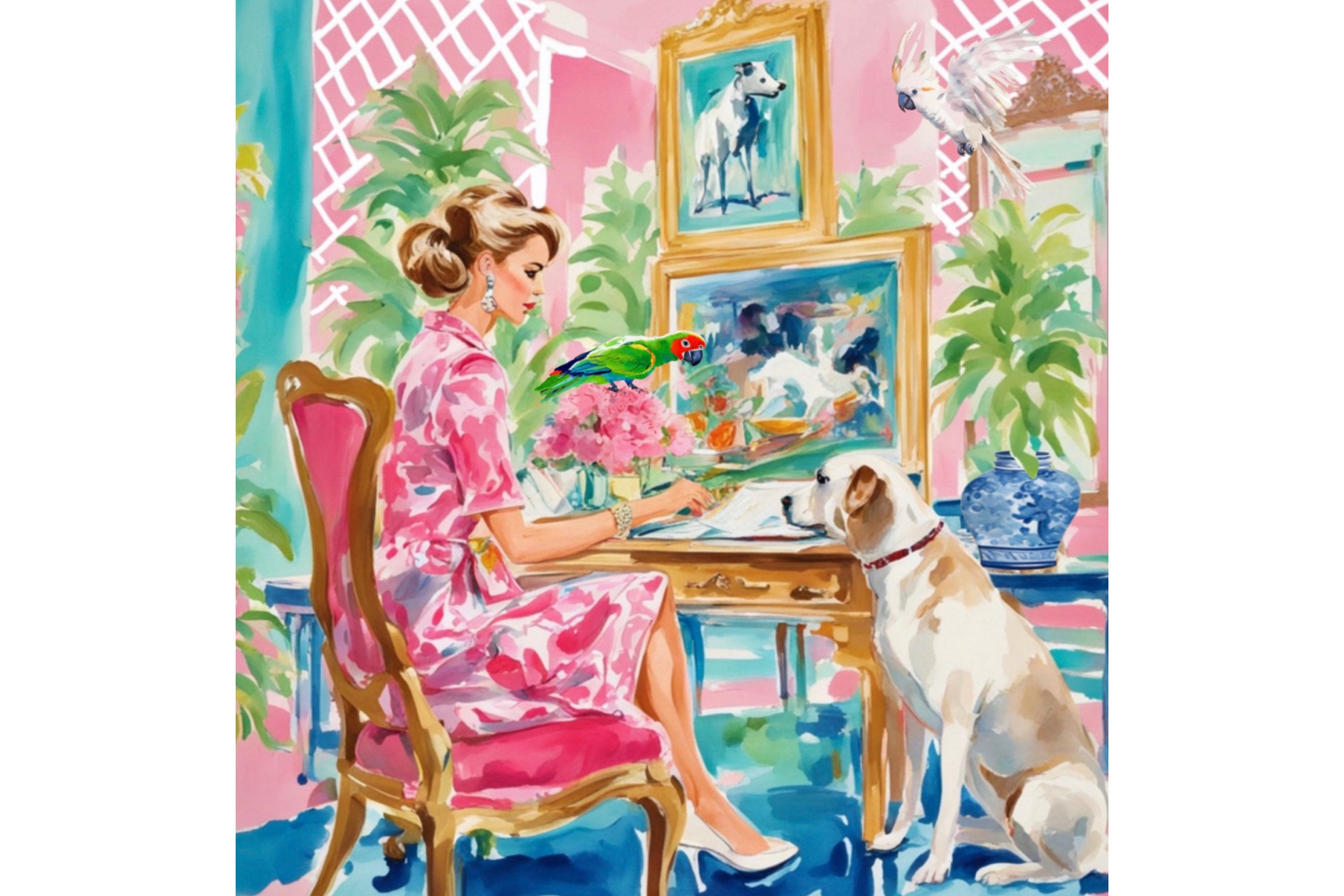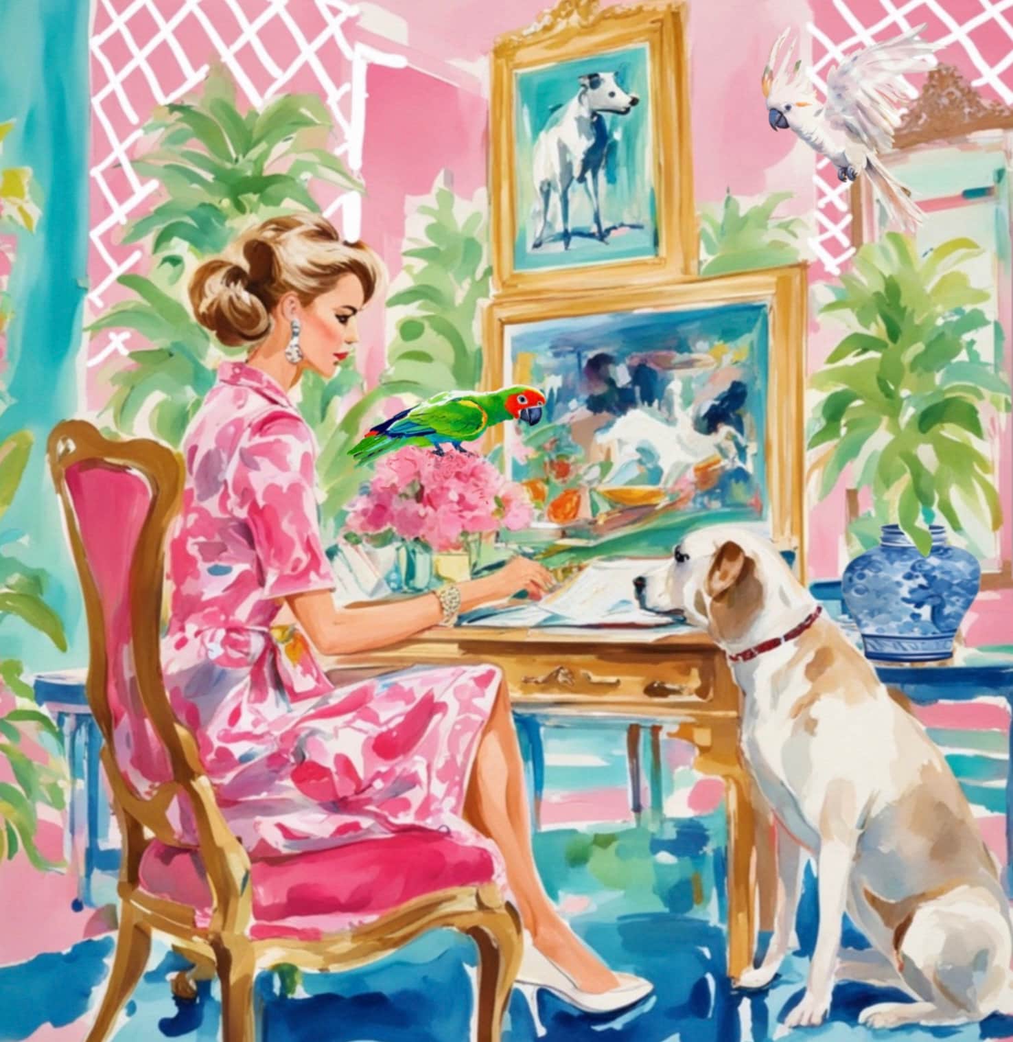 Grandmillennial art, The going ons in the pink room, preppy whimsical dog watercolor