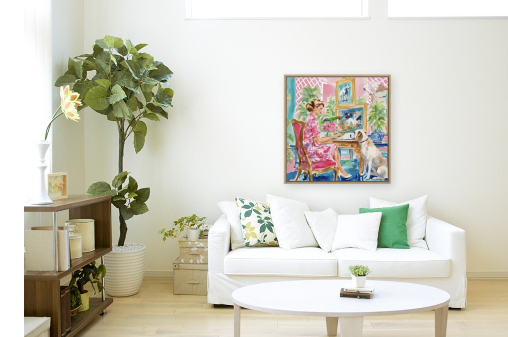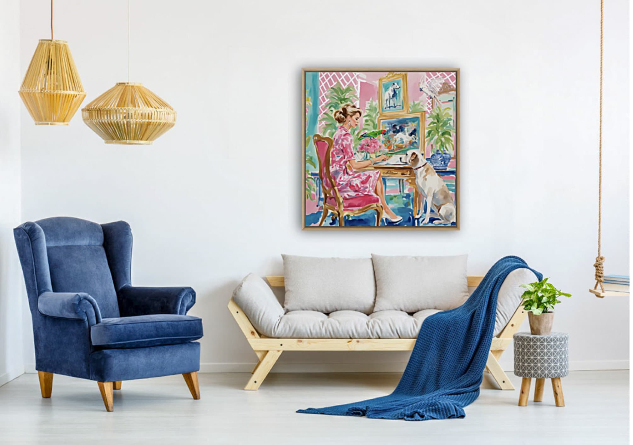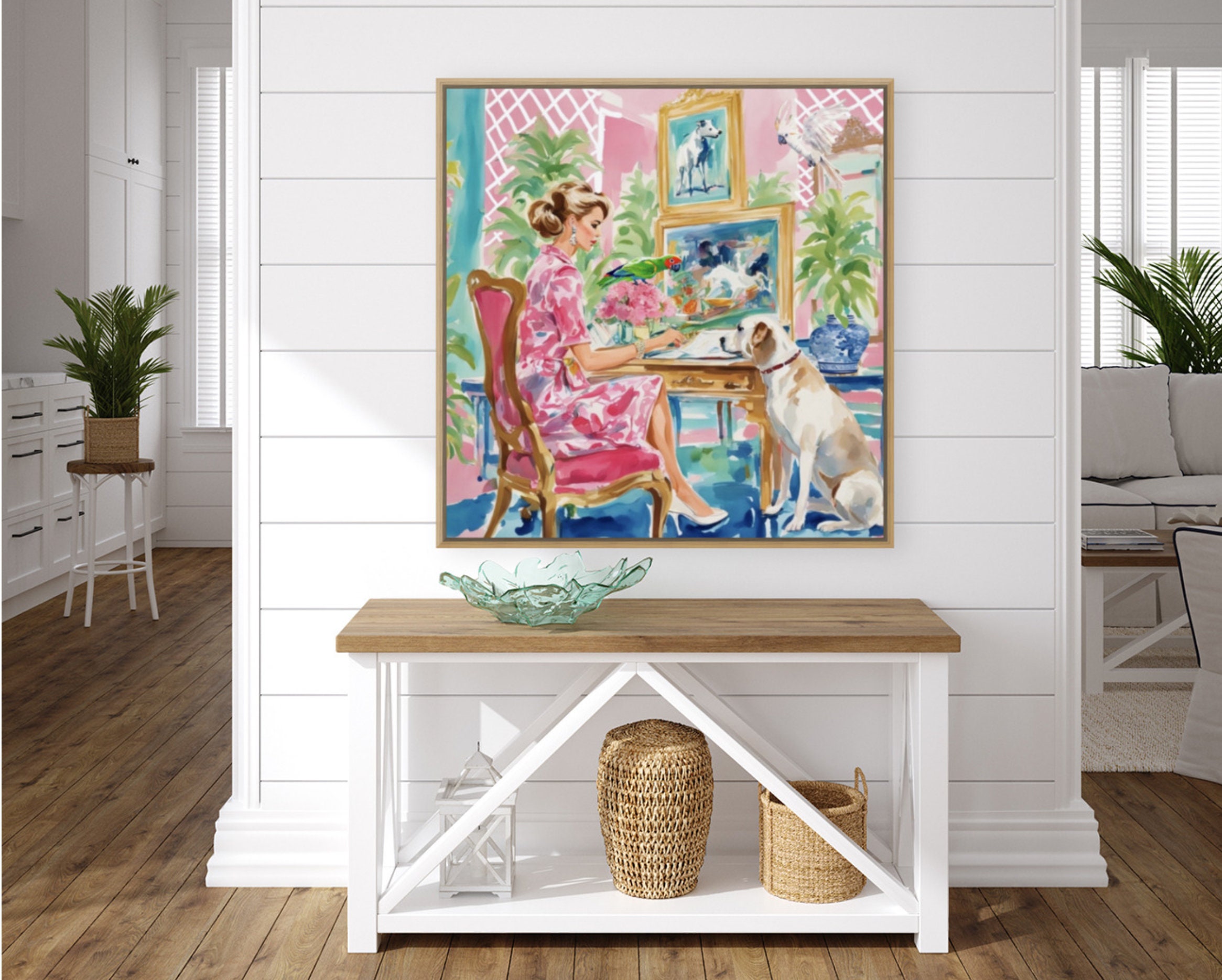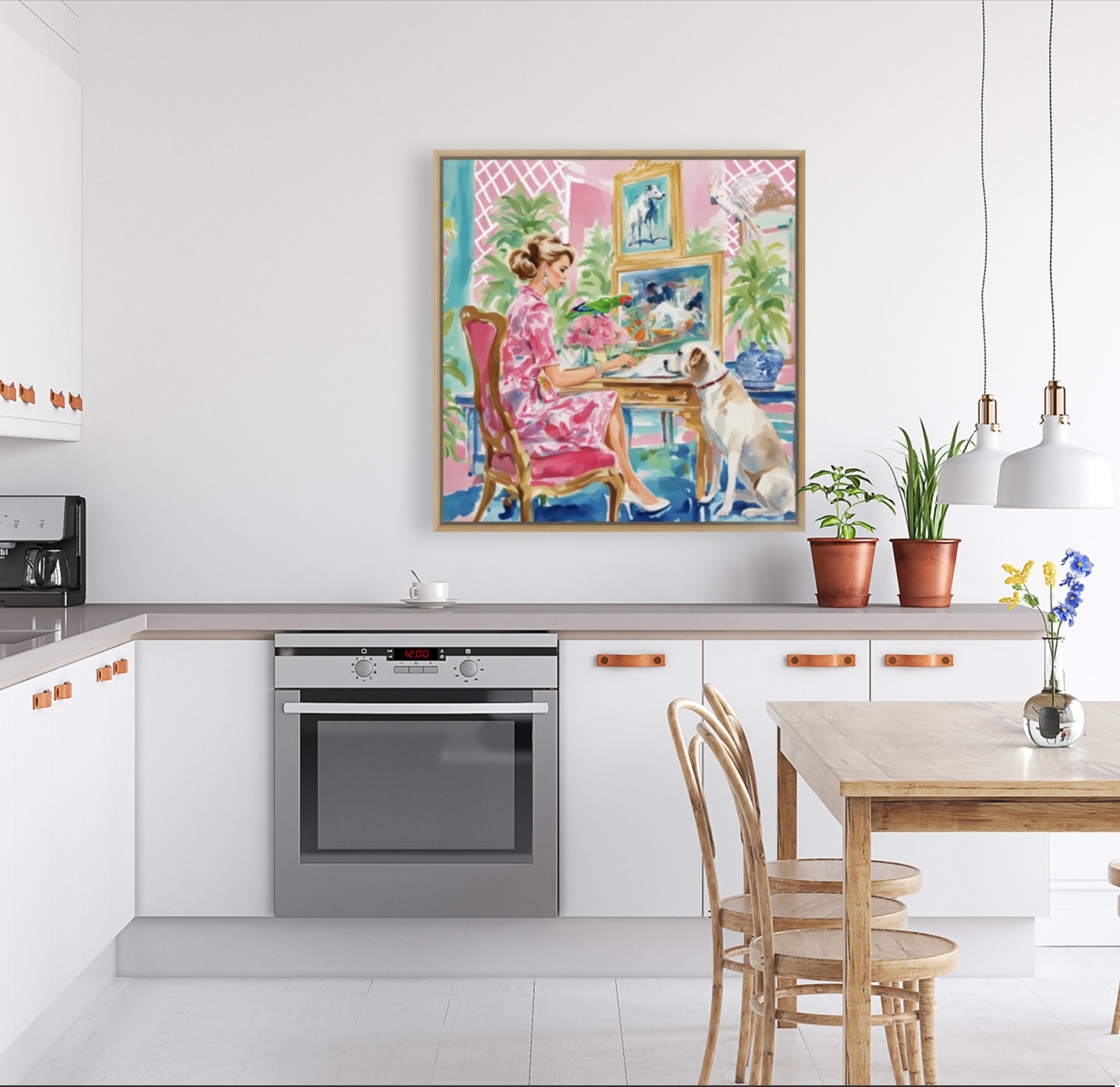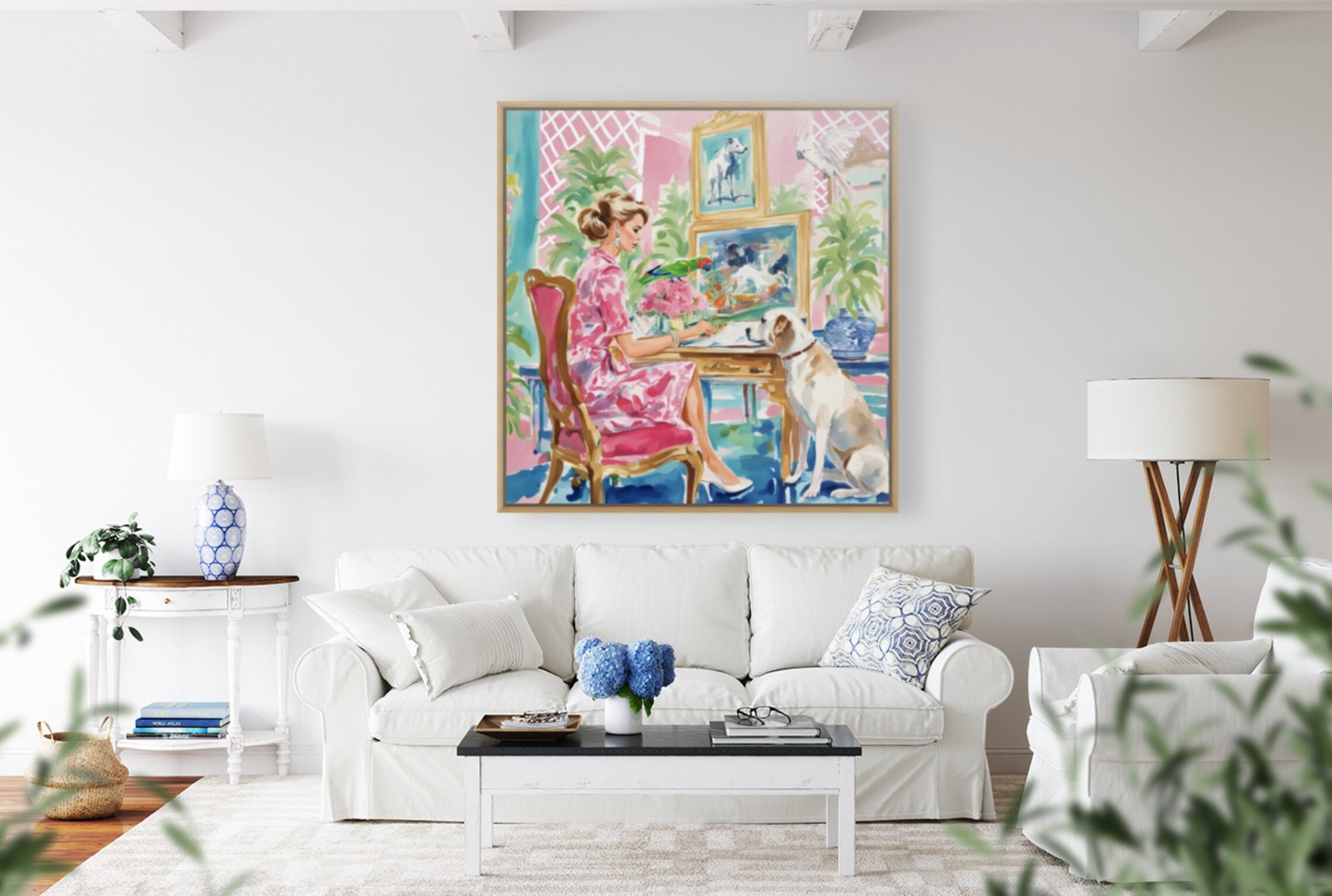 Grandmillennial art, The going ons in the pink room, preppy whimsical dog watercolor
