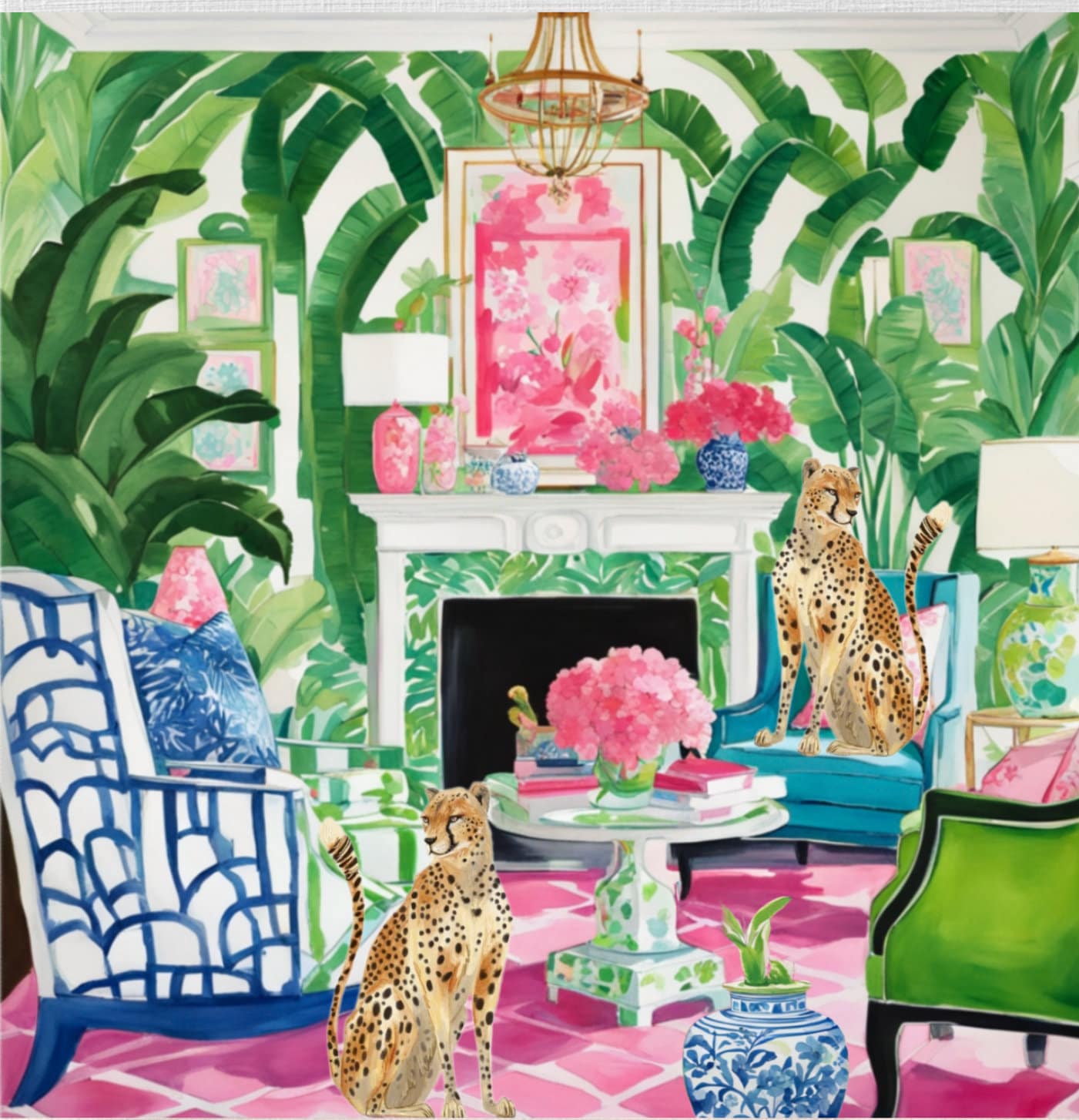 Grandmillennial art, Cheetahs in Palm Beach room, watercolor painting