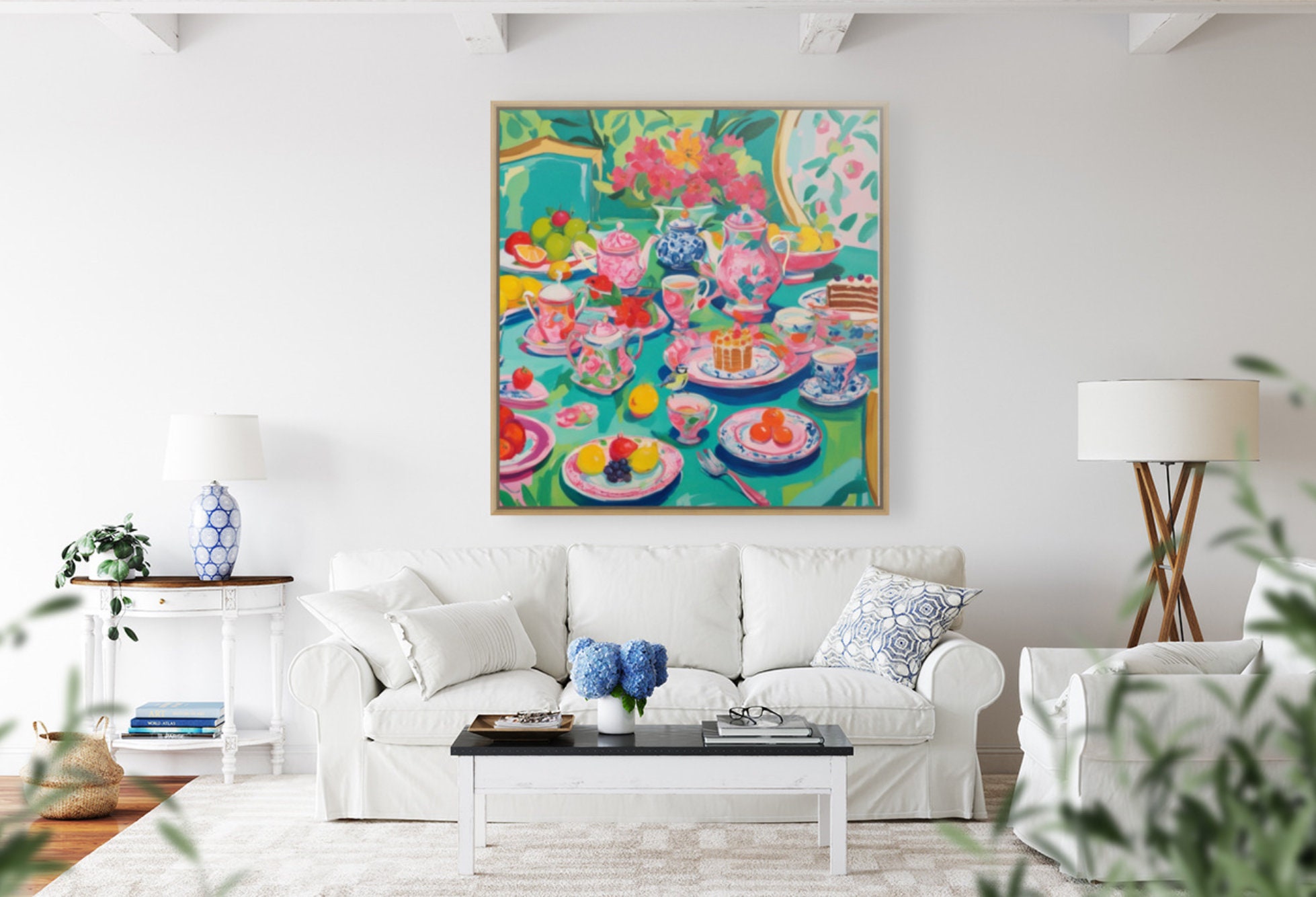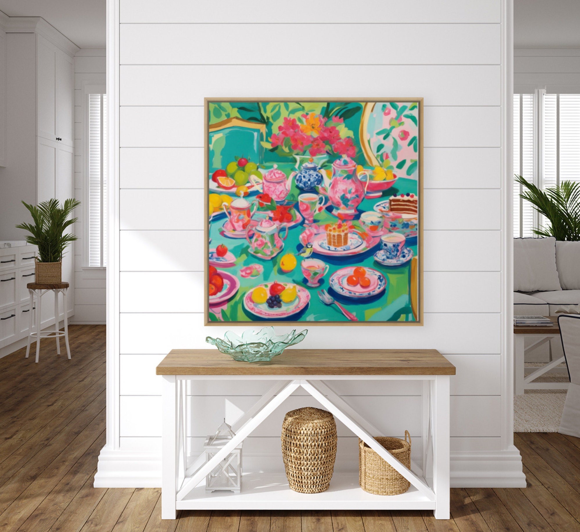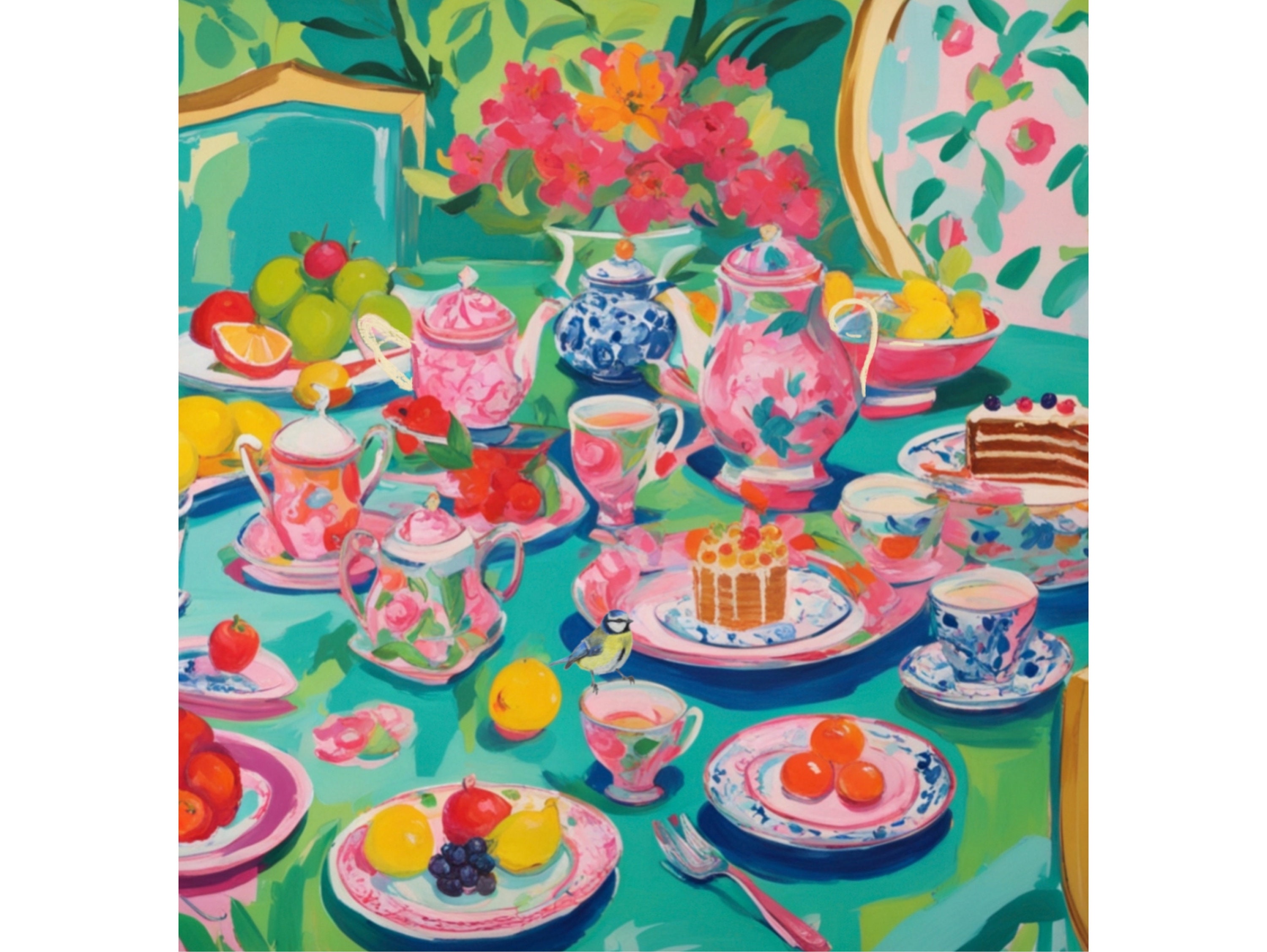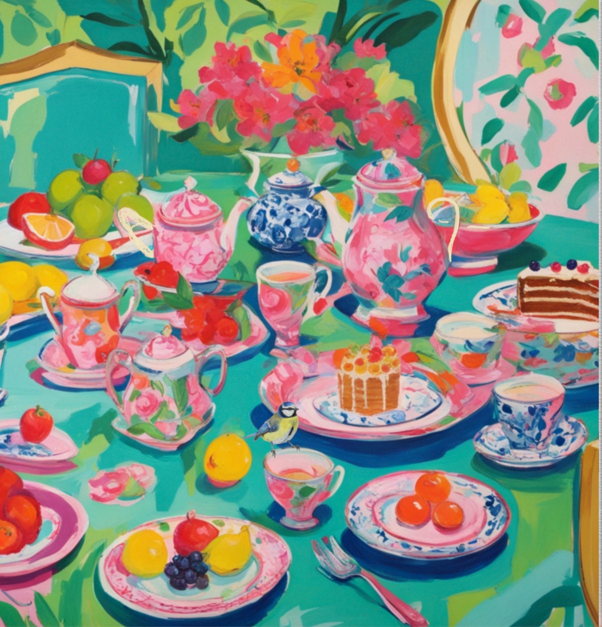 Grandmillennial art, Afternoon Tea in Turquoise, whimsical watercolor