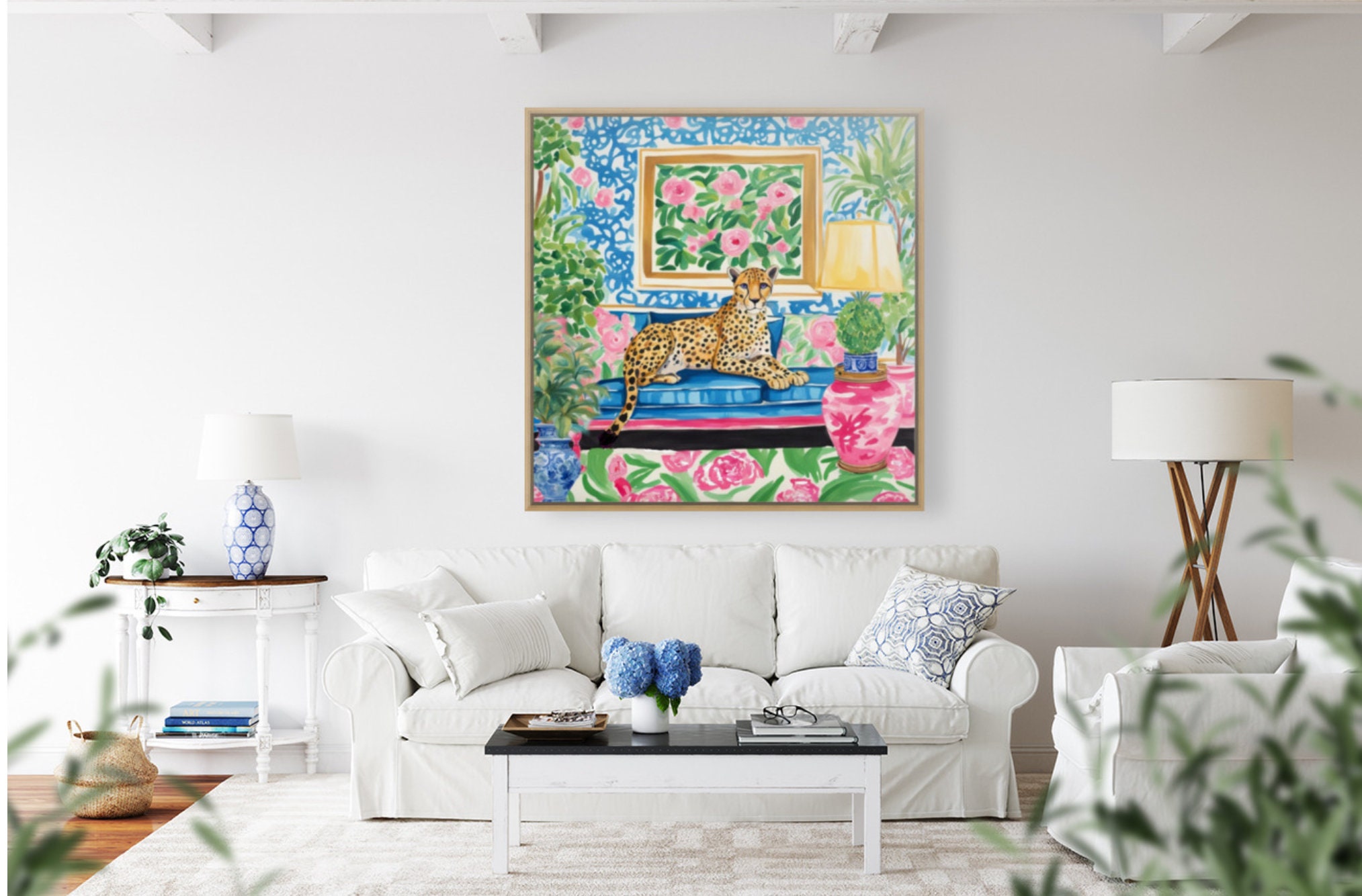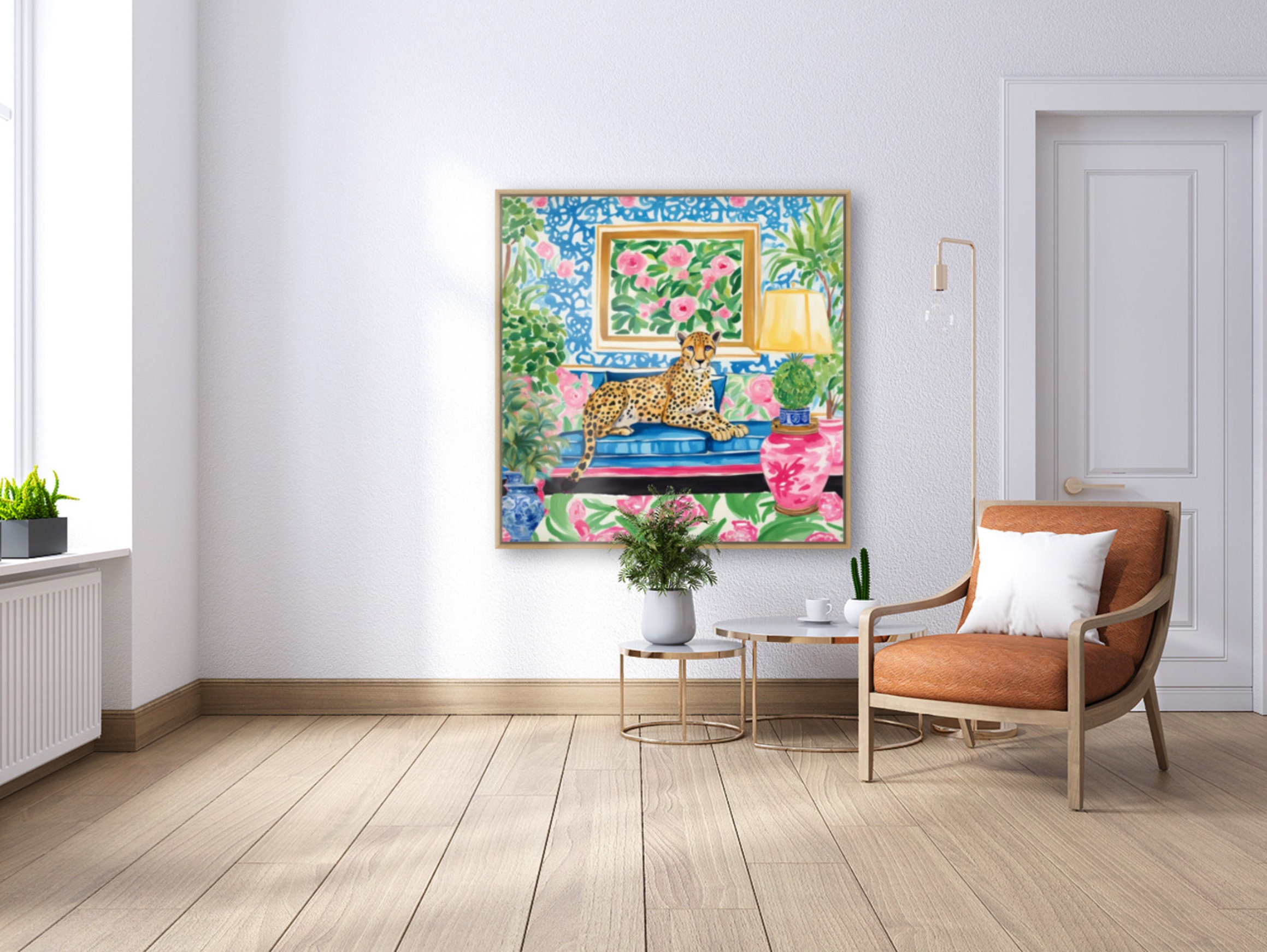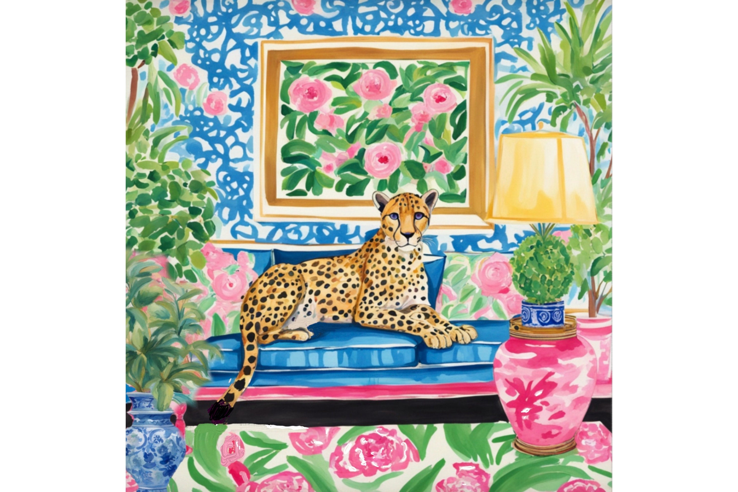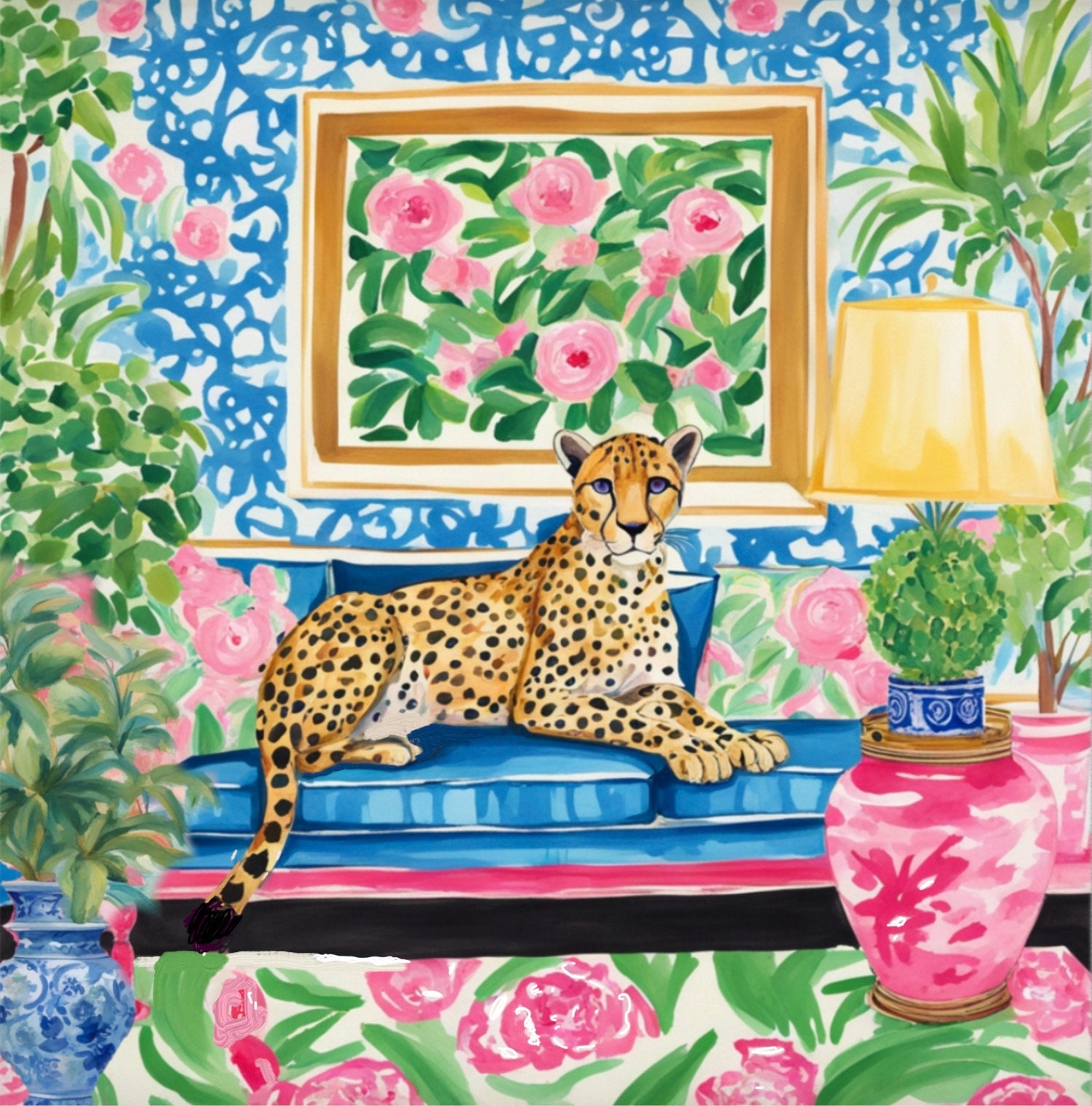 Grandmillennial art, Cheetah and pink flamingo in preppy chinoiserie interior, whimsical watercolor