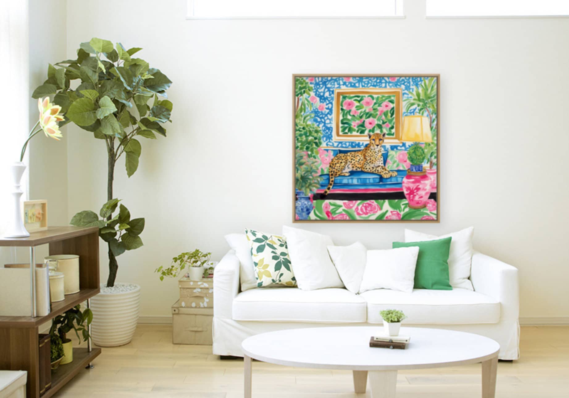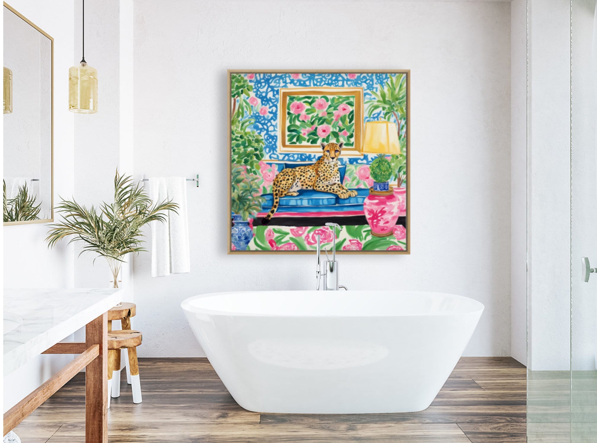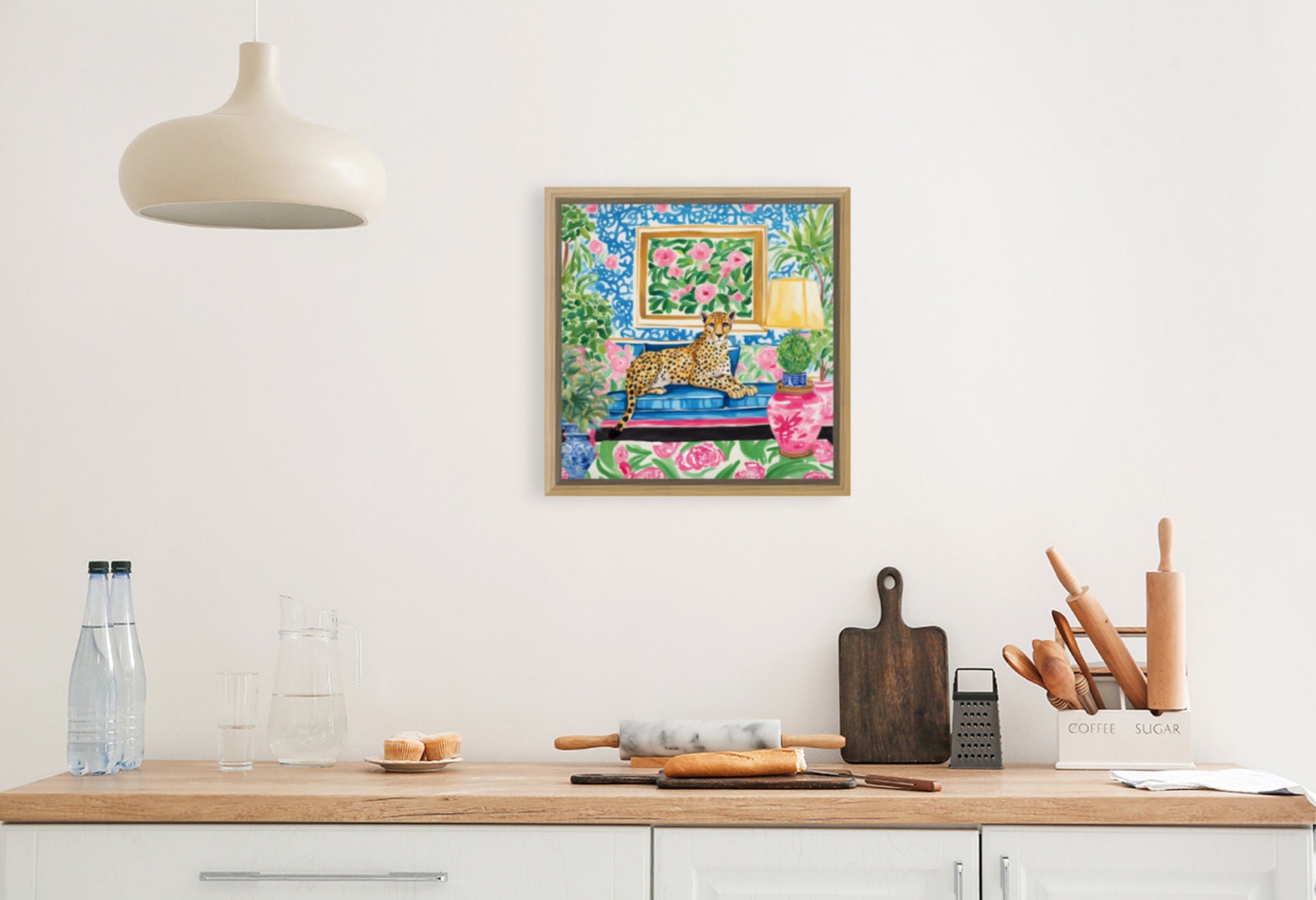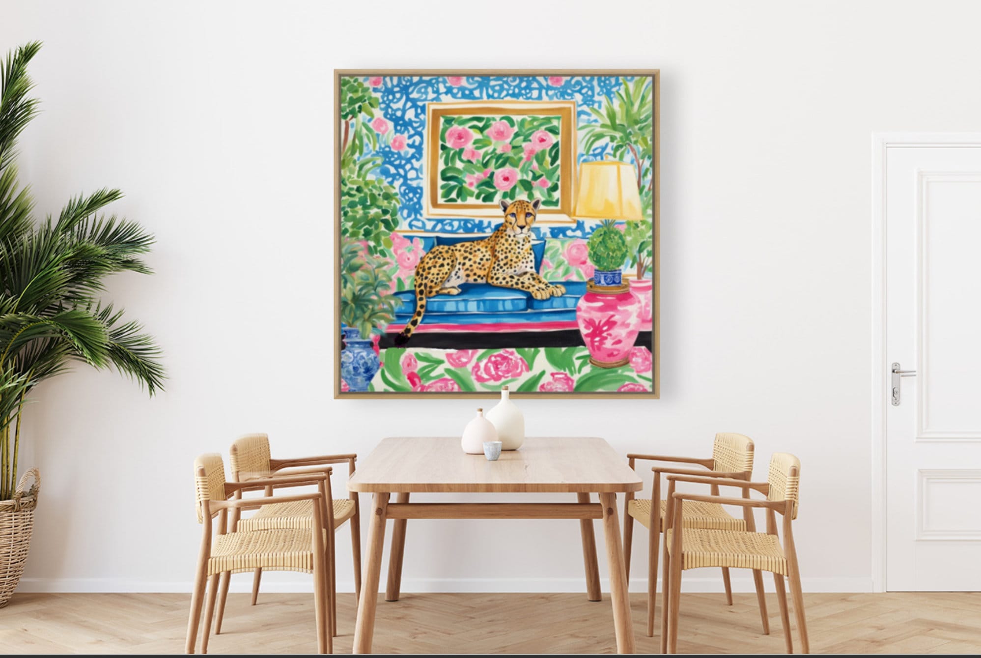 Grandmillennial art, Cheetah and pink flamingo in preppy chinoiserie interior, whimsical watercolor