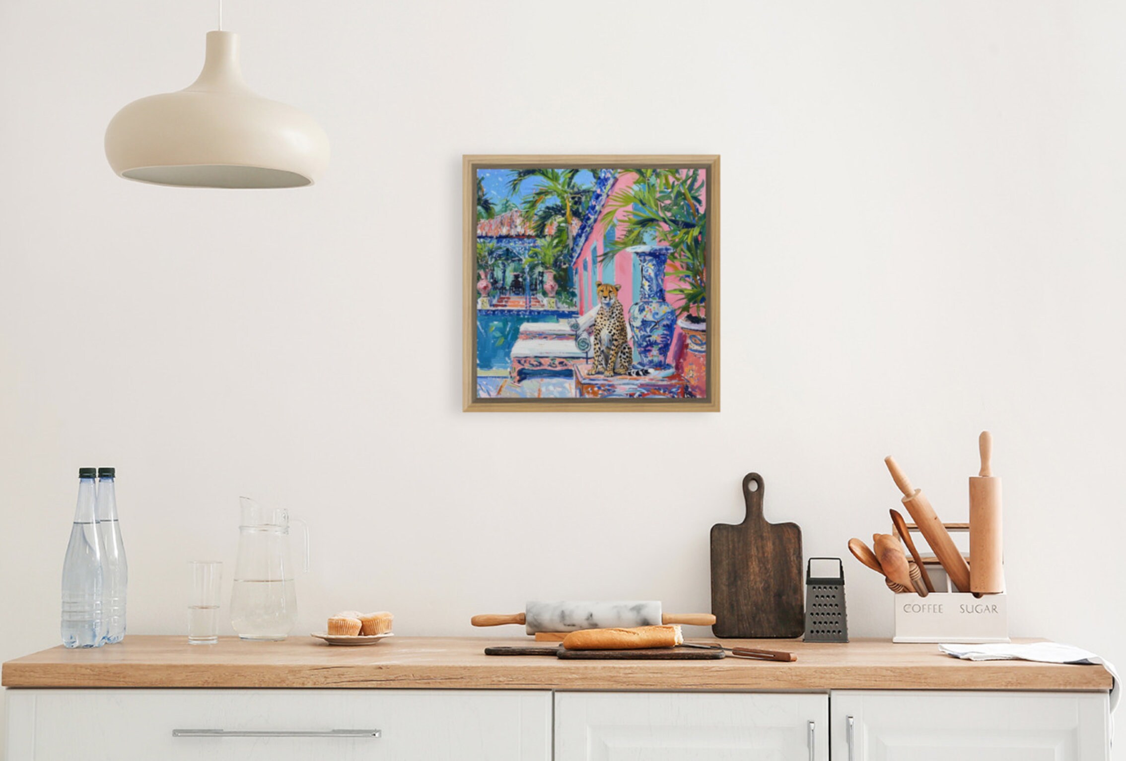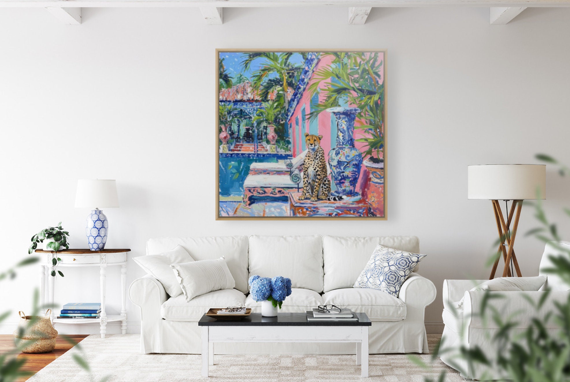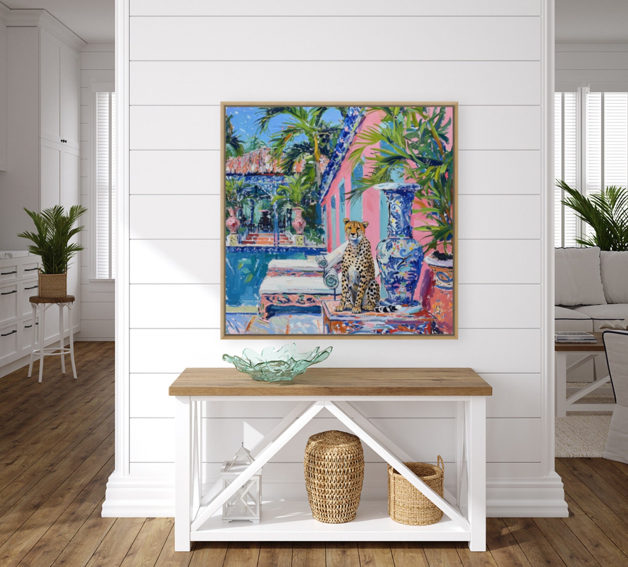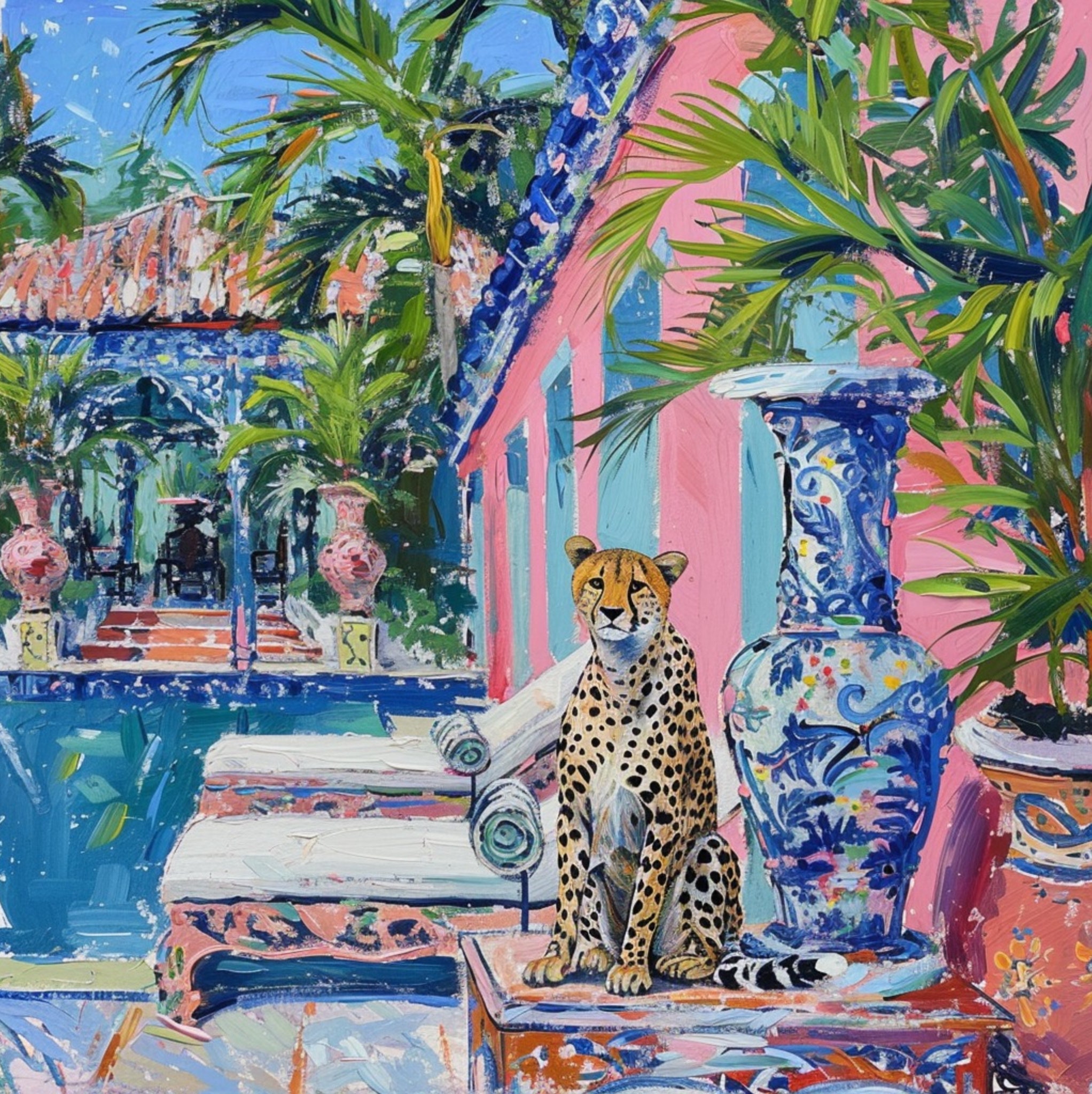 Preppy Cheetah near swimming pool in Palm Beach, whimsical watercolor