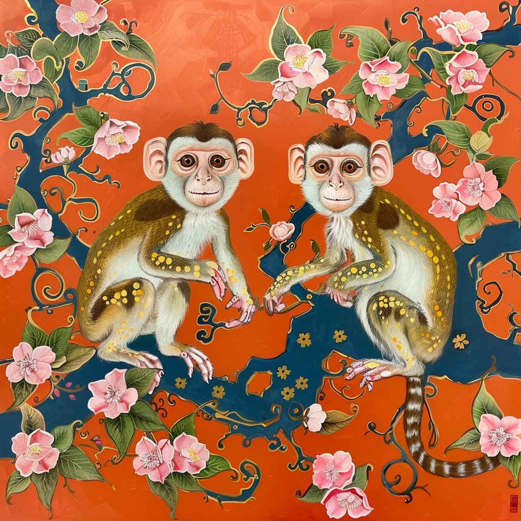 Sophie's art is the modern interpretation of Chinese artistic traditions featuring pagodas, landscapes, blue and white porcelain, ginger jars, pagodas, cheetahs and monkeys. Sophie developed her own recognizable style with bright colors and whimsical details.