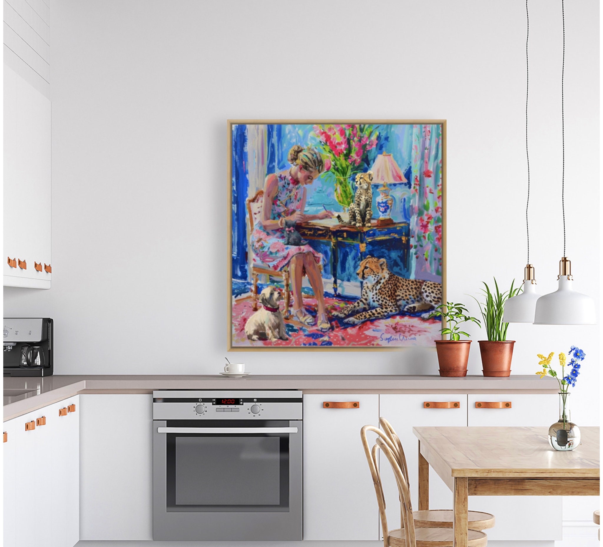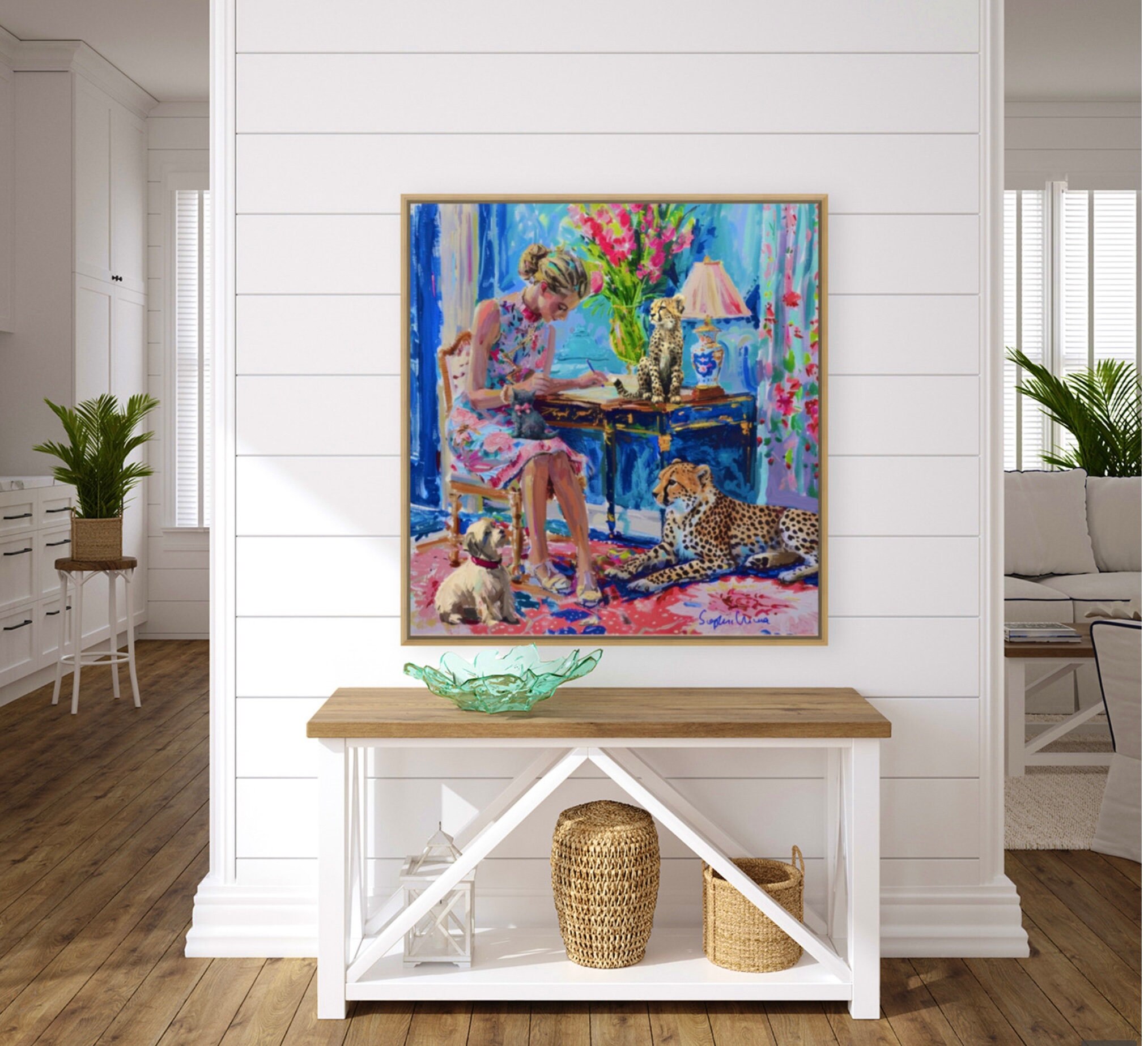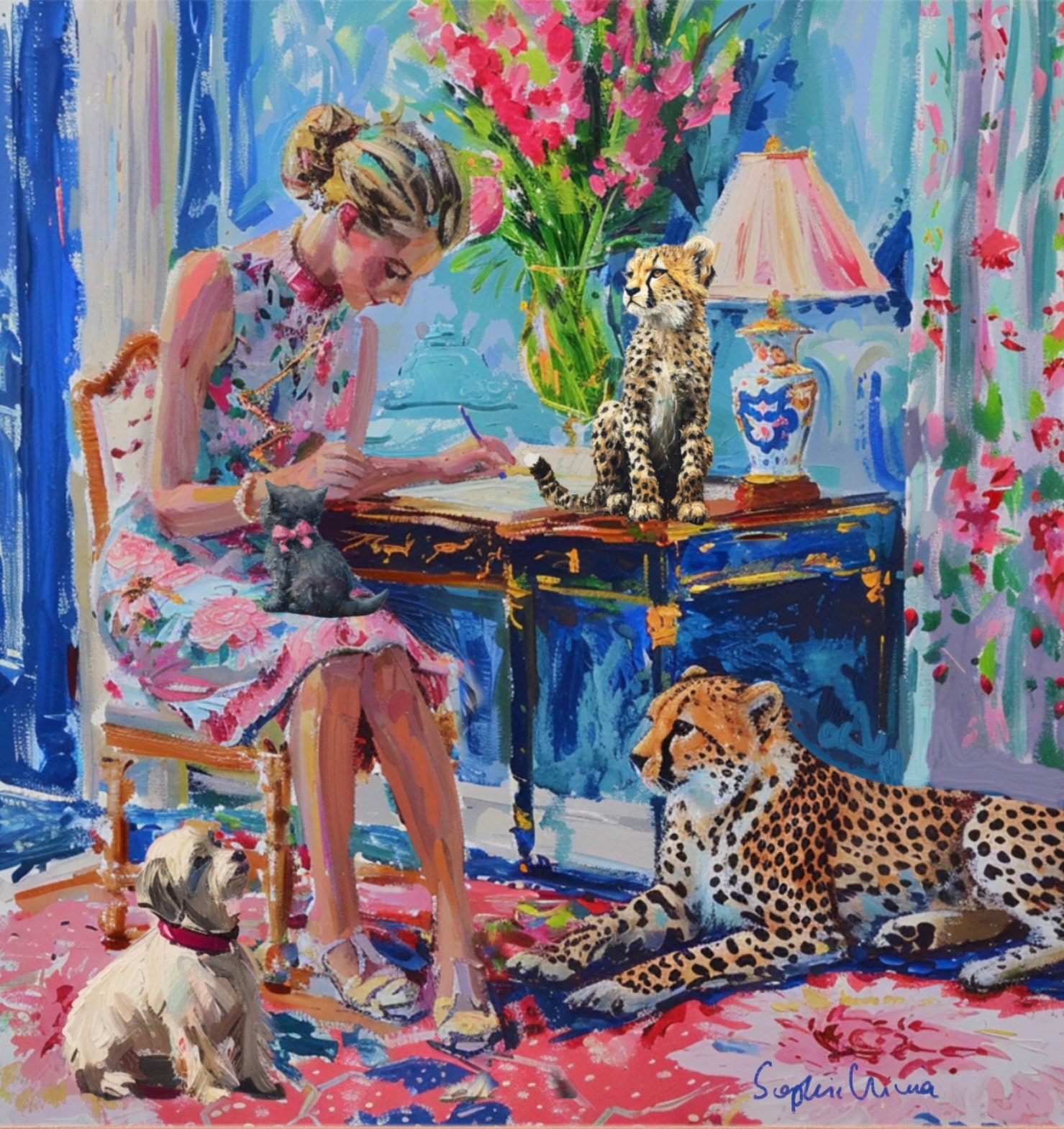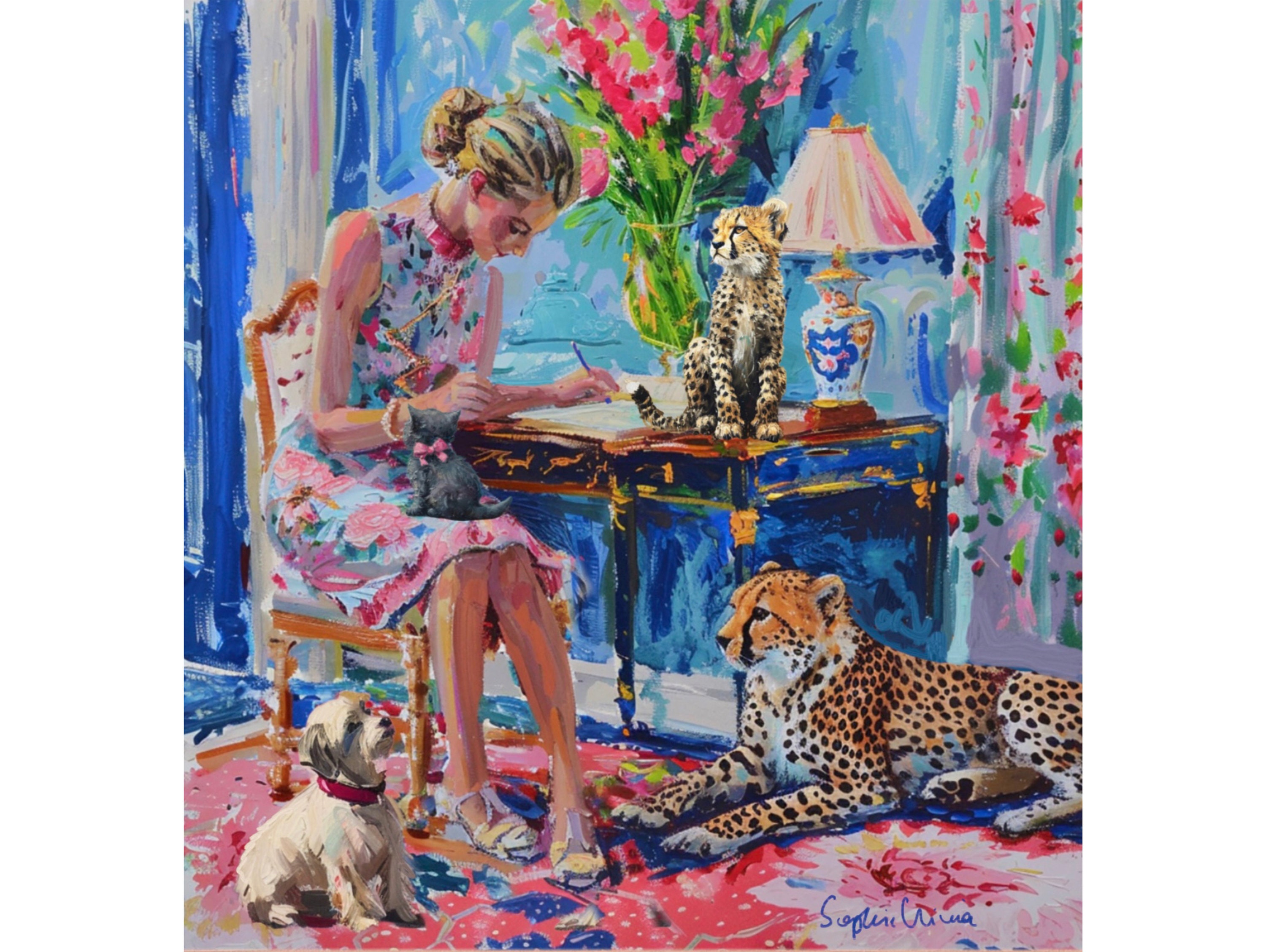 Sophie's art is the modern interpretation of Chinese artistic traditions featuring pagodas, landscapes, blue and white porcelain, ginger jars, pagodas, cheetahs and monkeys. Sophie developed her own recognizable style with bright colors and whimsical details.