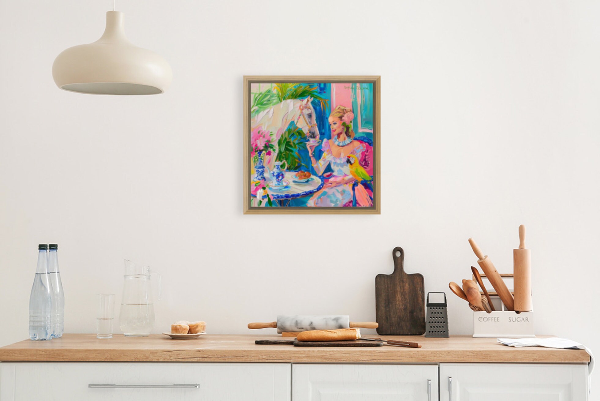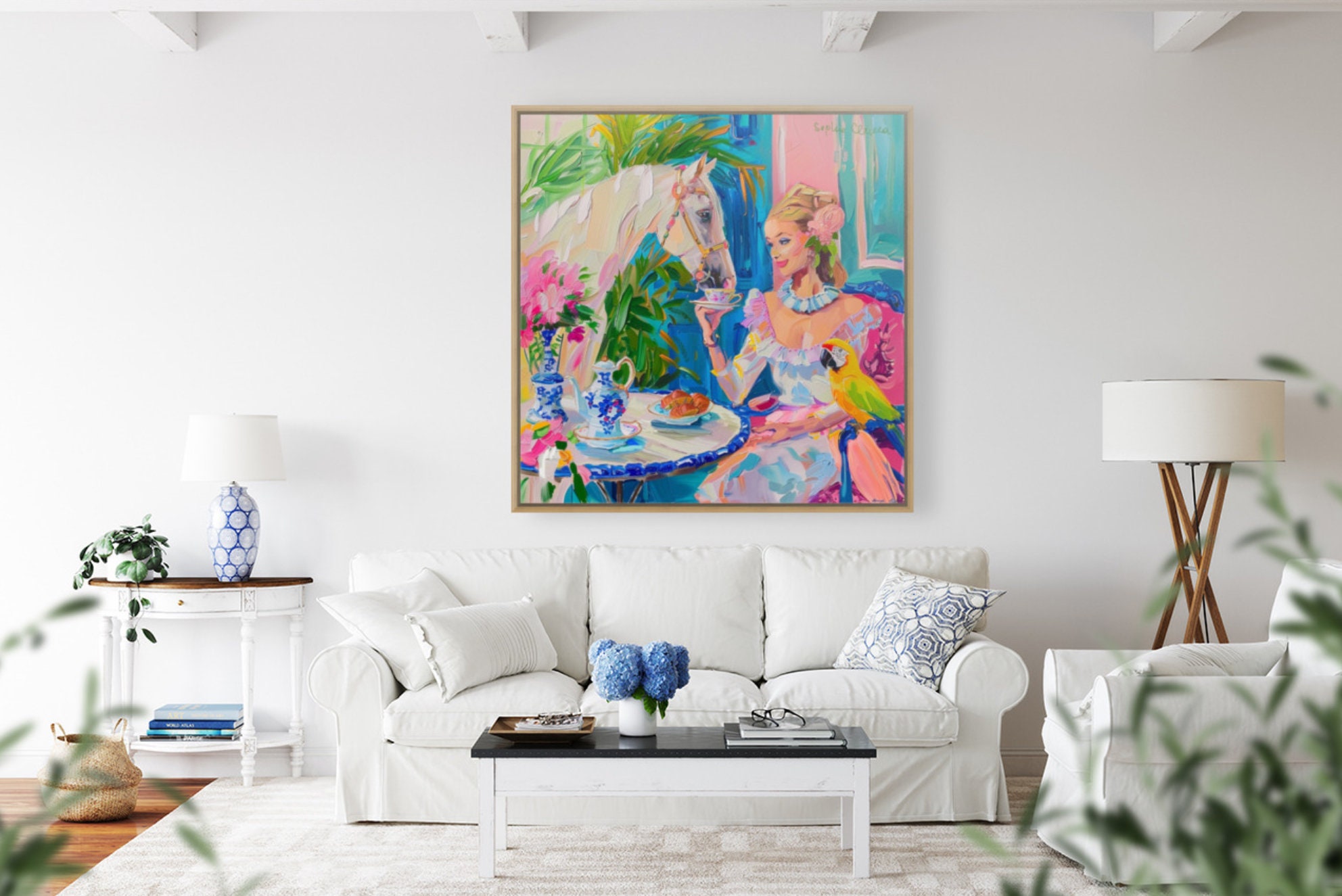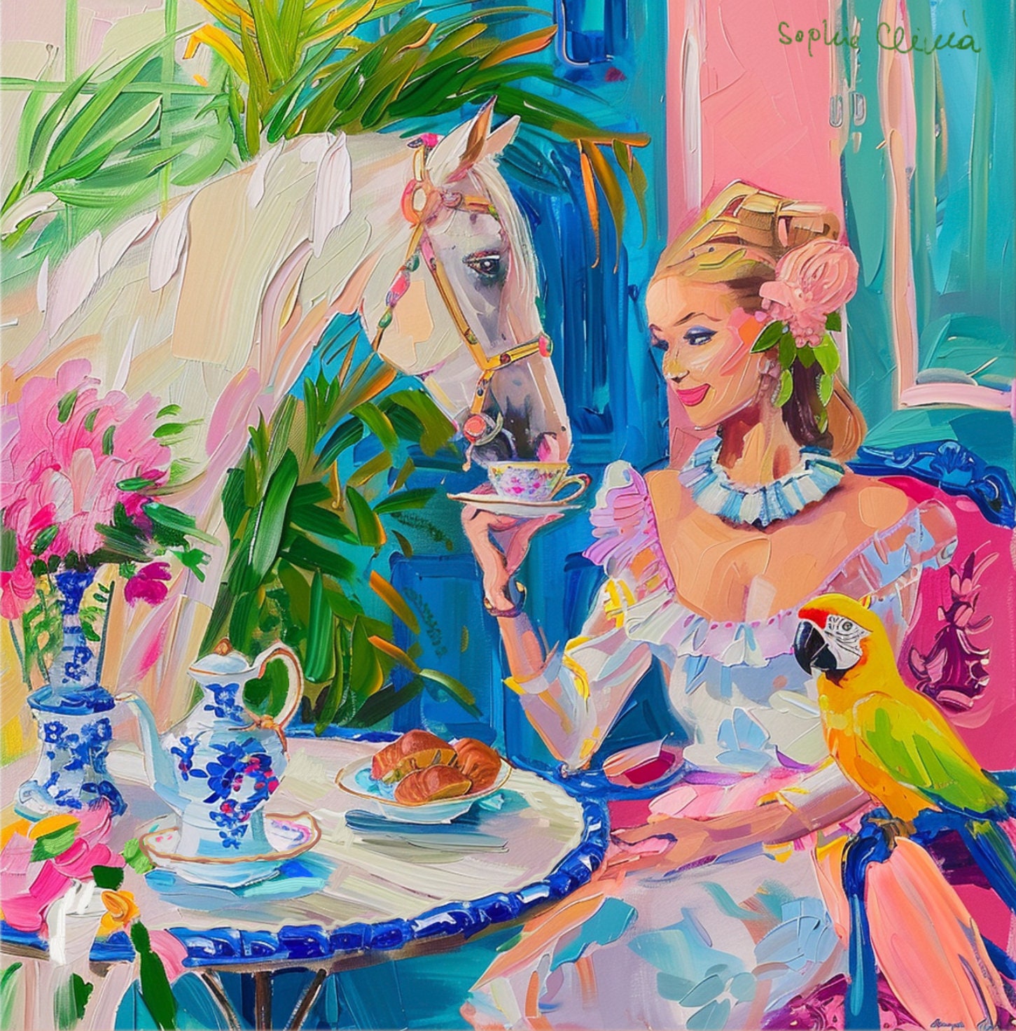 Grandmillennial art, Tea with a White Horse, oil painting