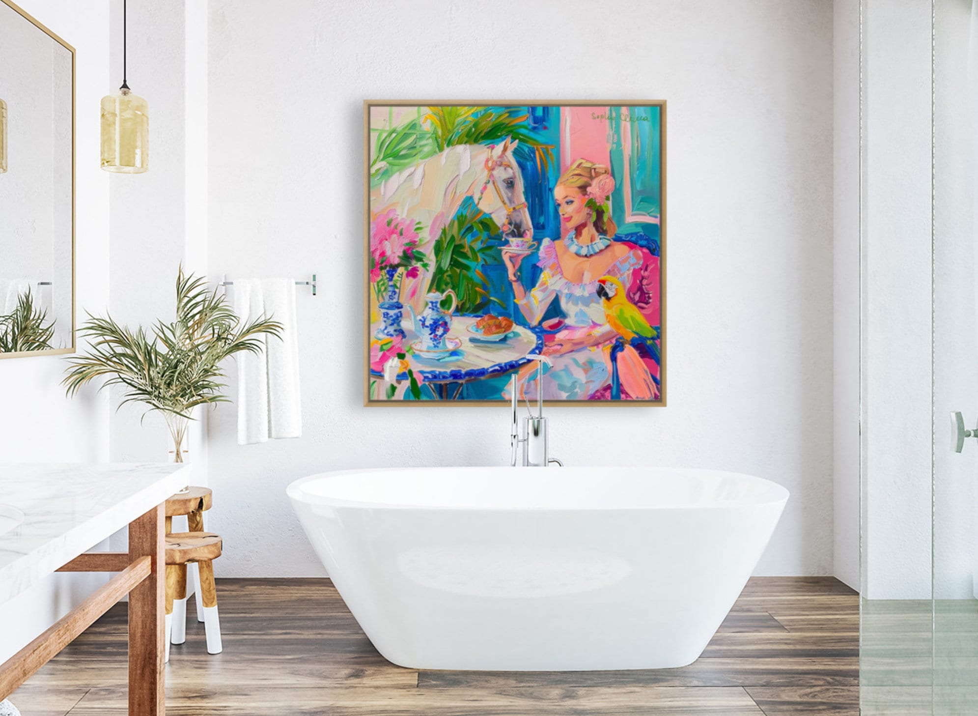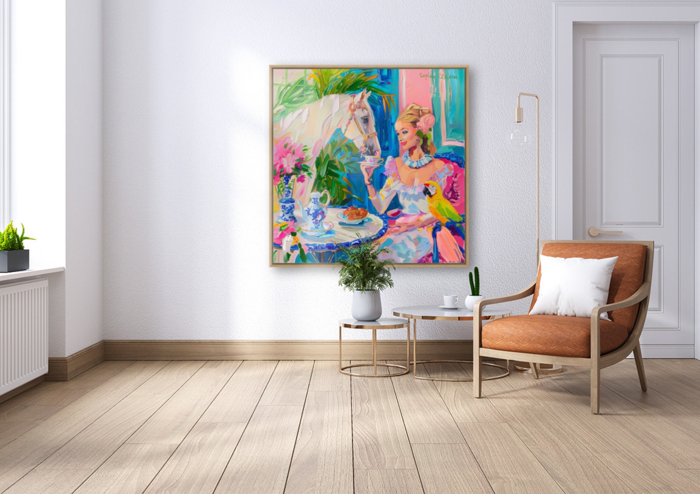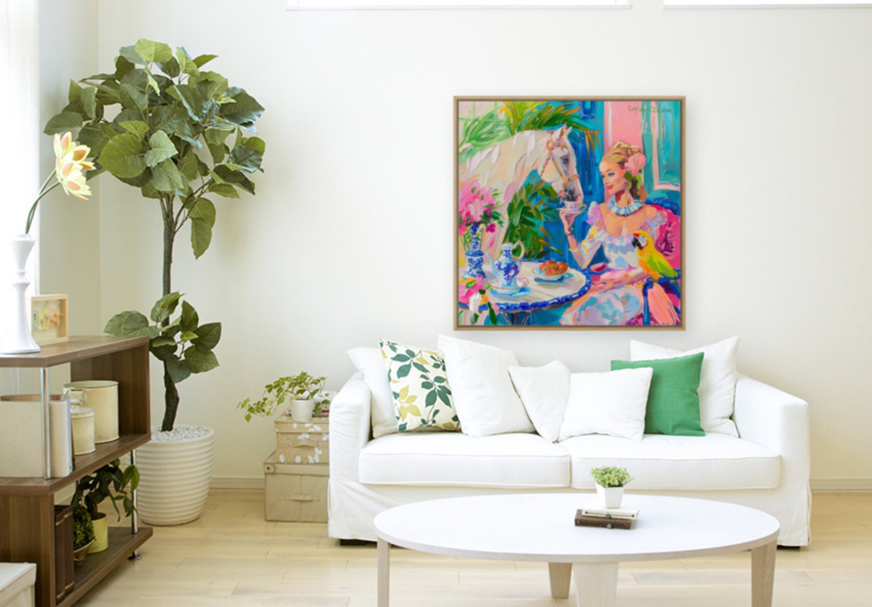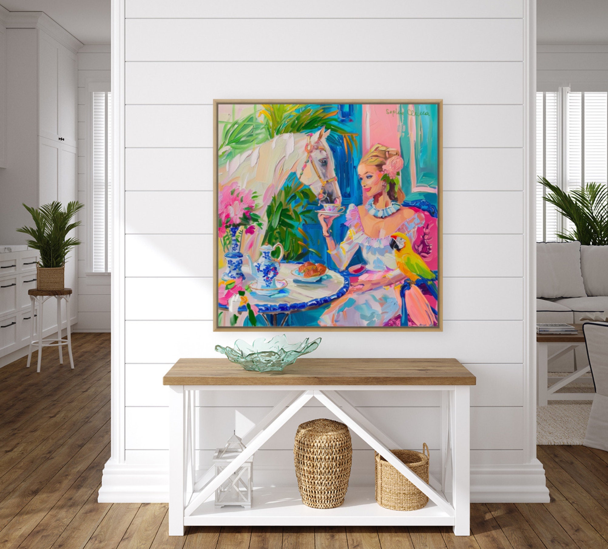 Grandmillennial art, Tea with a White Horse, oil painting