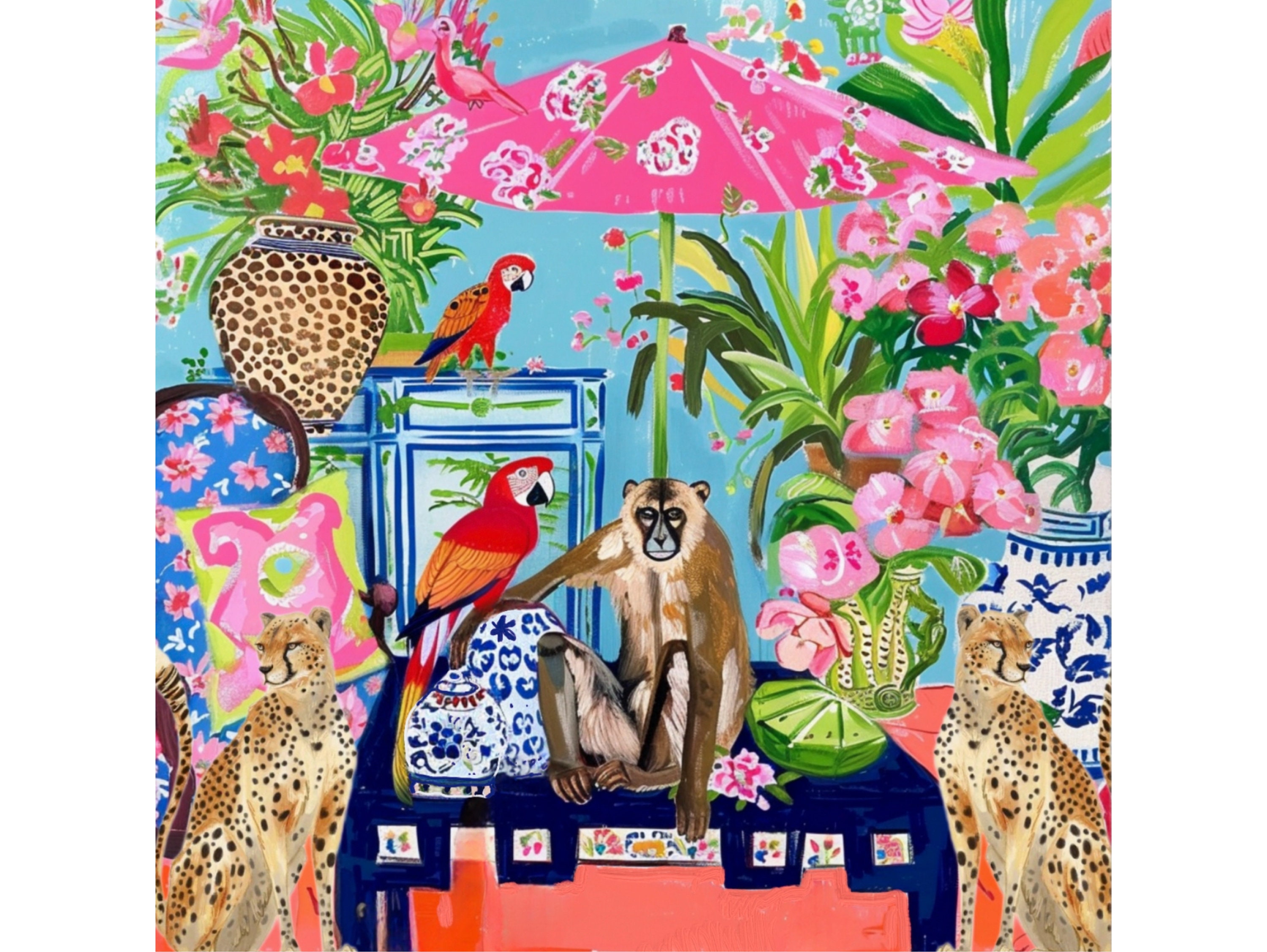 Sophie's art is the modern interpretation of Chinese artistic traditions featuring pagodas, landscapes, blue and white porcelain, ginger jars, pagodas, cheetahs and monkeys. Sophie developed her own recognizable style with bright colors and whimsical details.