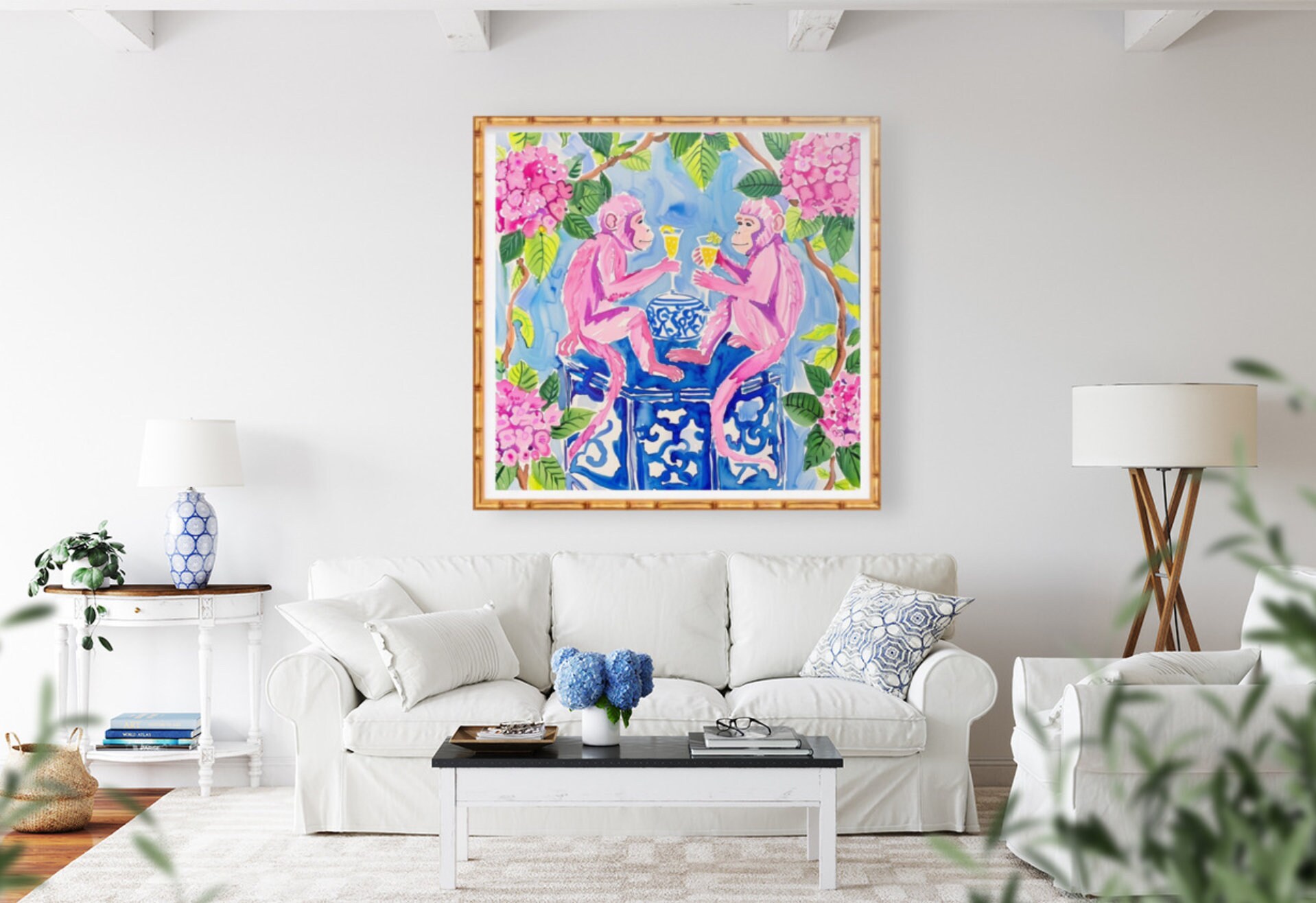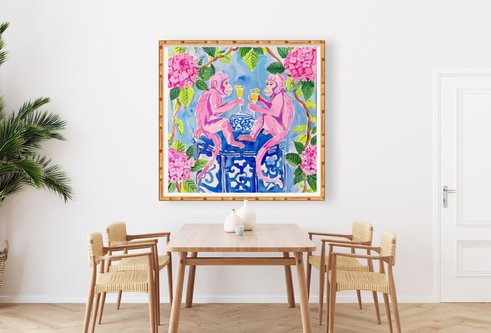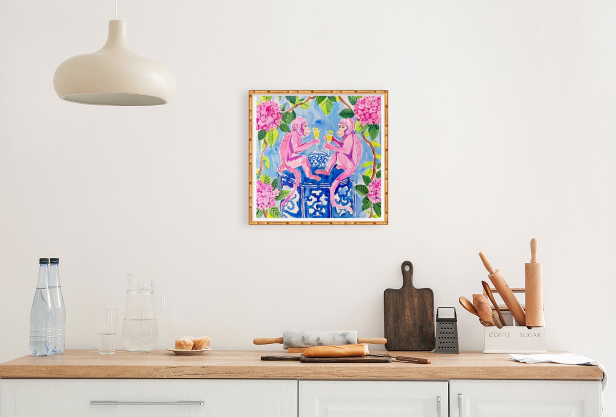 Grandmillennial art, Monkeys drinking cocktail in chinoiserie garden art print