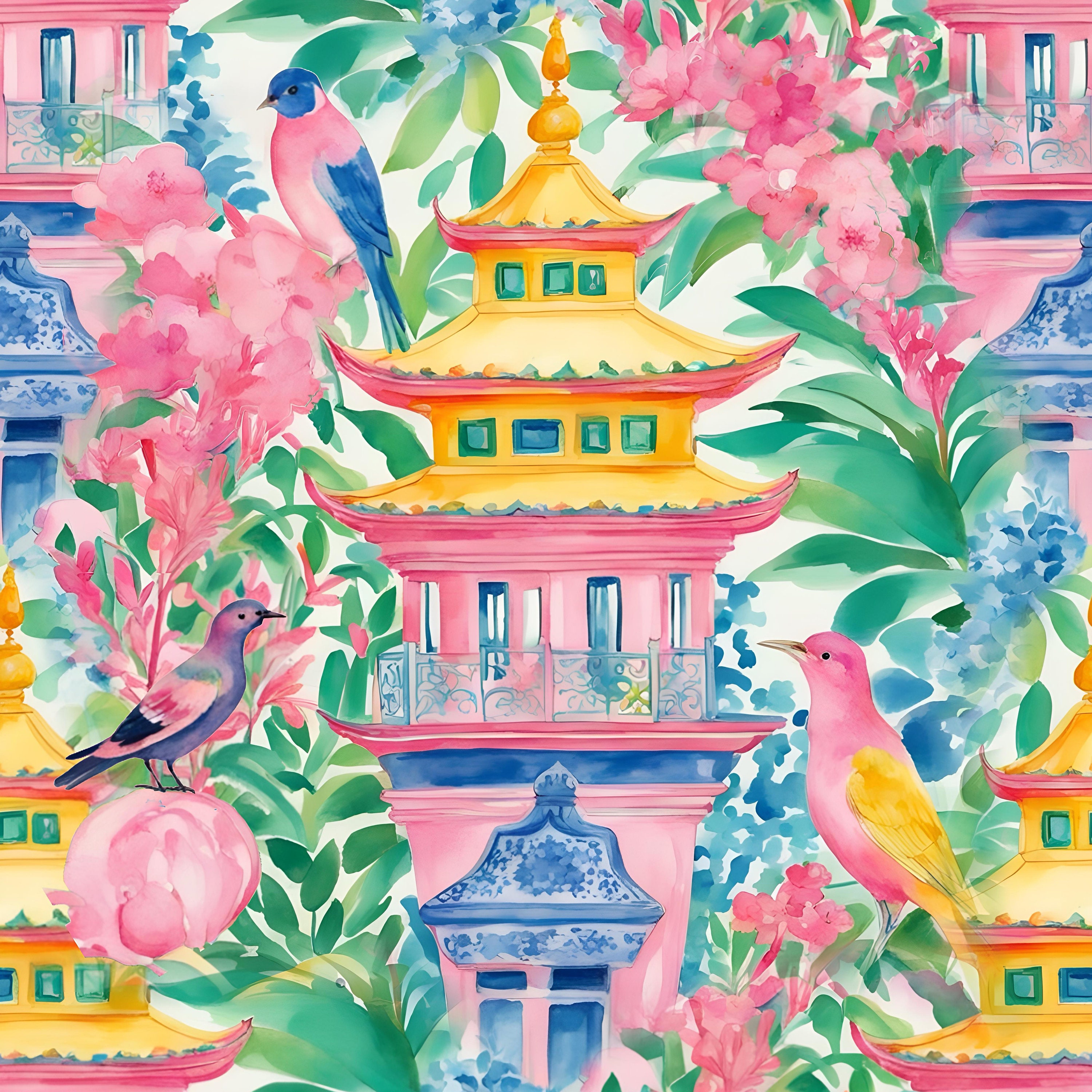 Birds of Paradise Chinoiserie Print: Preppy Pagoda Garden Watercolor