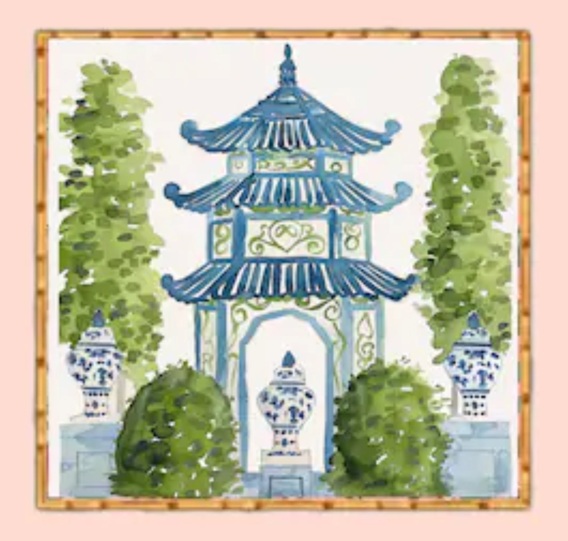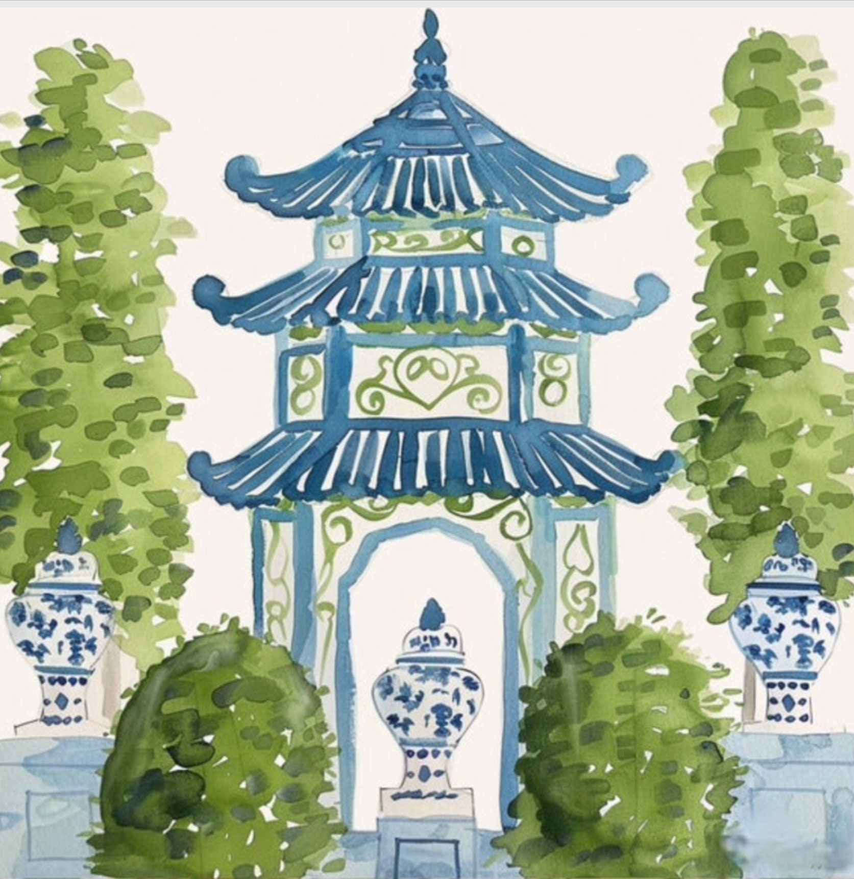 Grandmillennial art, Chinoiserie pagoda garden 2 art print