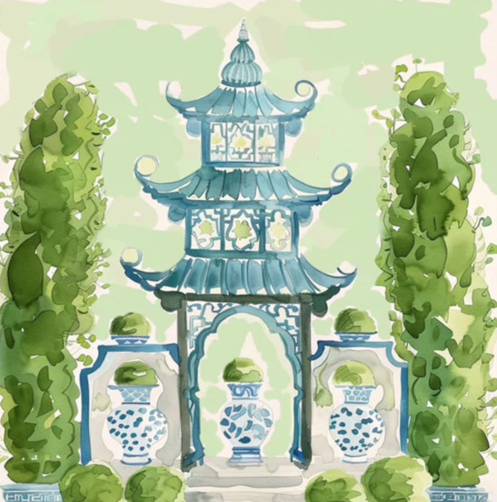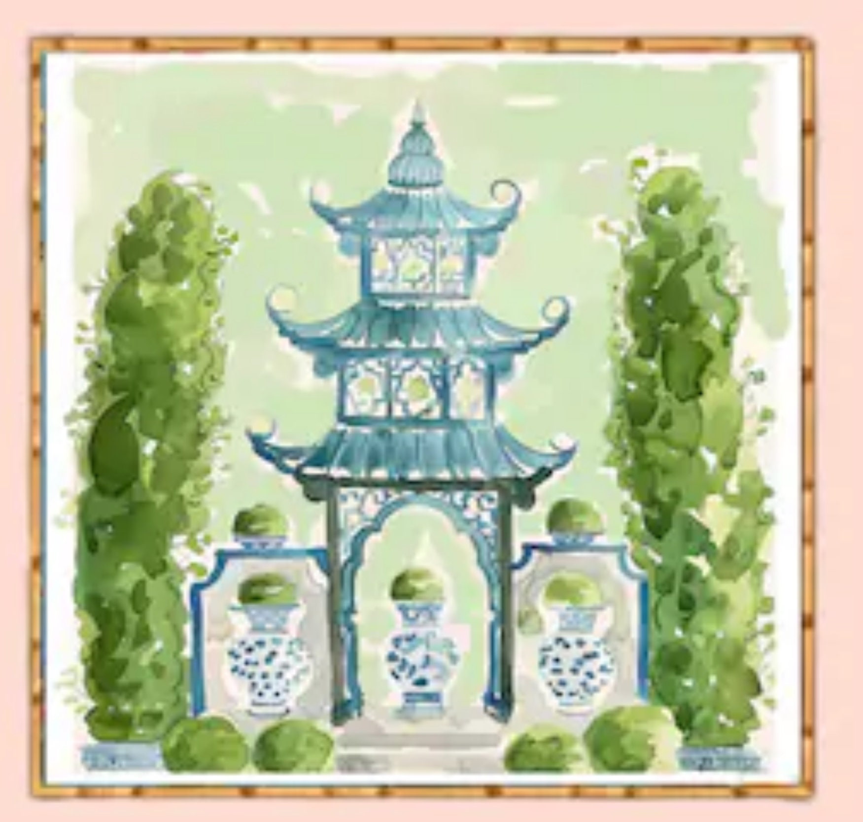 Grandmillennial art, Chinoiserie pagoda garden 3 art print