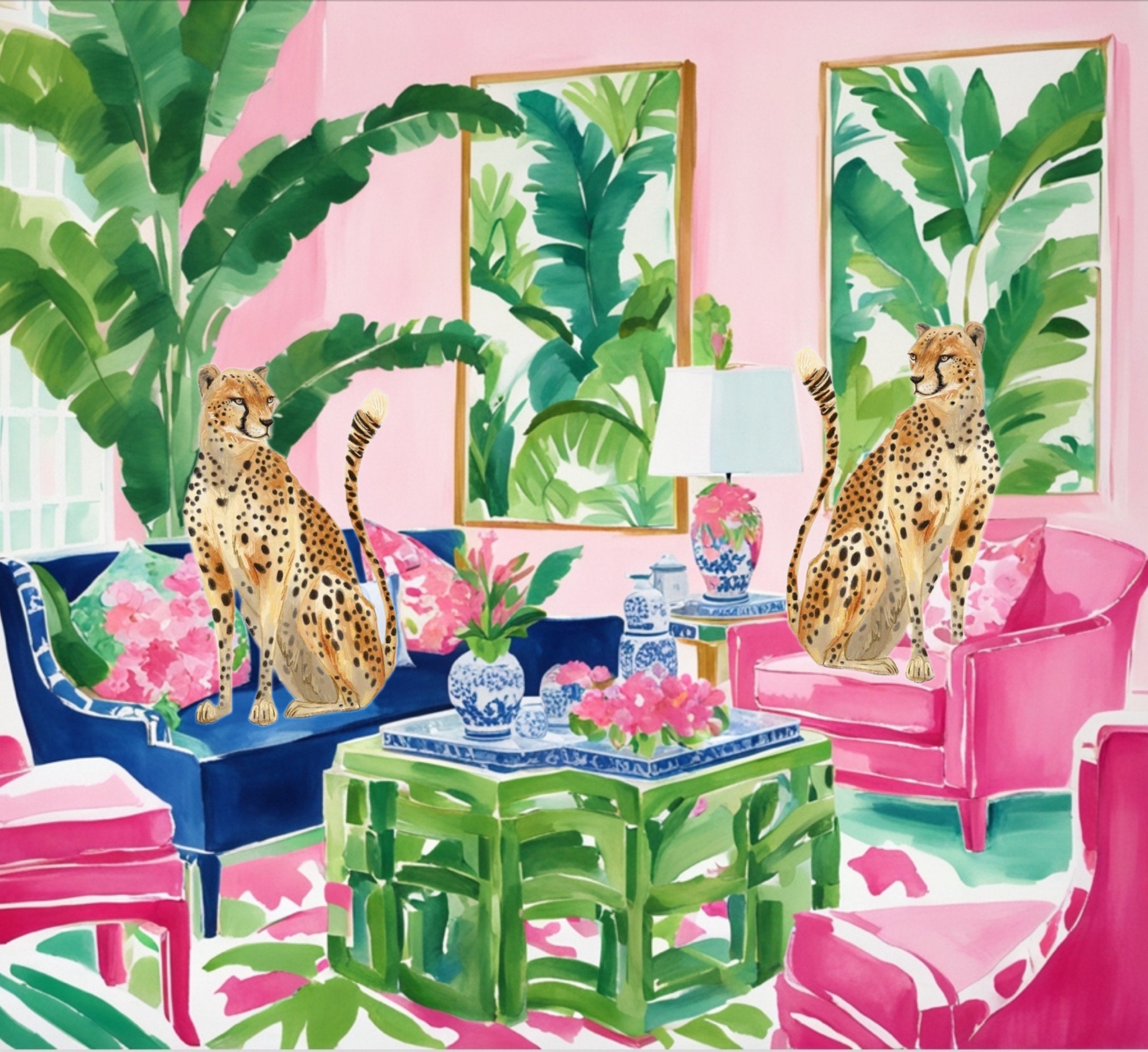 Grandmillennial art, Cheetahs in Palm Beach room 2, watercolor painting