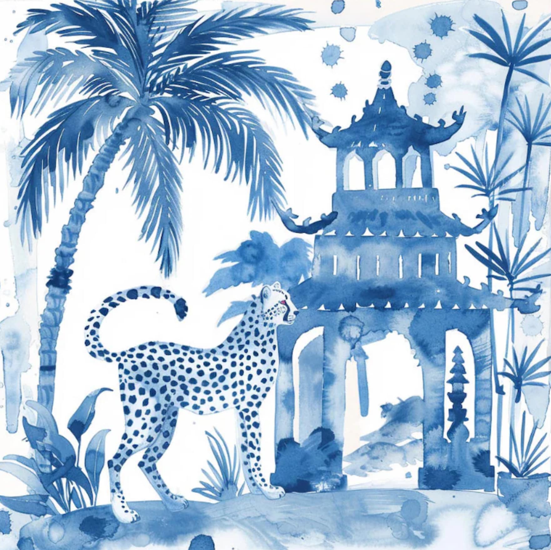 Grandmillennial art, Blue and white chinoiserie cheetah in pagoda garden art print