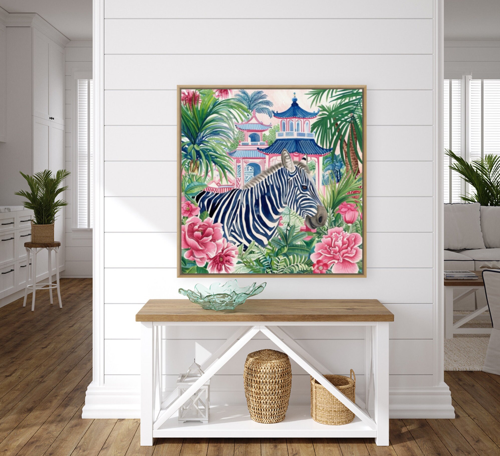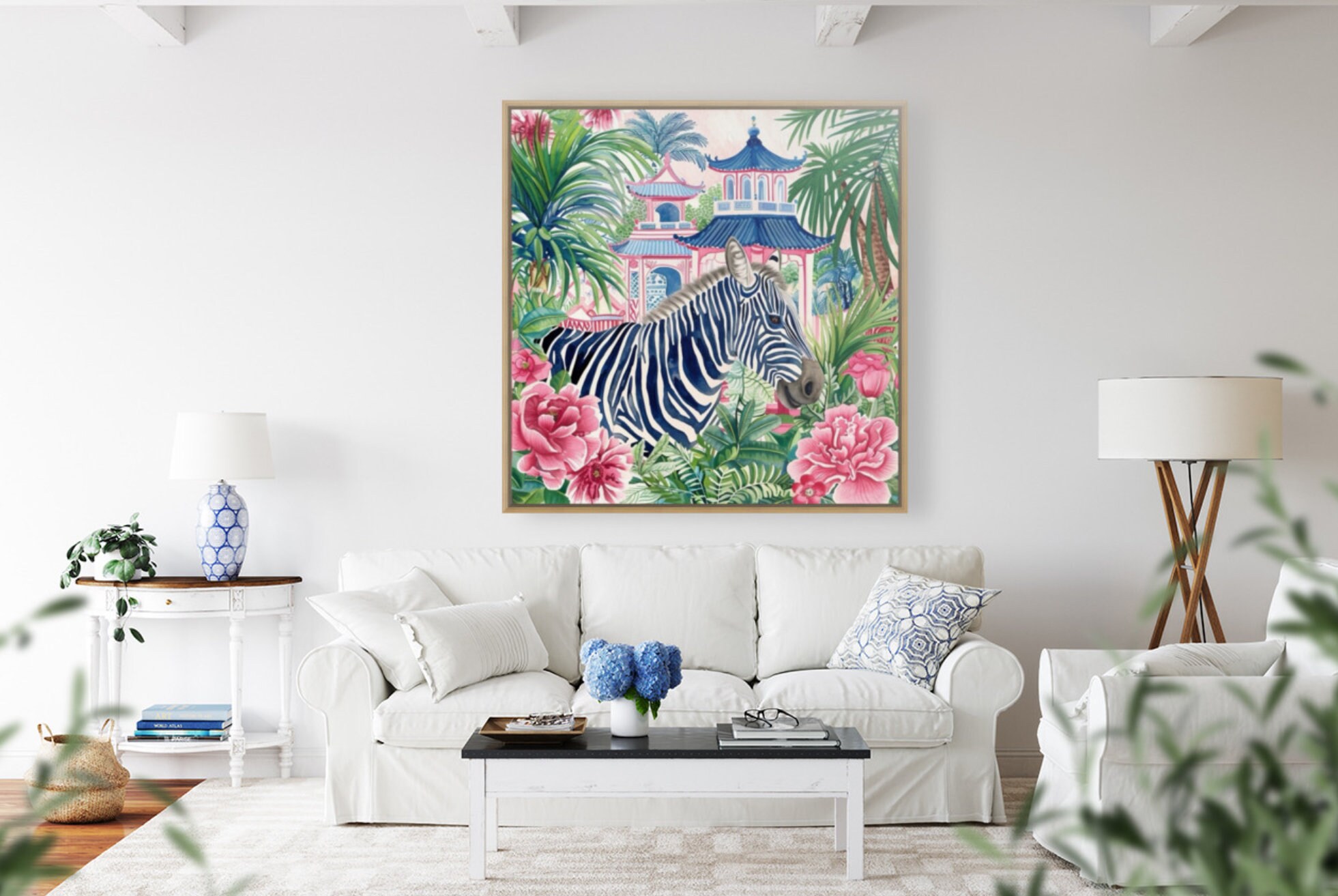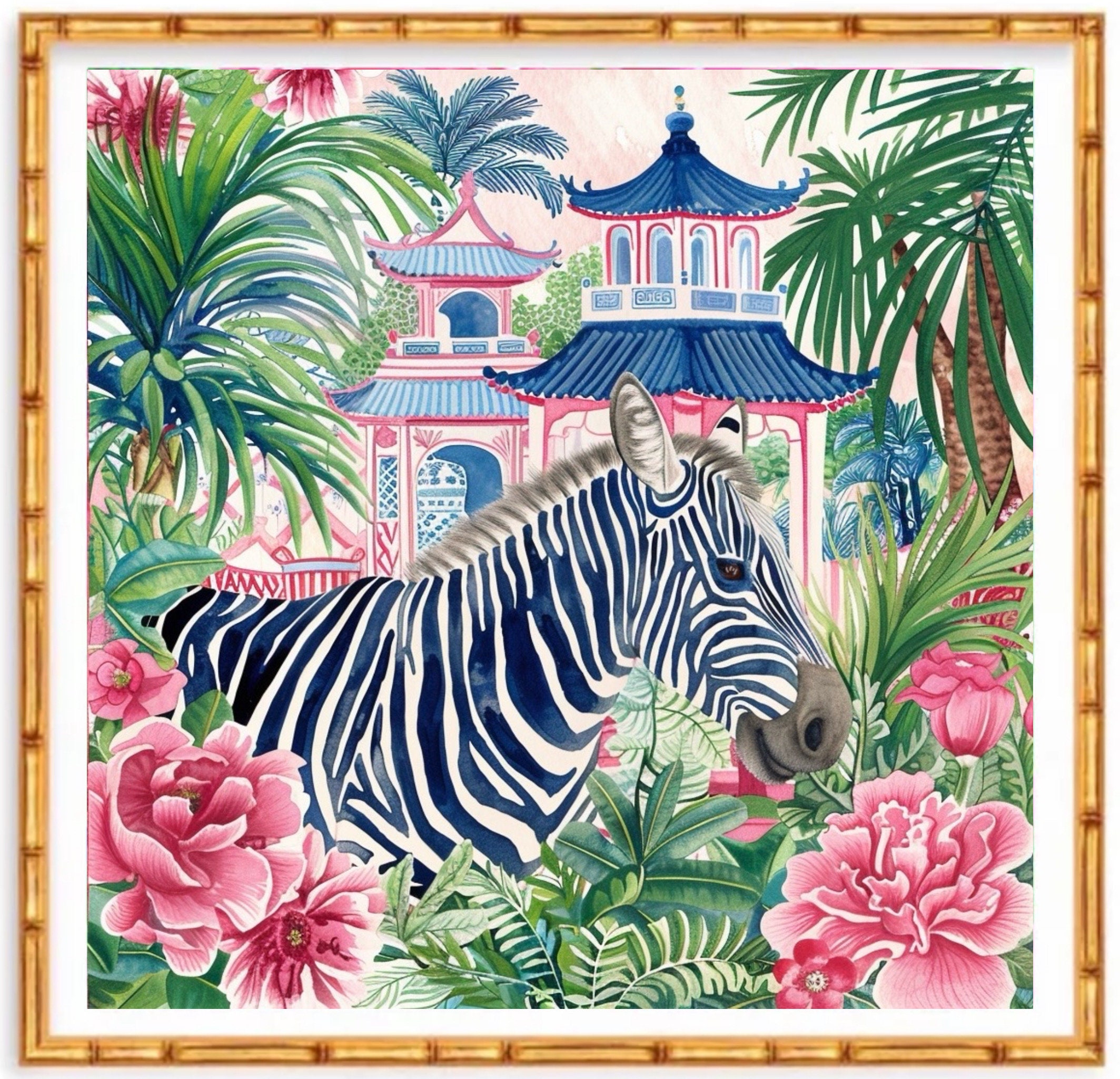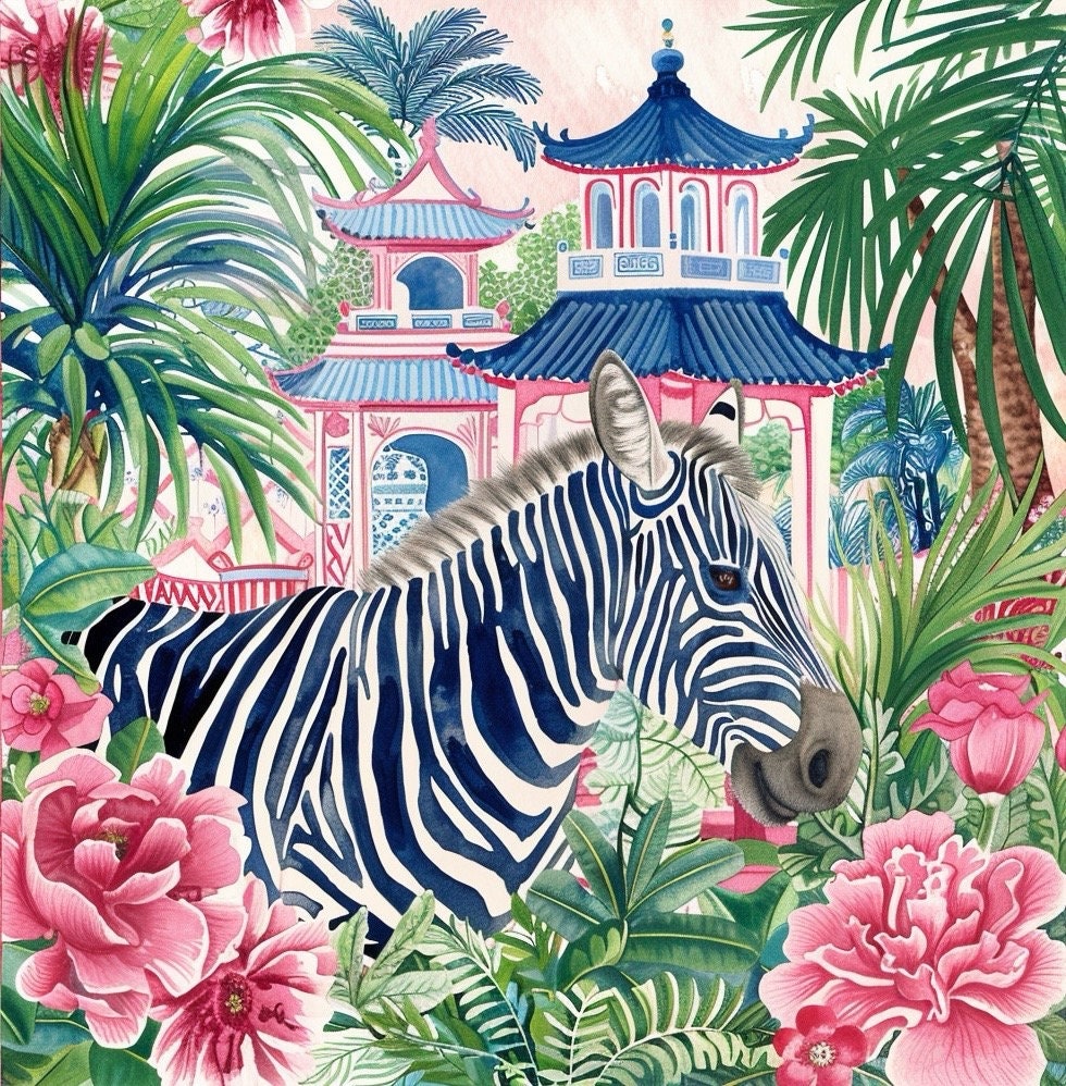 Grandmillennial art, birds, Blue zebra in chinoiserie pagoda garden watercolor art print