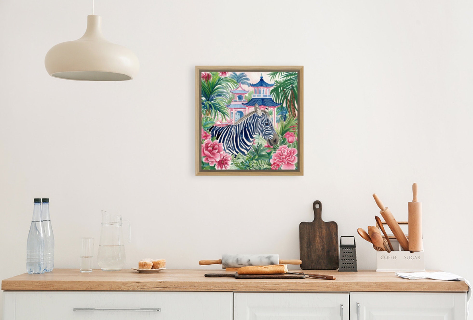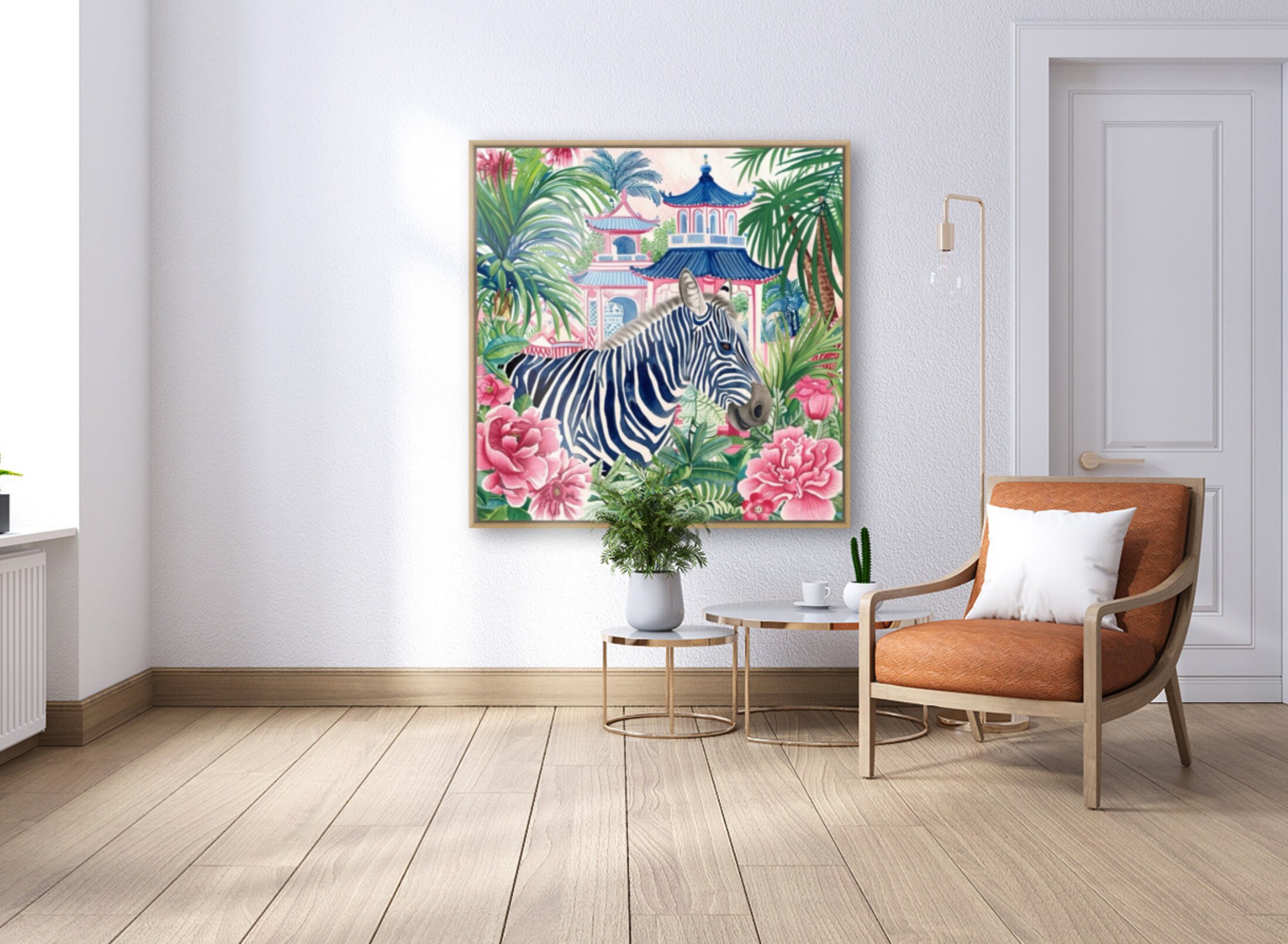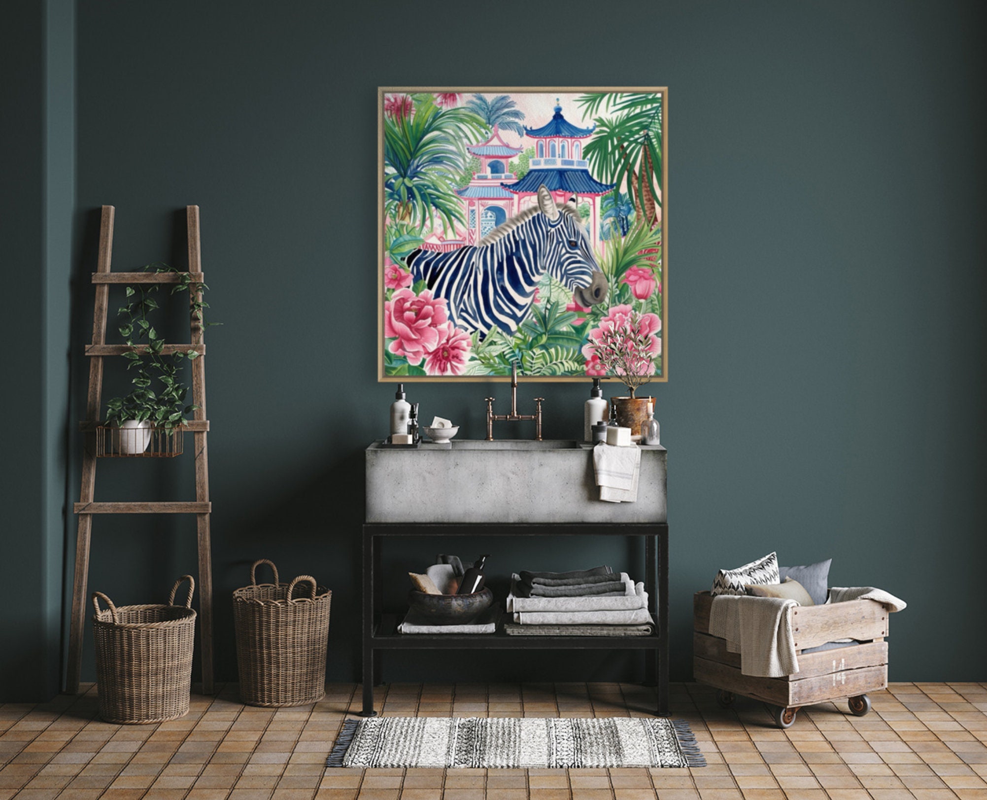 Grandmillennial art, birds, Blue zebra in chinoiserie pagoda garden watercolor art print
