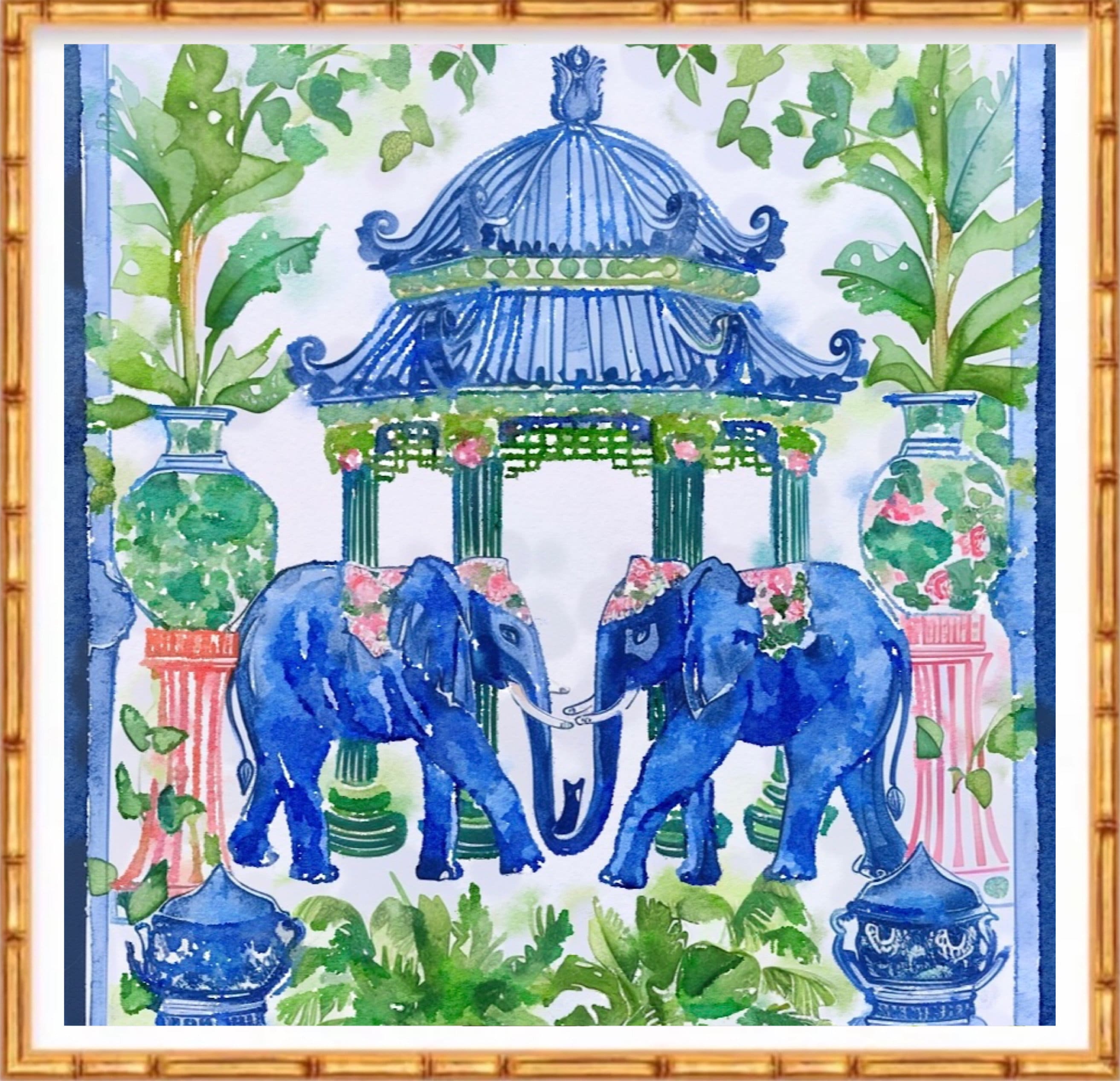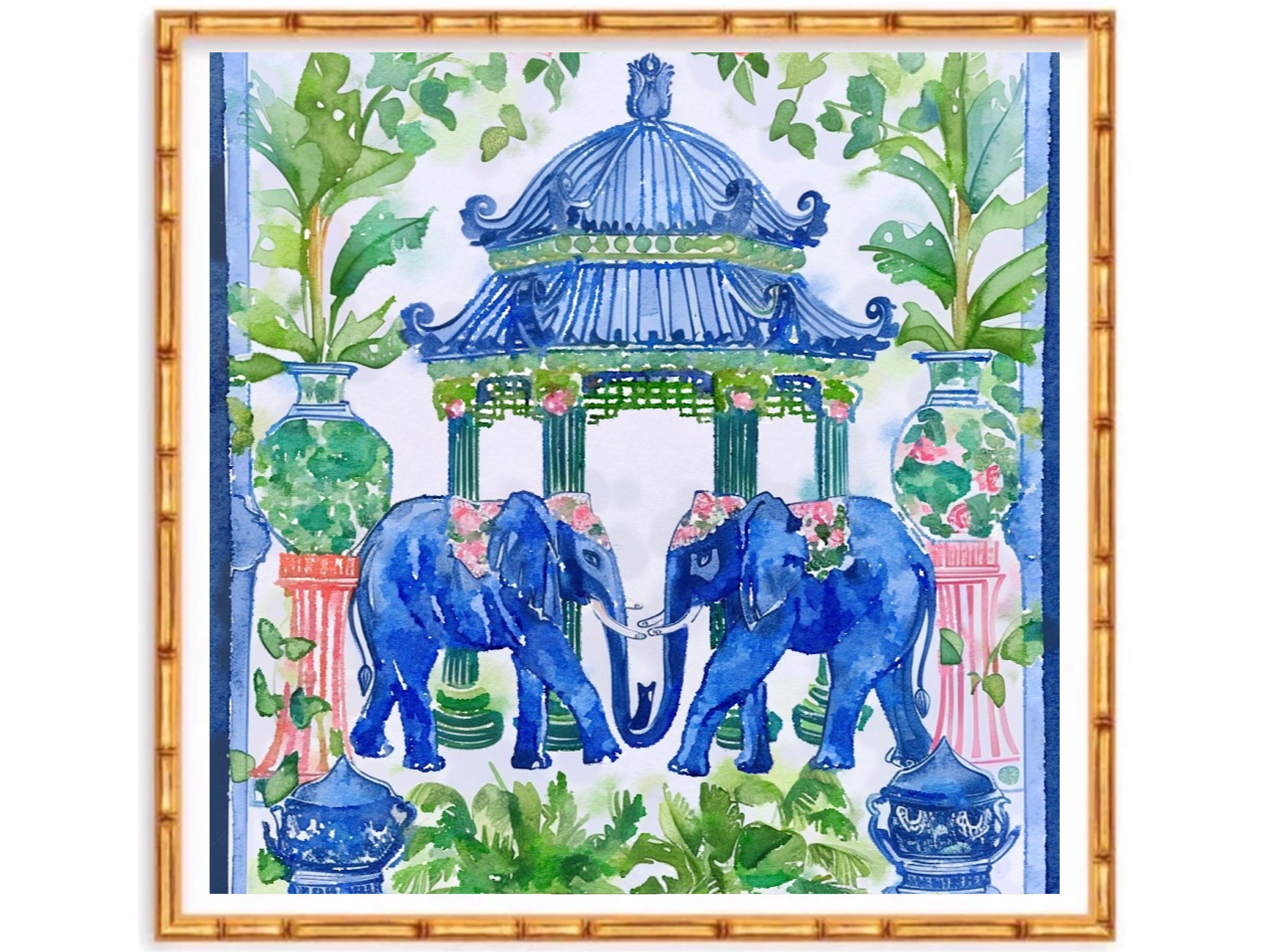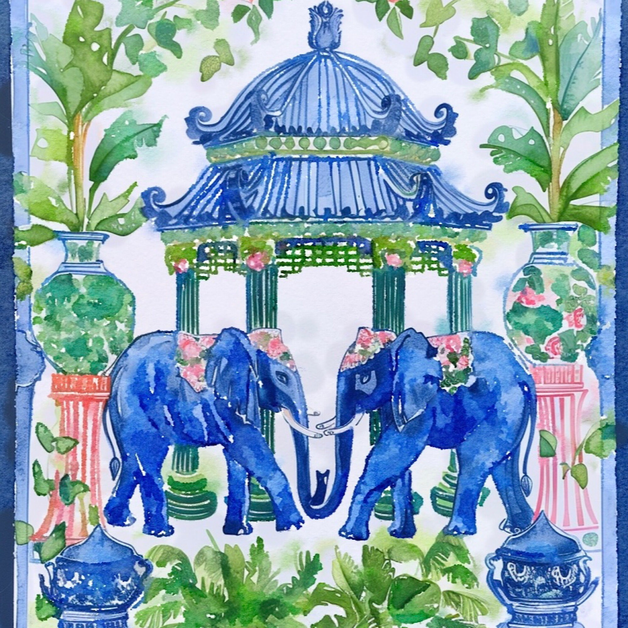 Blue elephants in pagoda garden, whimsical chinoiserie painting