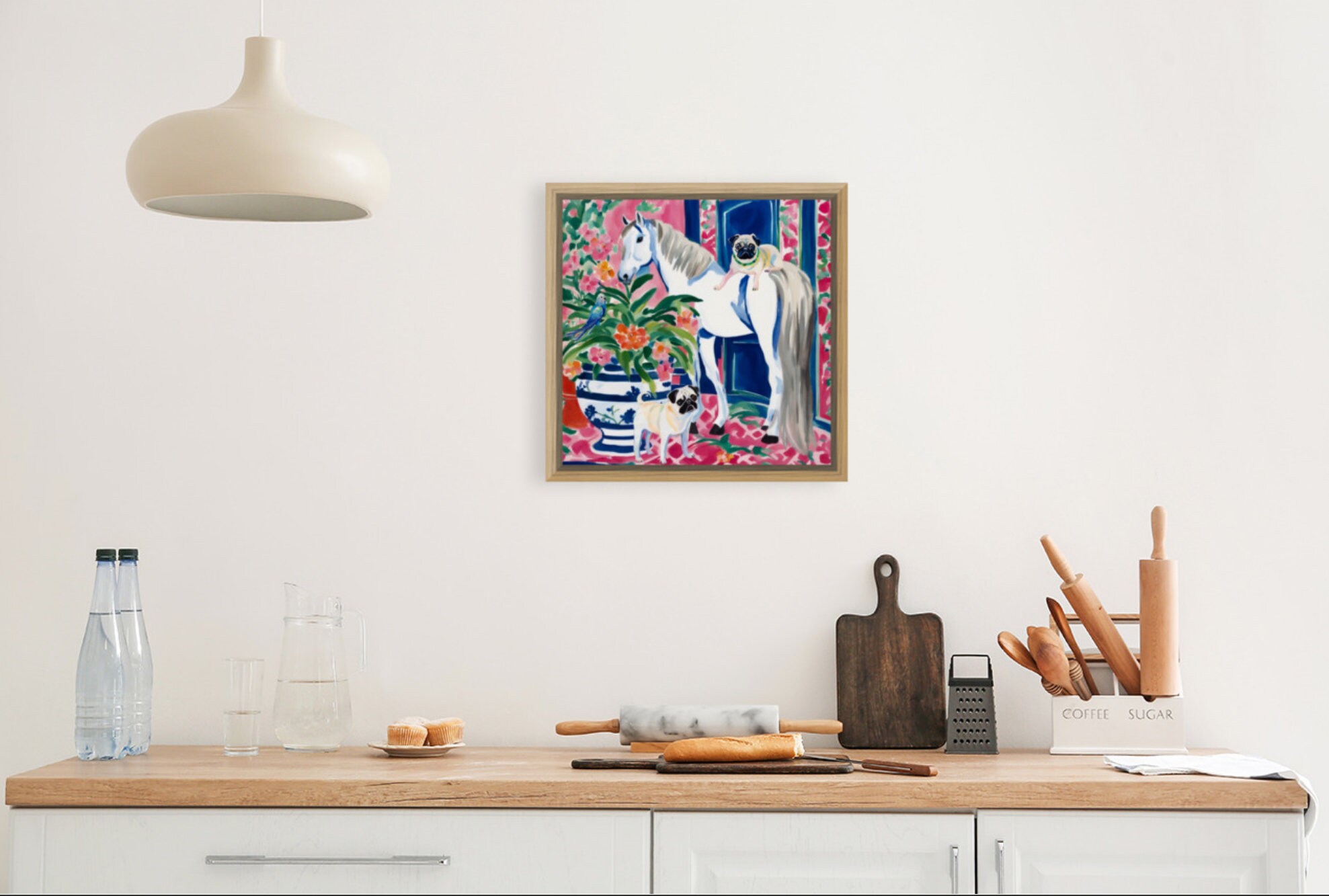 PLEASE NOTE SIZES ARE IN CM. Whimsical fine art print of an original oil on board. Printed on highest quality 310 gsm Hahnemuhle paper using vibrant archival HP inks. The textured quality of the paper allows for faithful reproduction of the original. The prints are also available on canvas stretched on 4 cm wide stretchers. Sizes available on paper: 20x20 cm, 30x30 cm, 40x40cm, 60x60cm; on canvas: 60x60 cm, 80x80cm. The paper prints are shipped rolled in a rigid tube to avoid bending and damage. The canvas prints are shipped in a box. Every print is made to order. Orders are shipped within 5 to 7 days.