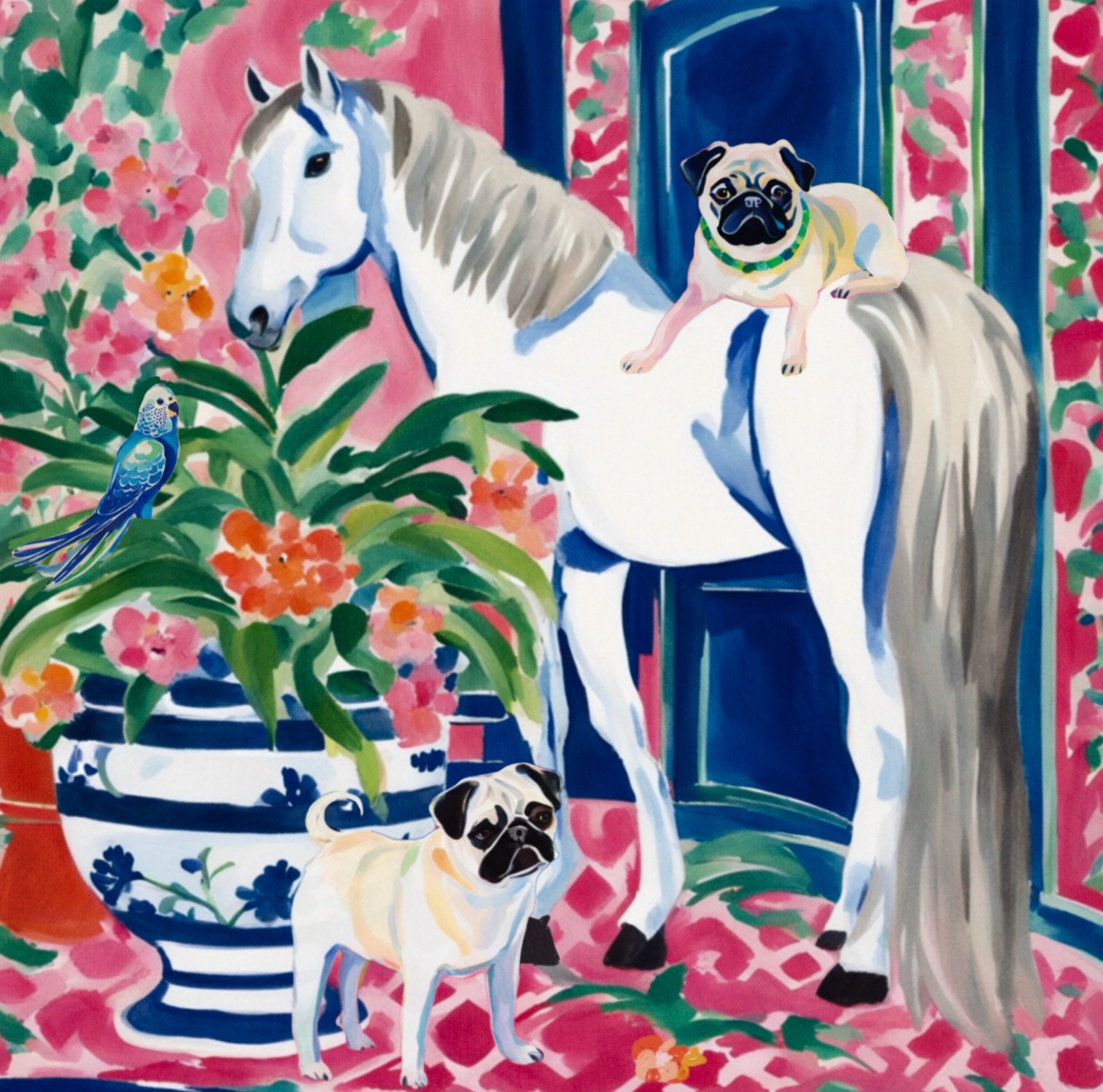 Grandmillennial art, A Yummy Bouquet, whimsical horse art