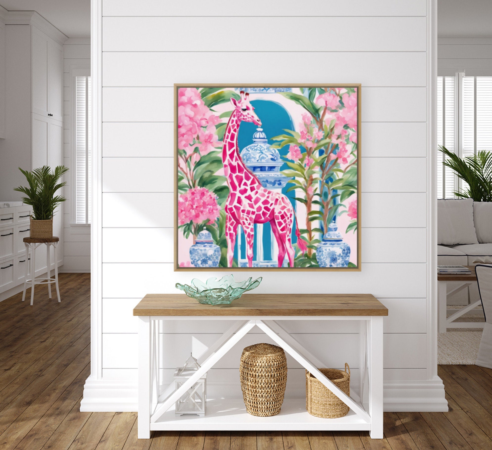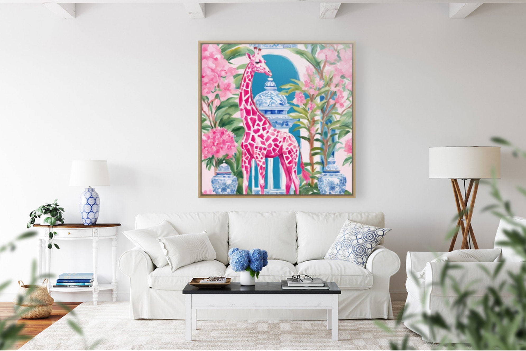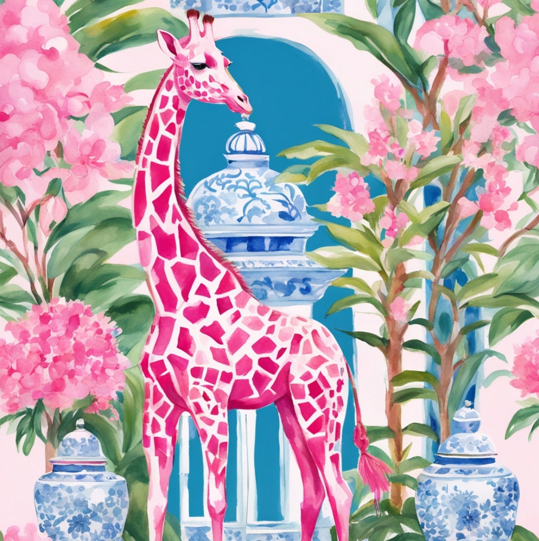 Grandmillennial art, Giraffe in Blue Chinoiserie Rotunda, whimsical watercolor