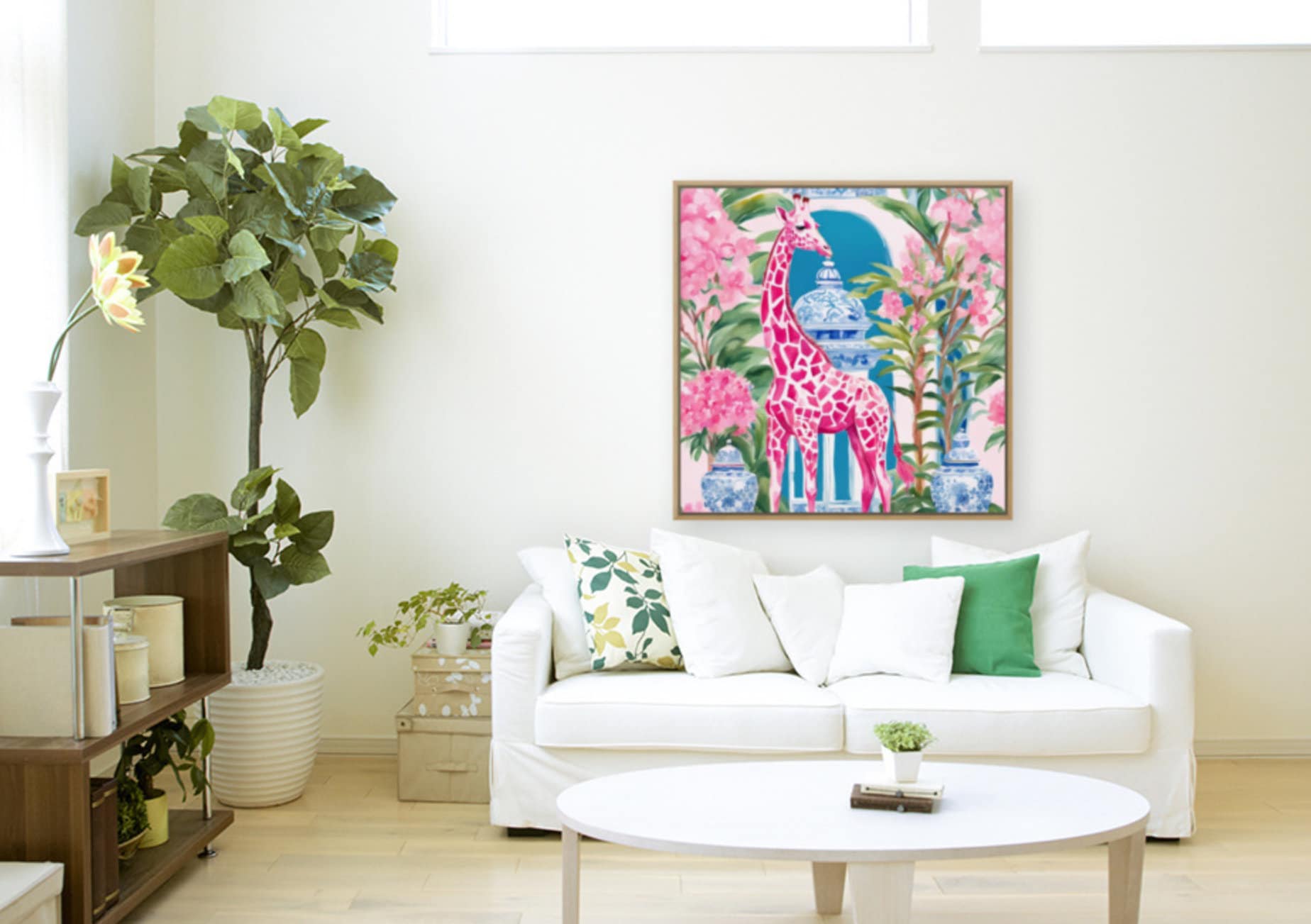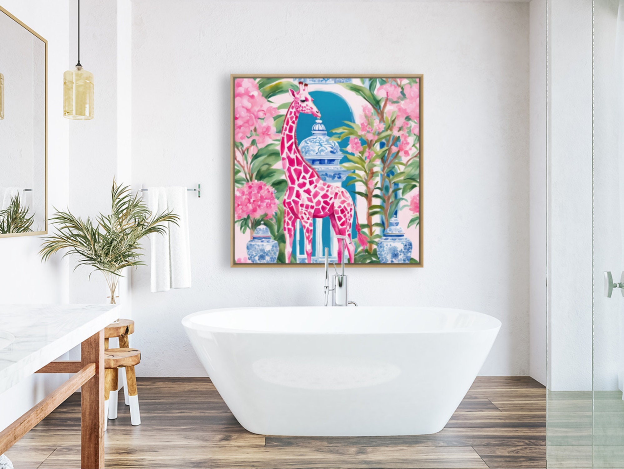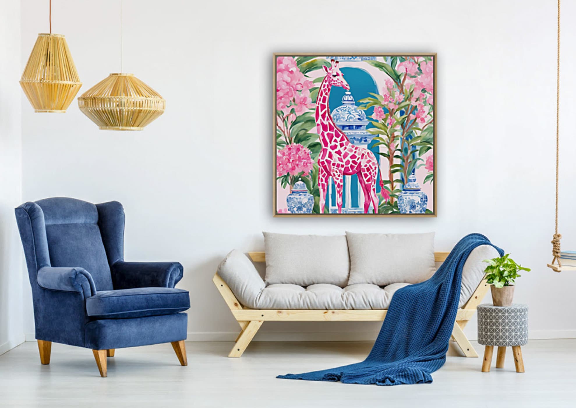 Grandmillennial art, Giraffe in Blue Chinoiserie Rotunda, whimsical watercolor