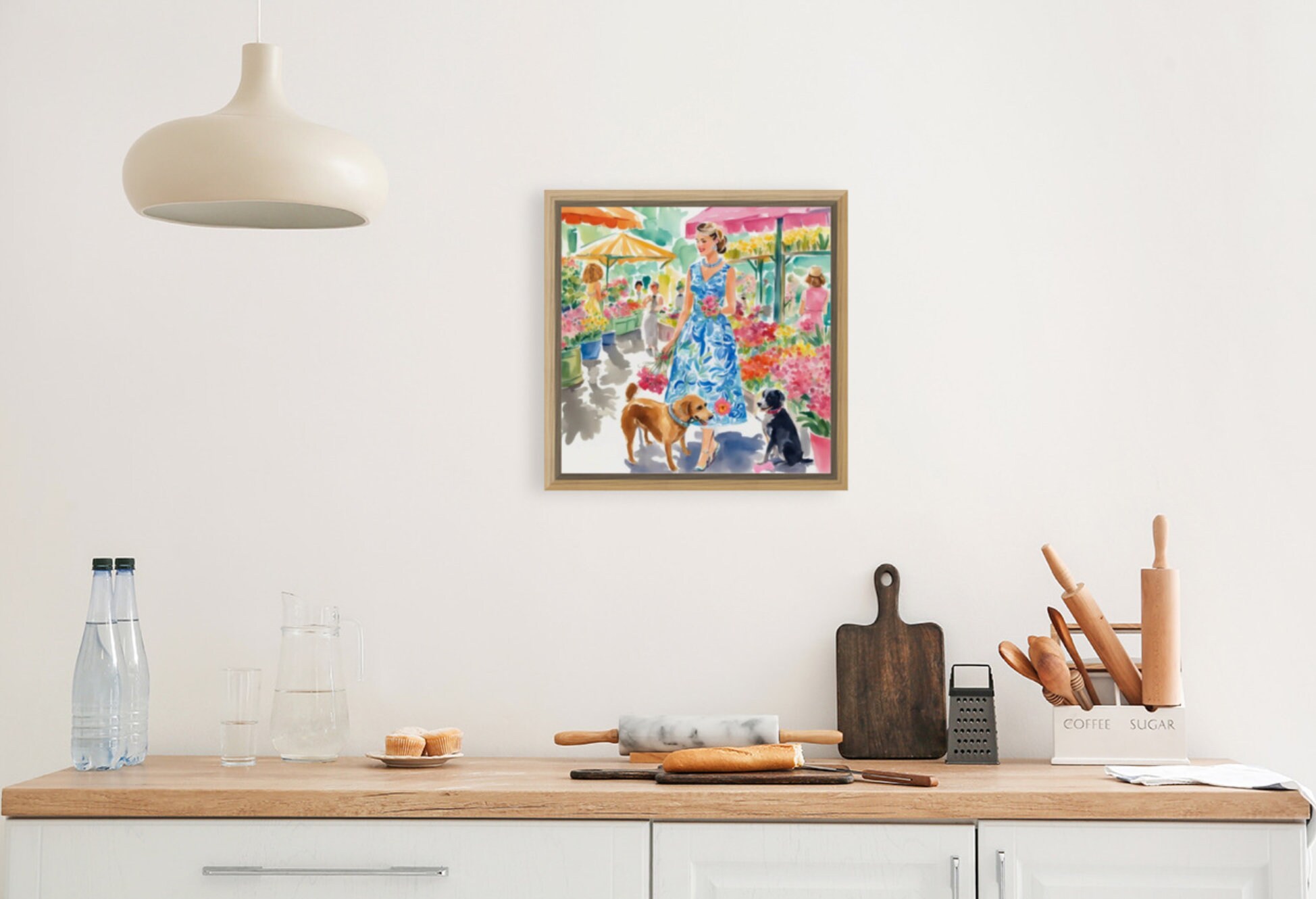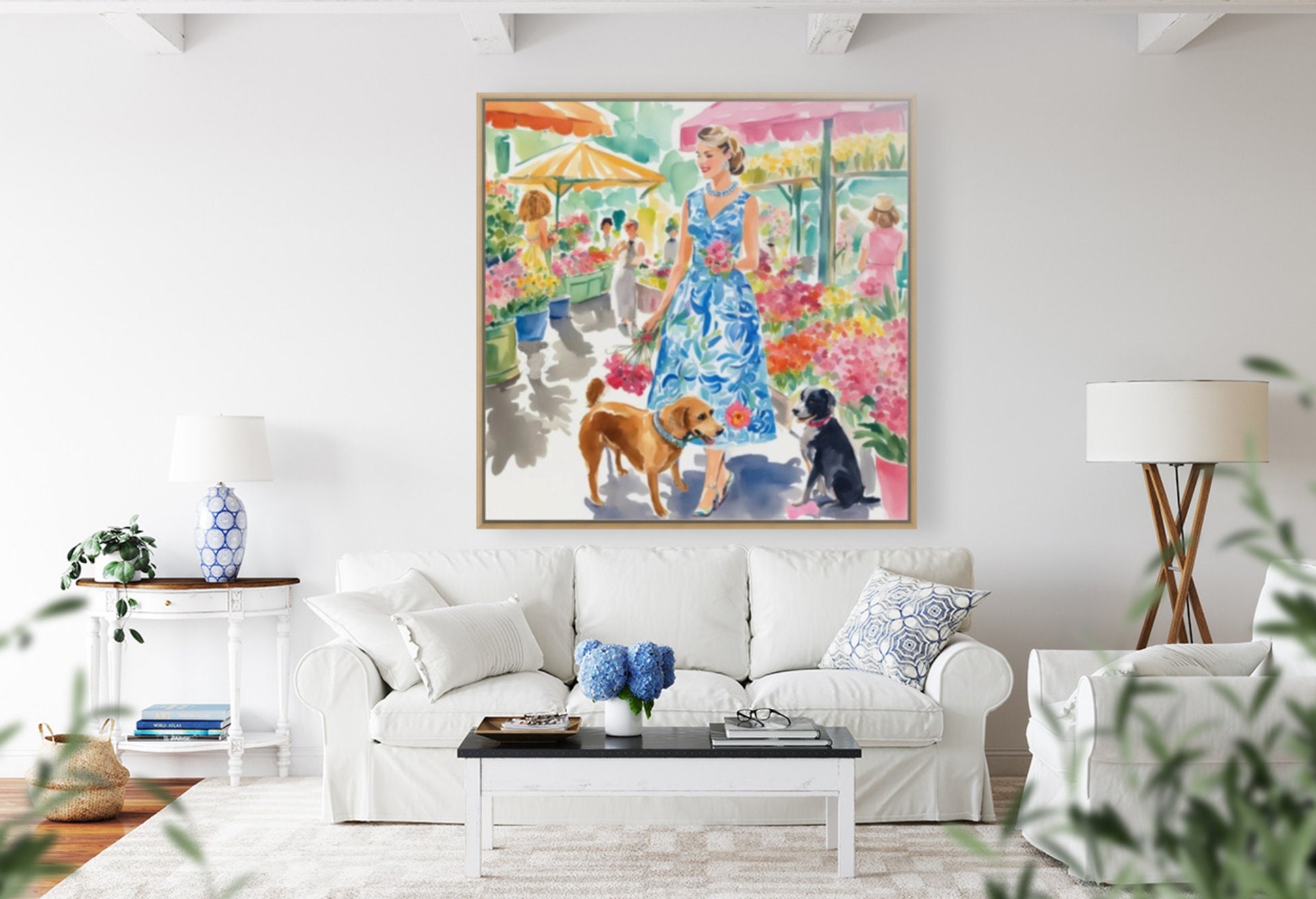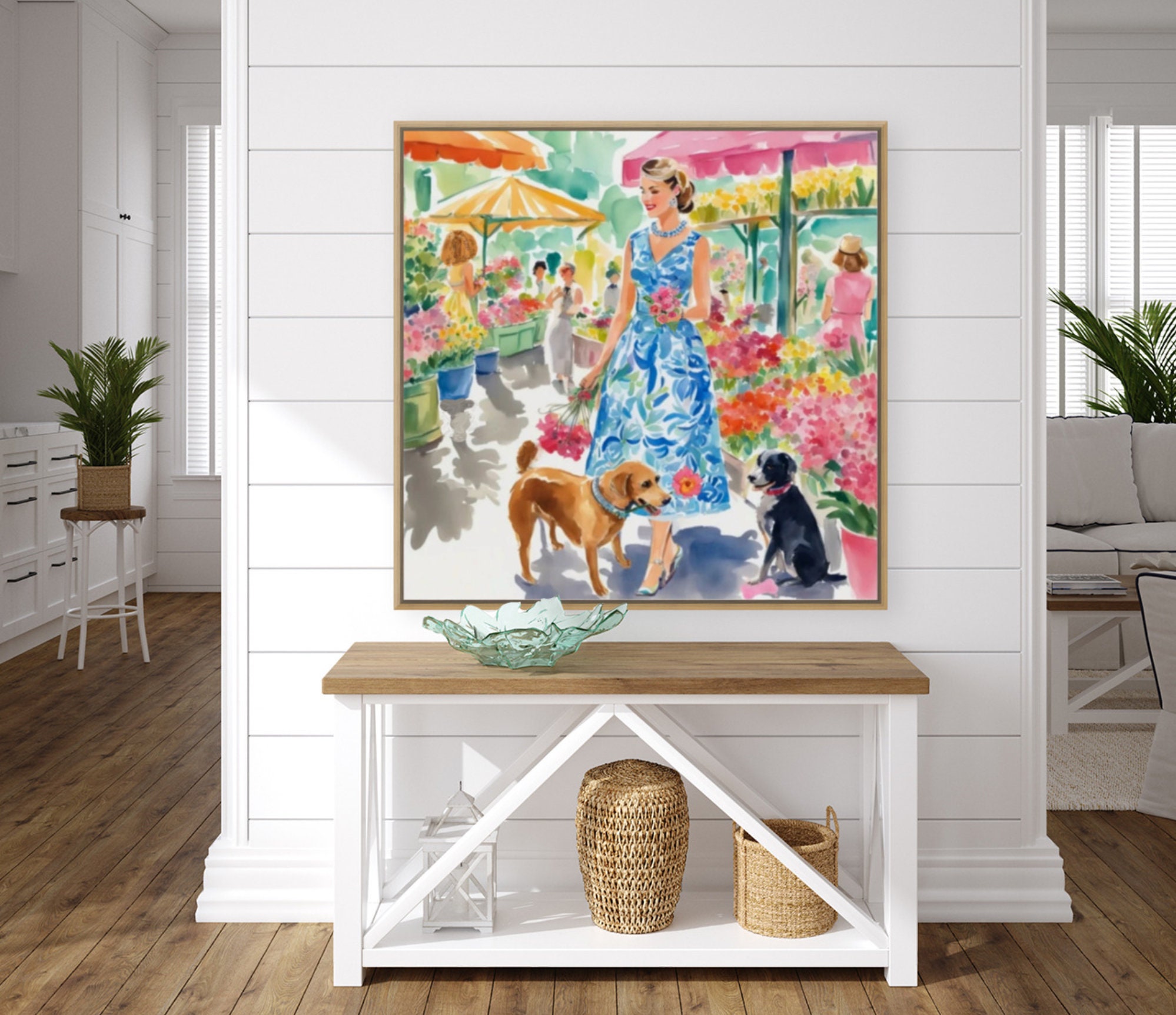 Whimsical Watercolor Art Print: Woman, Dogs, and Flowers