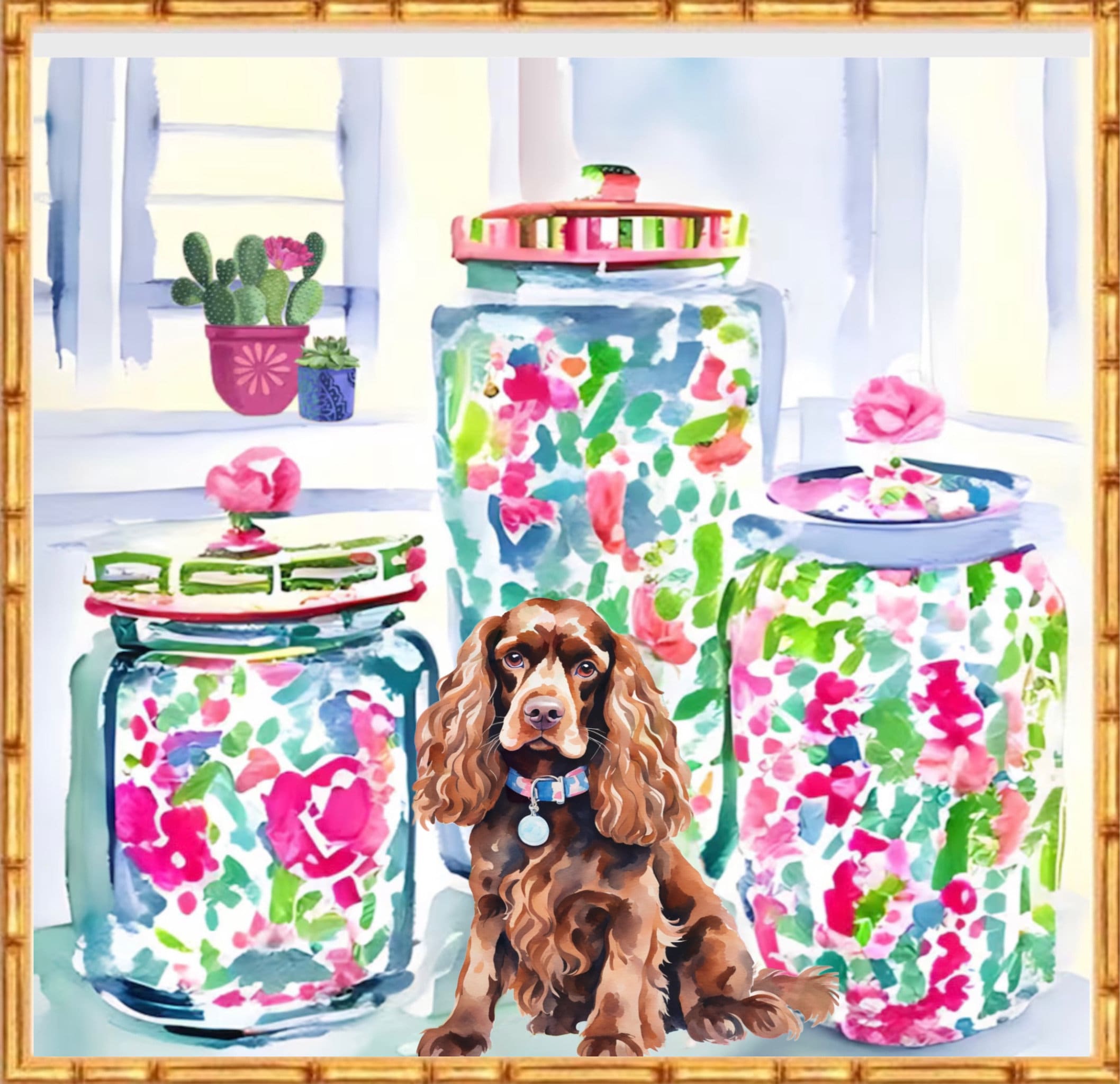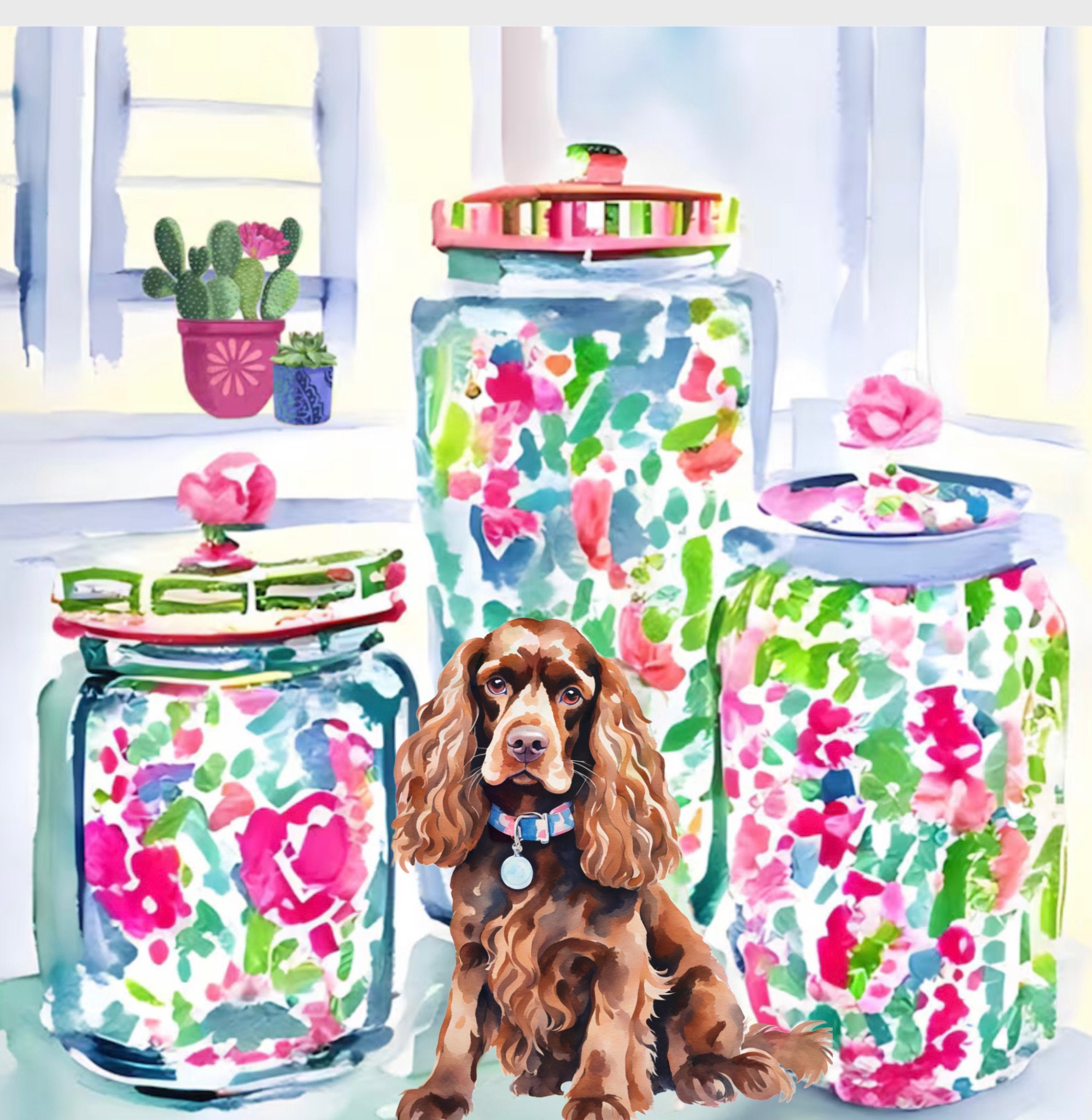 Grandmillennial art, Instant download Cocker Spaboel among chinoiserie jars