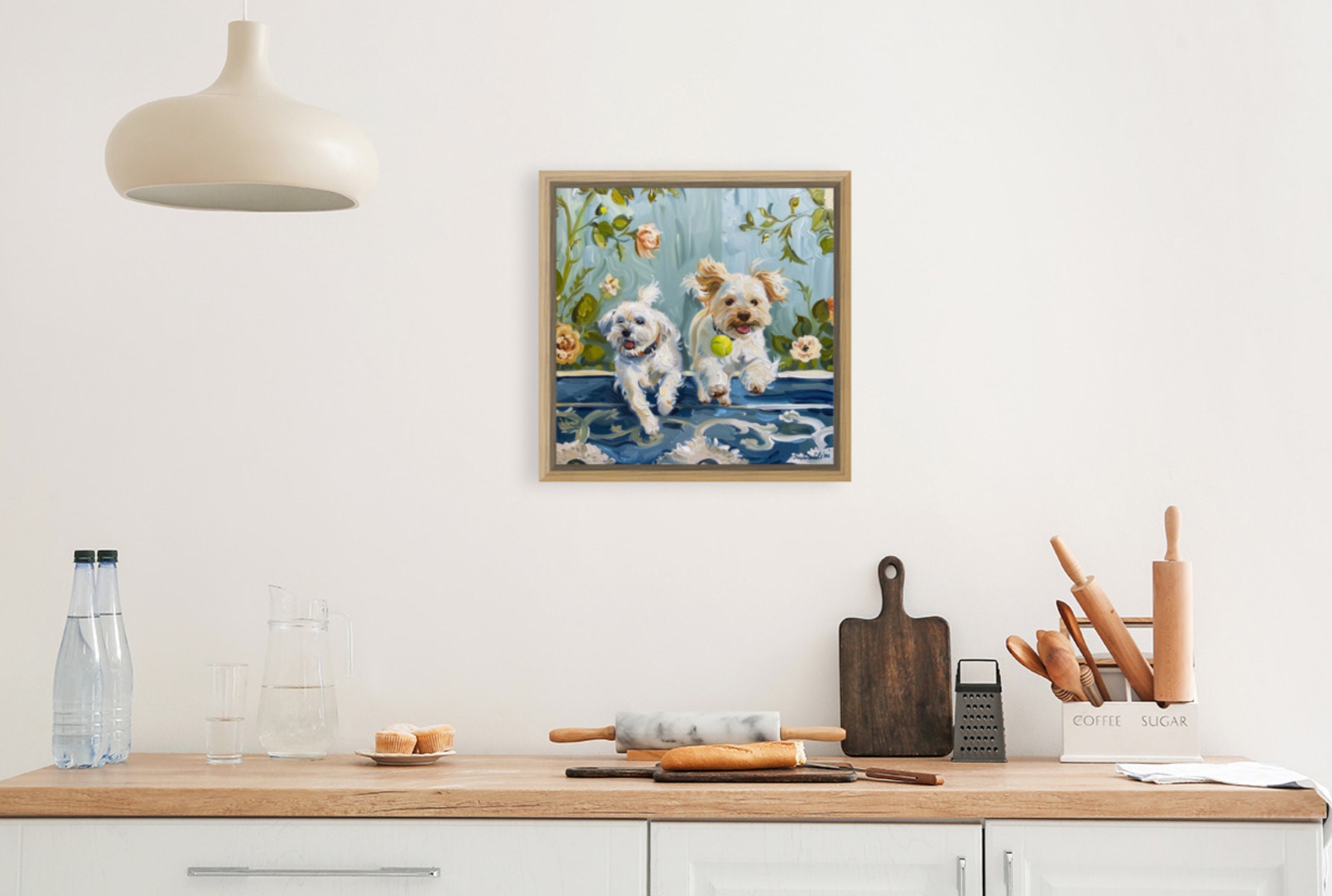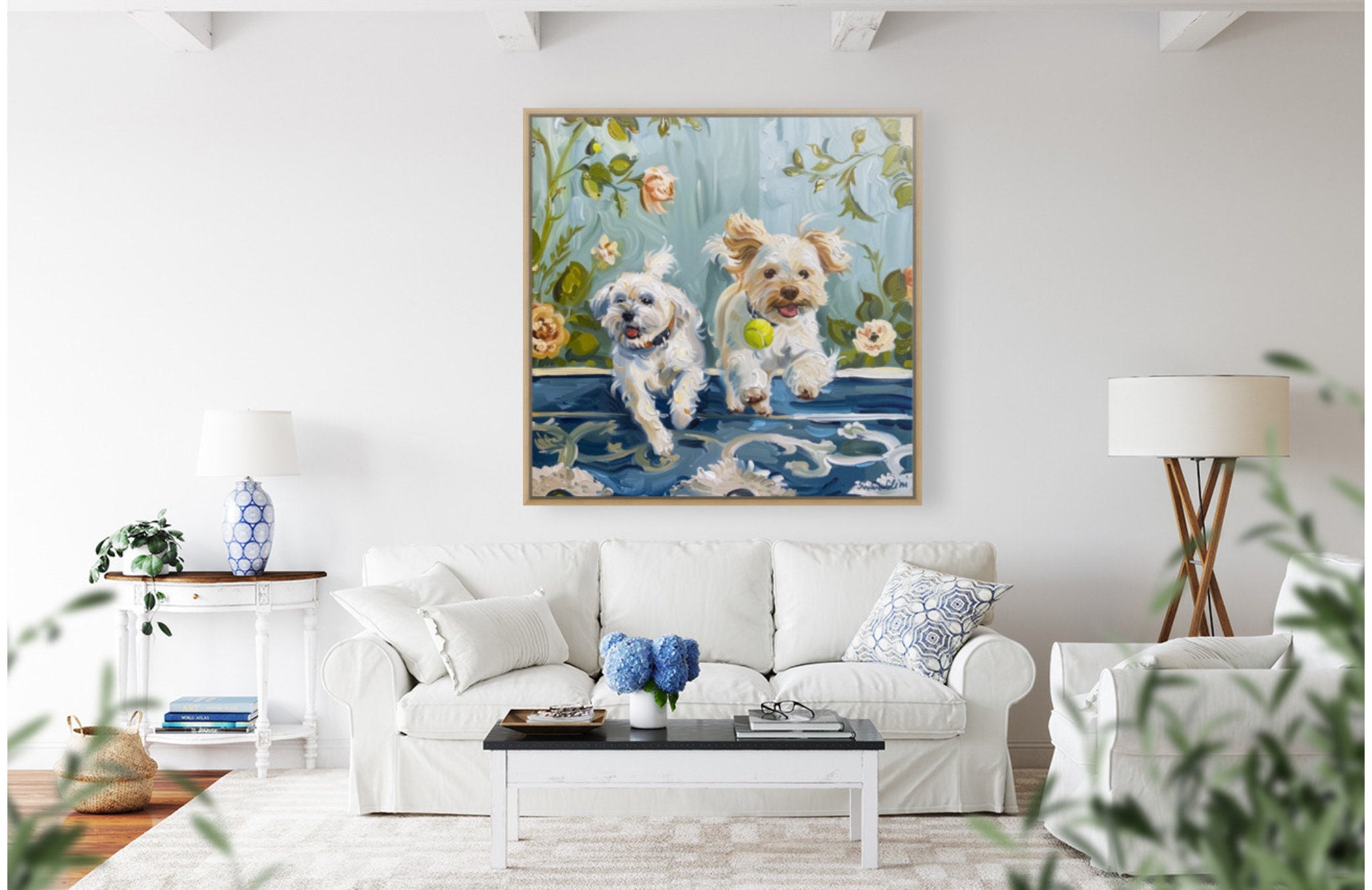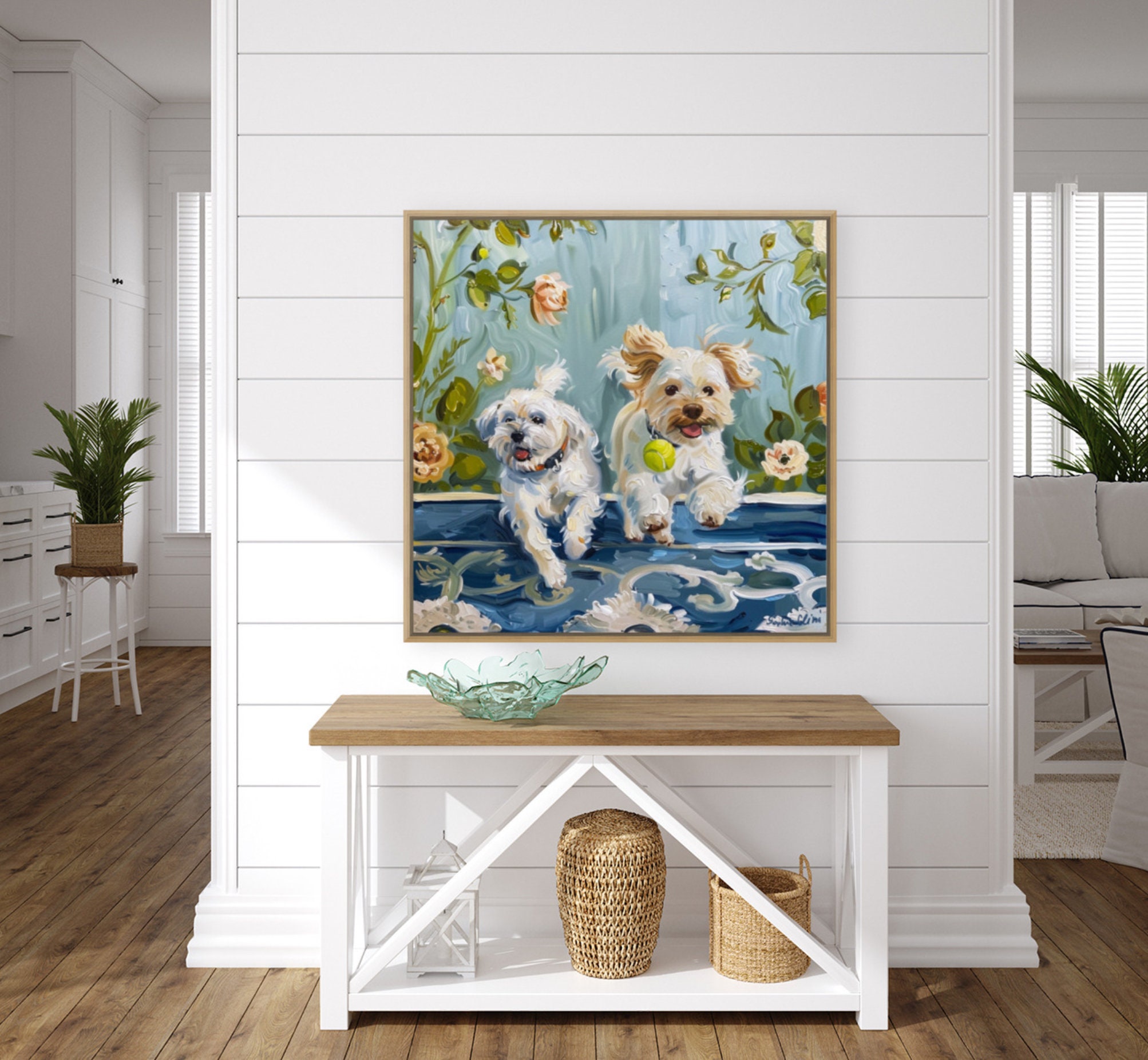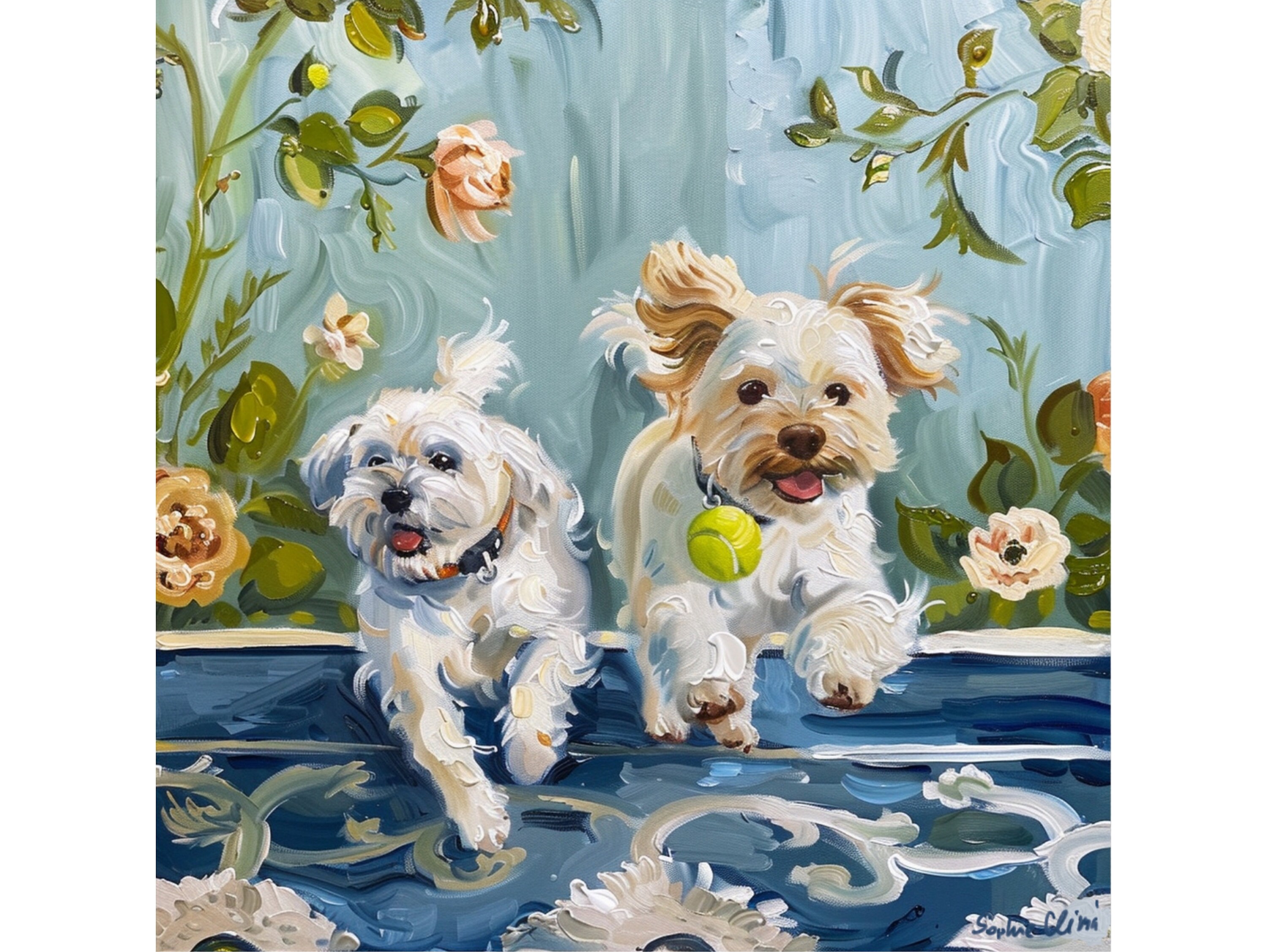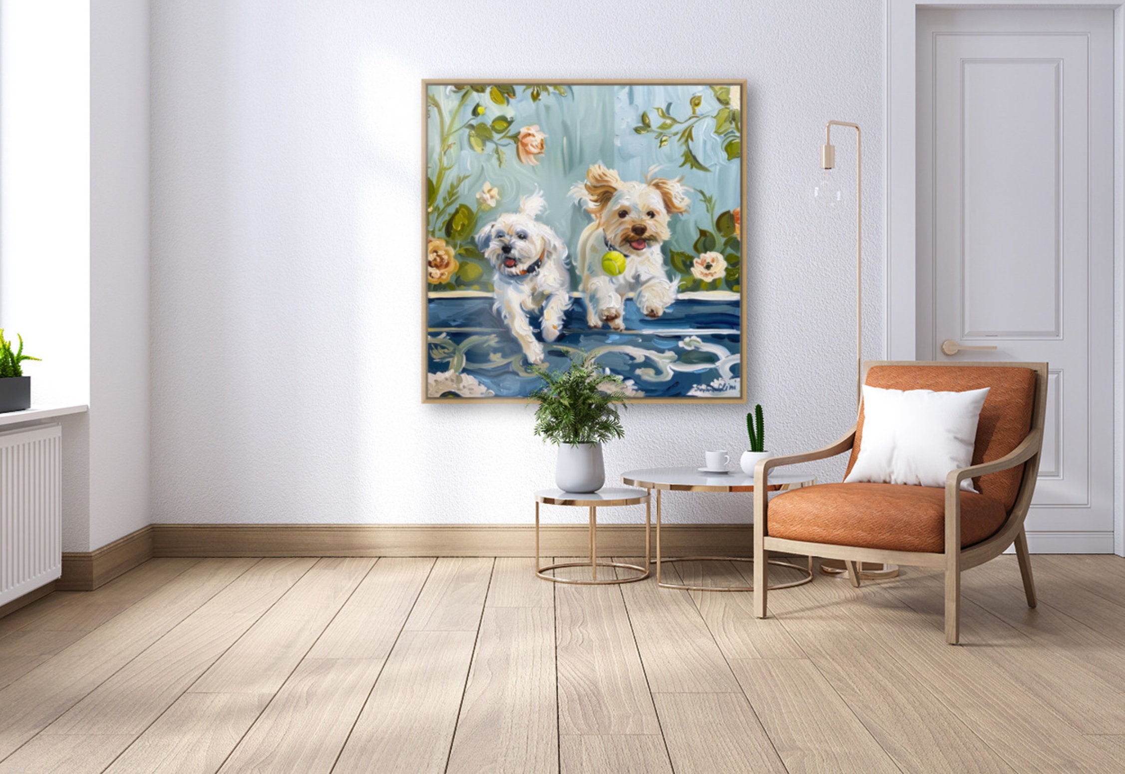 Grandmillennial art, Terriers chasing tennis ball in chinoiserie interior, oil painting