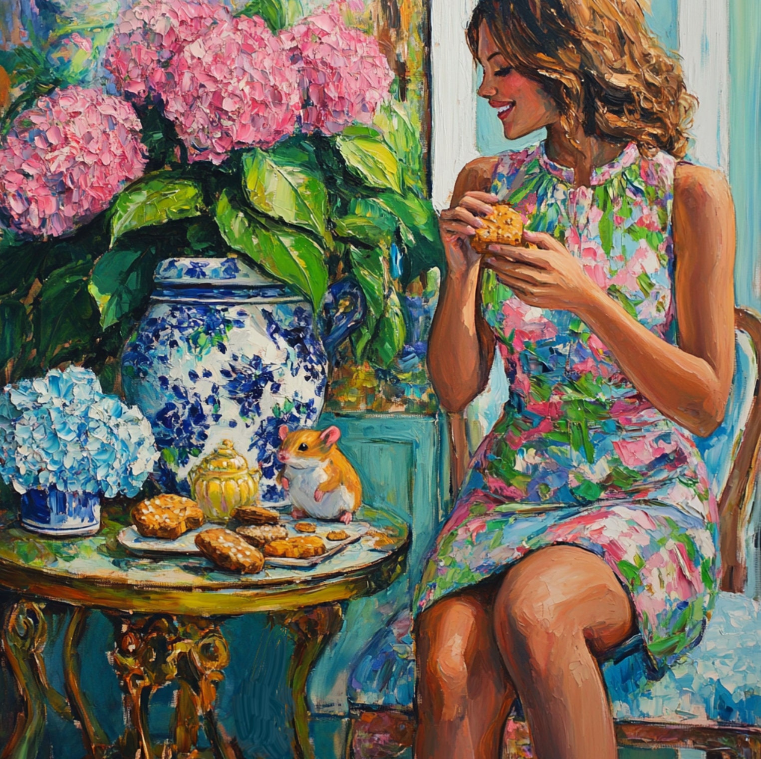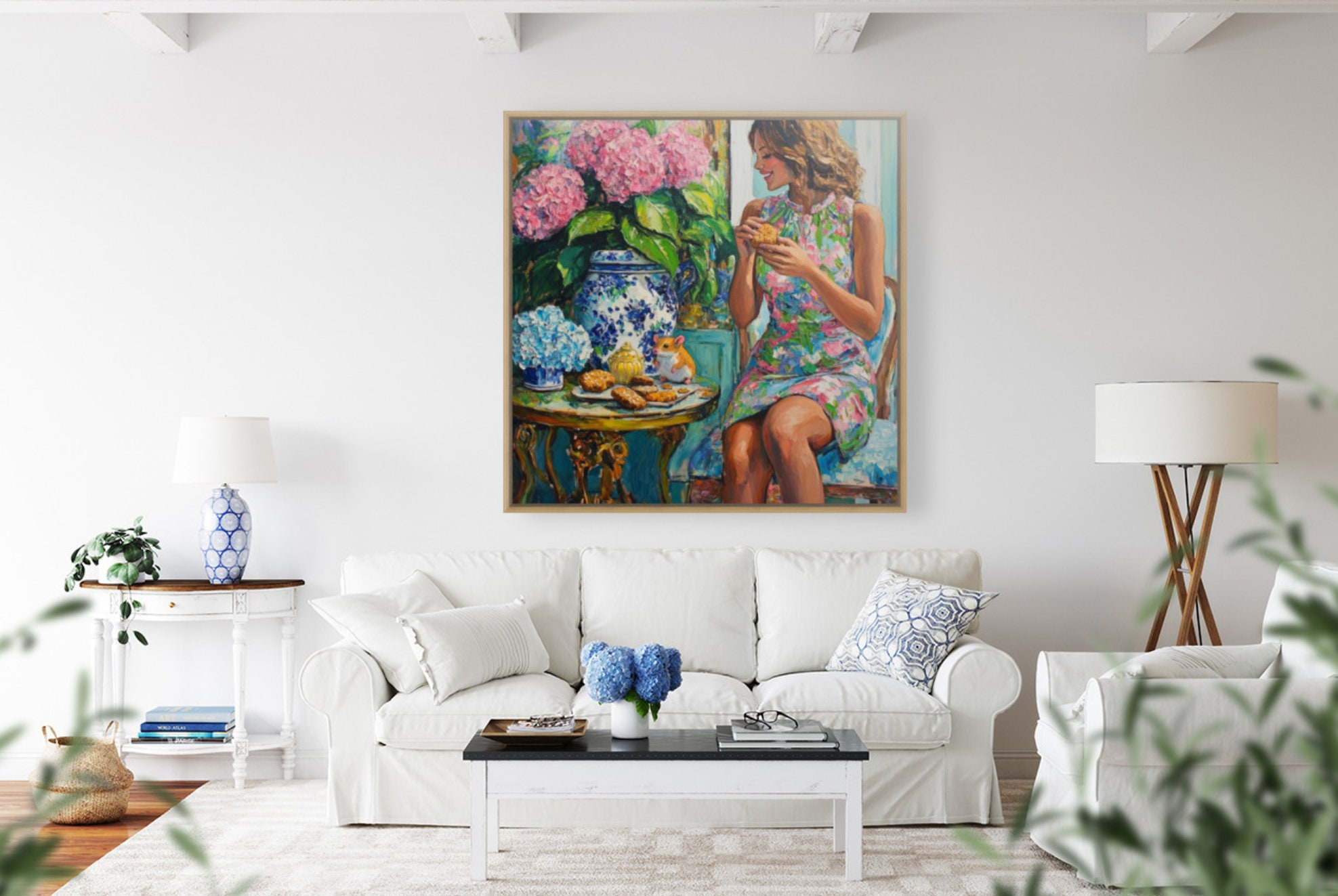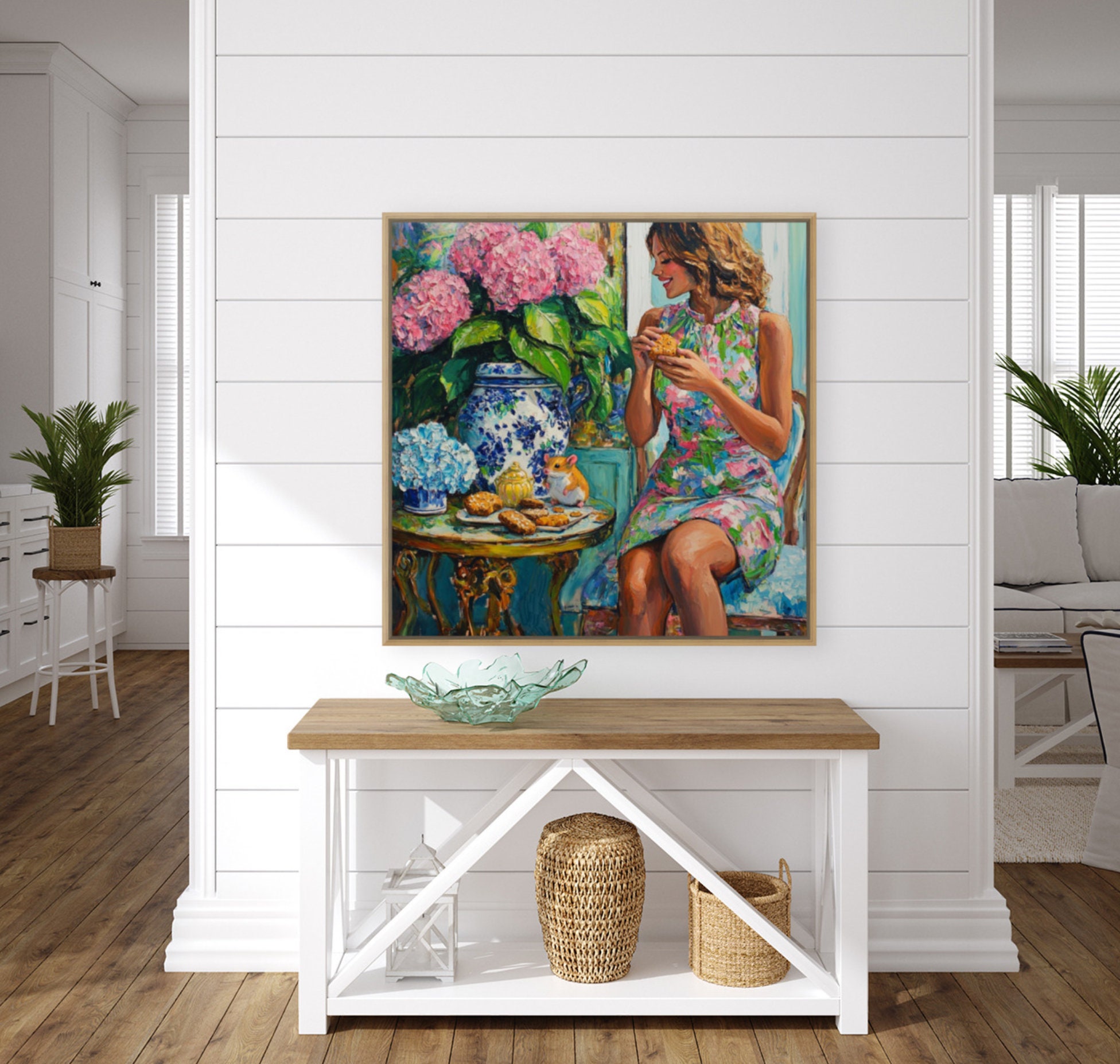 Grandmillennial art, Breakfast under the pink hydrangea, whimsical fine art