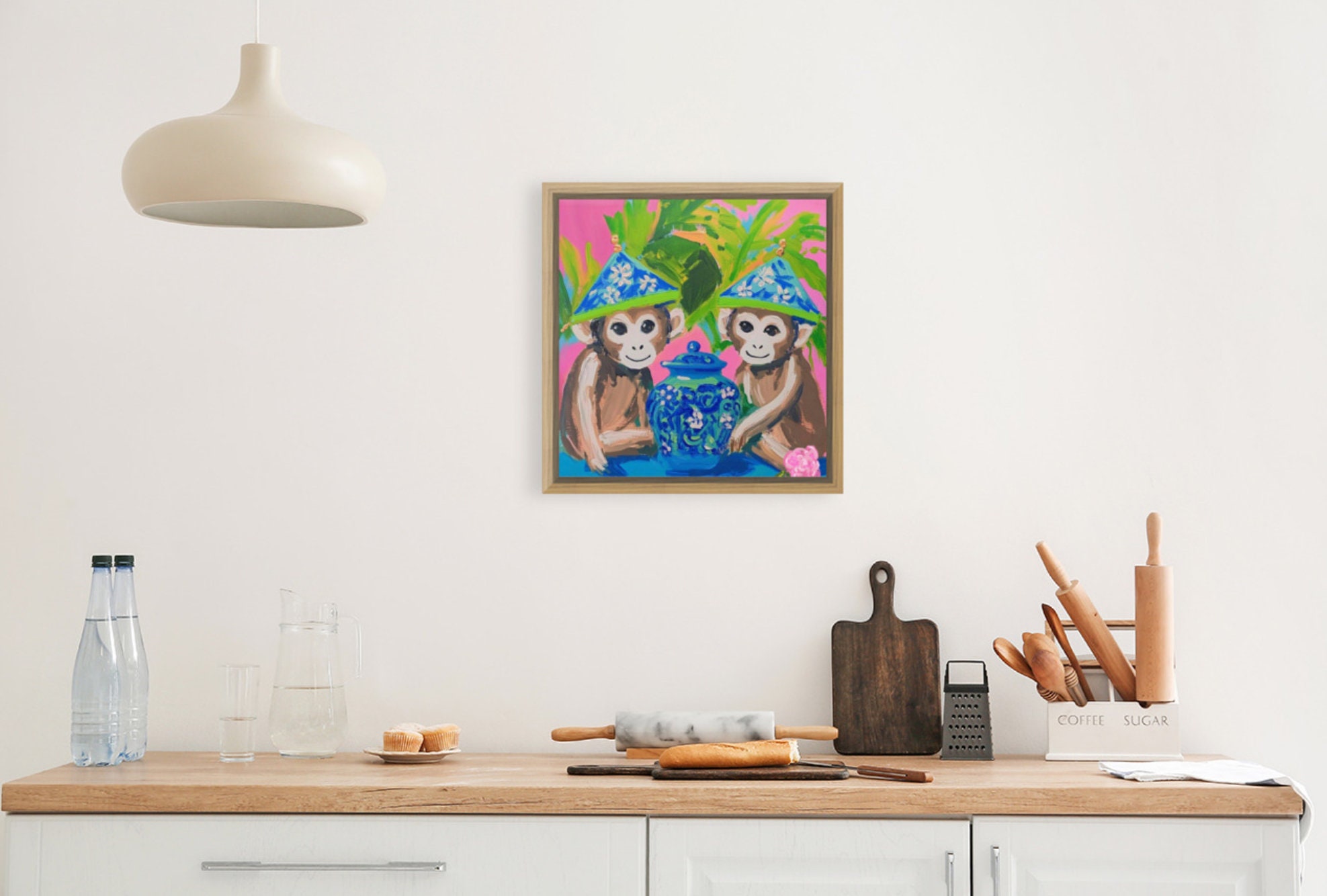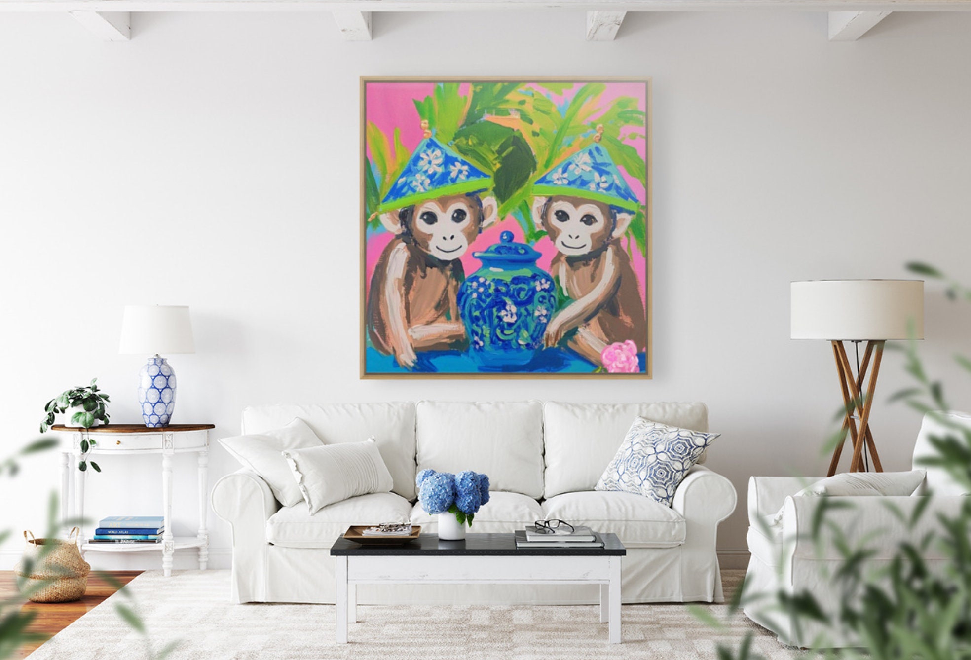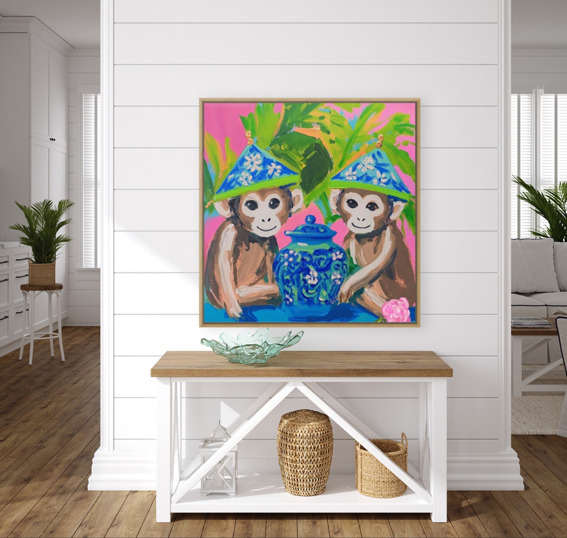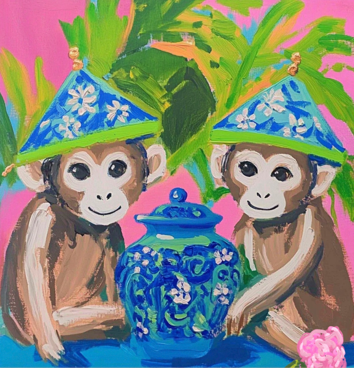 Grandmillennial art, Preppy chinoiserie monkeys on hot pink, art print