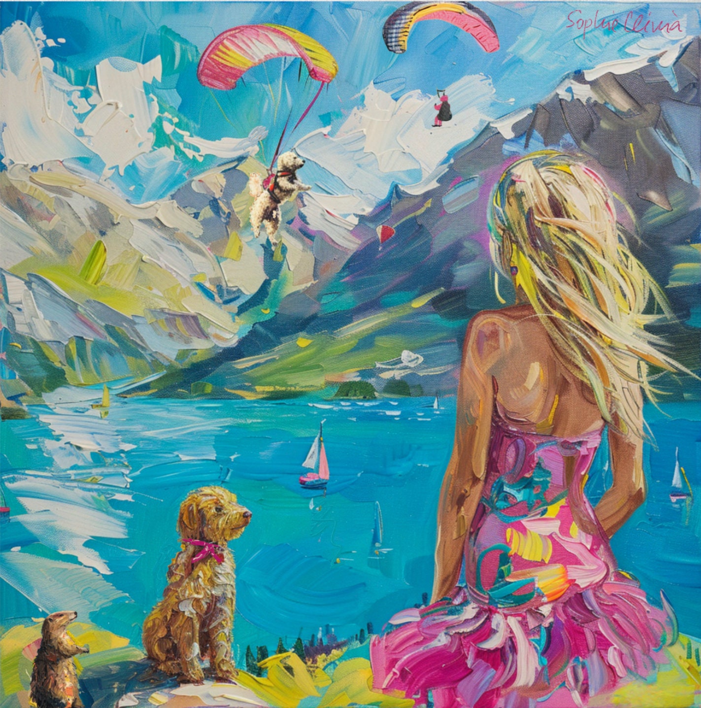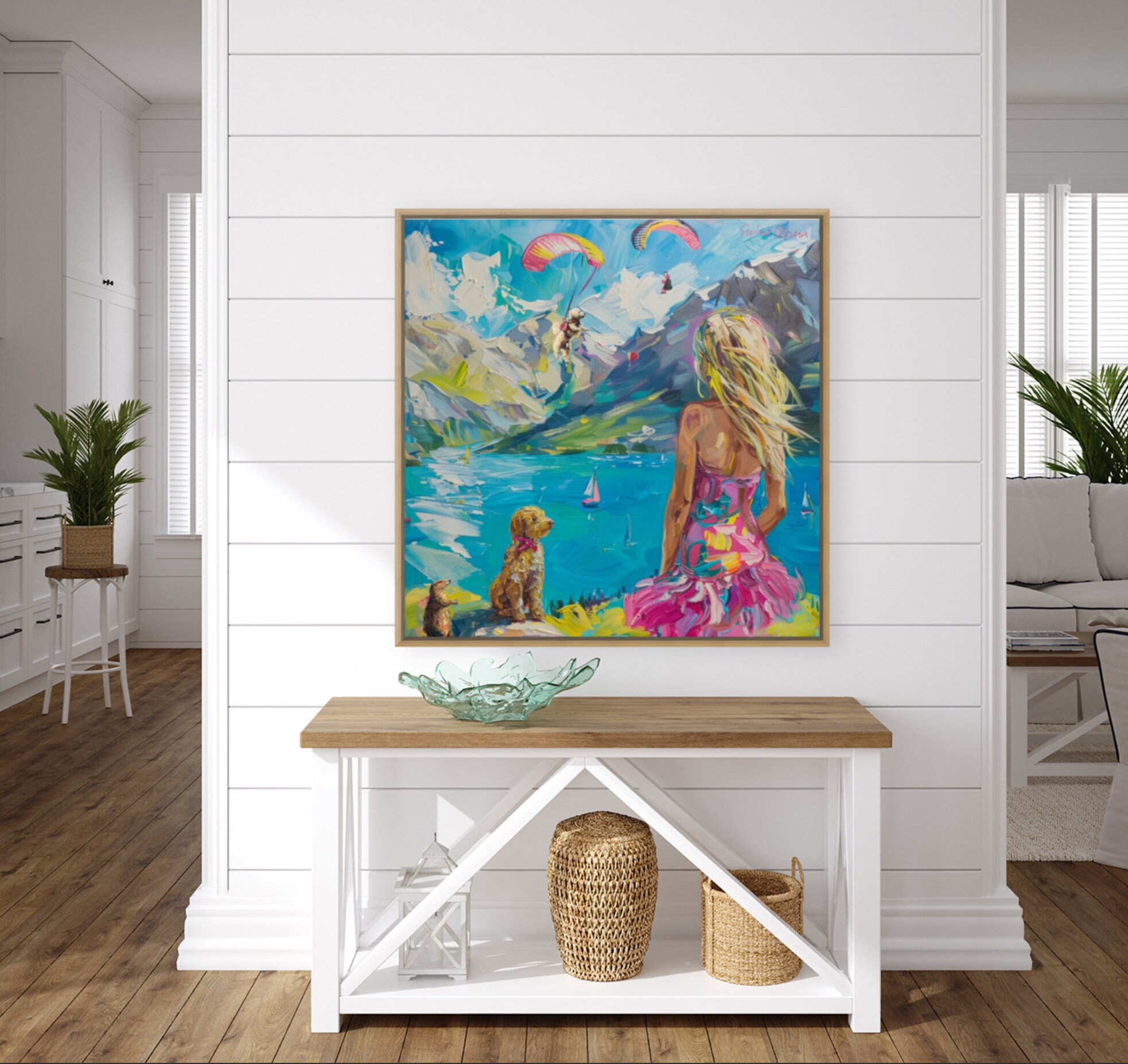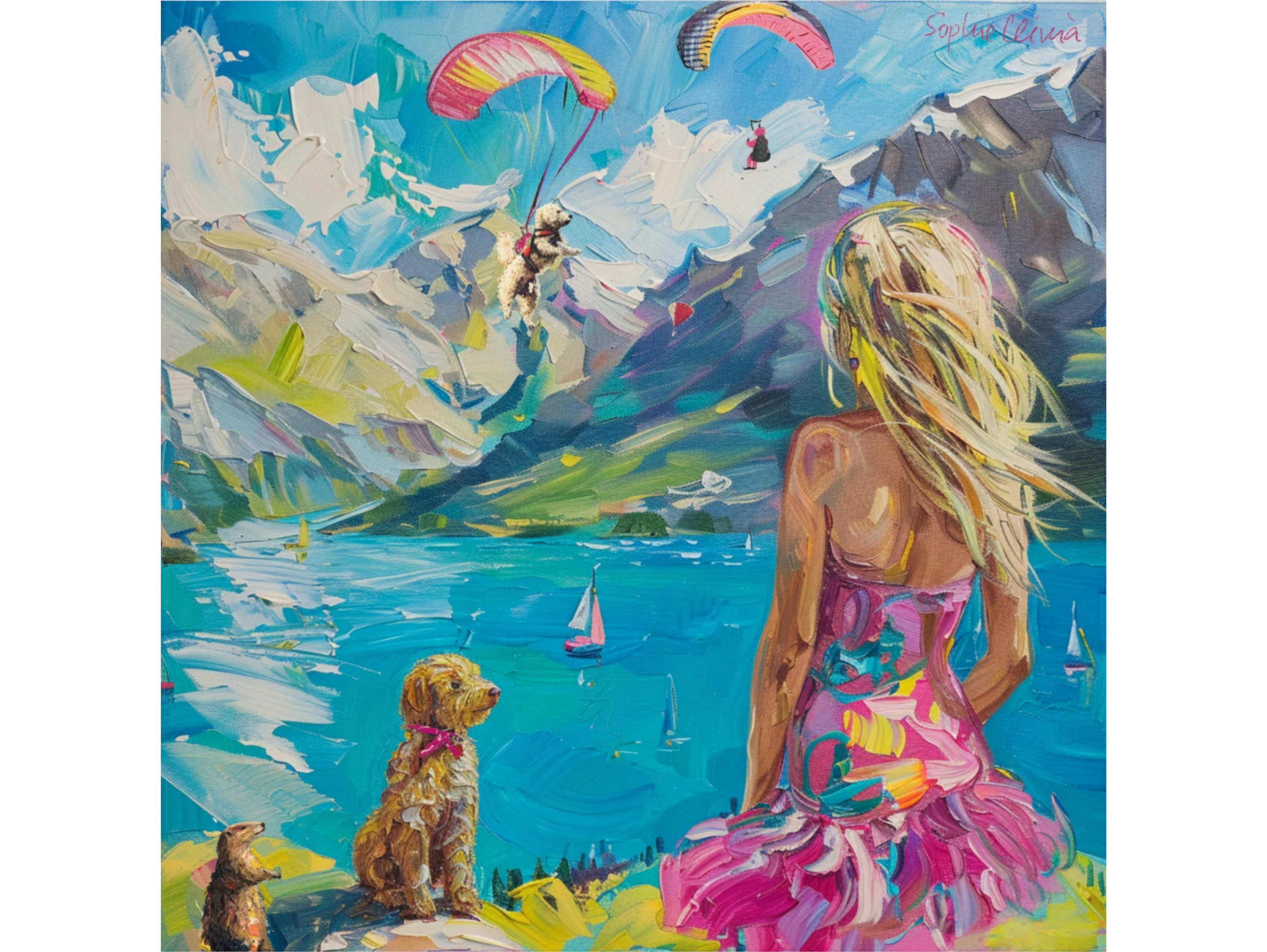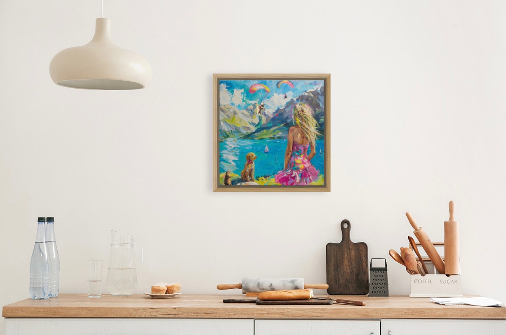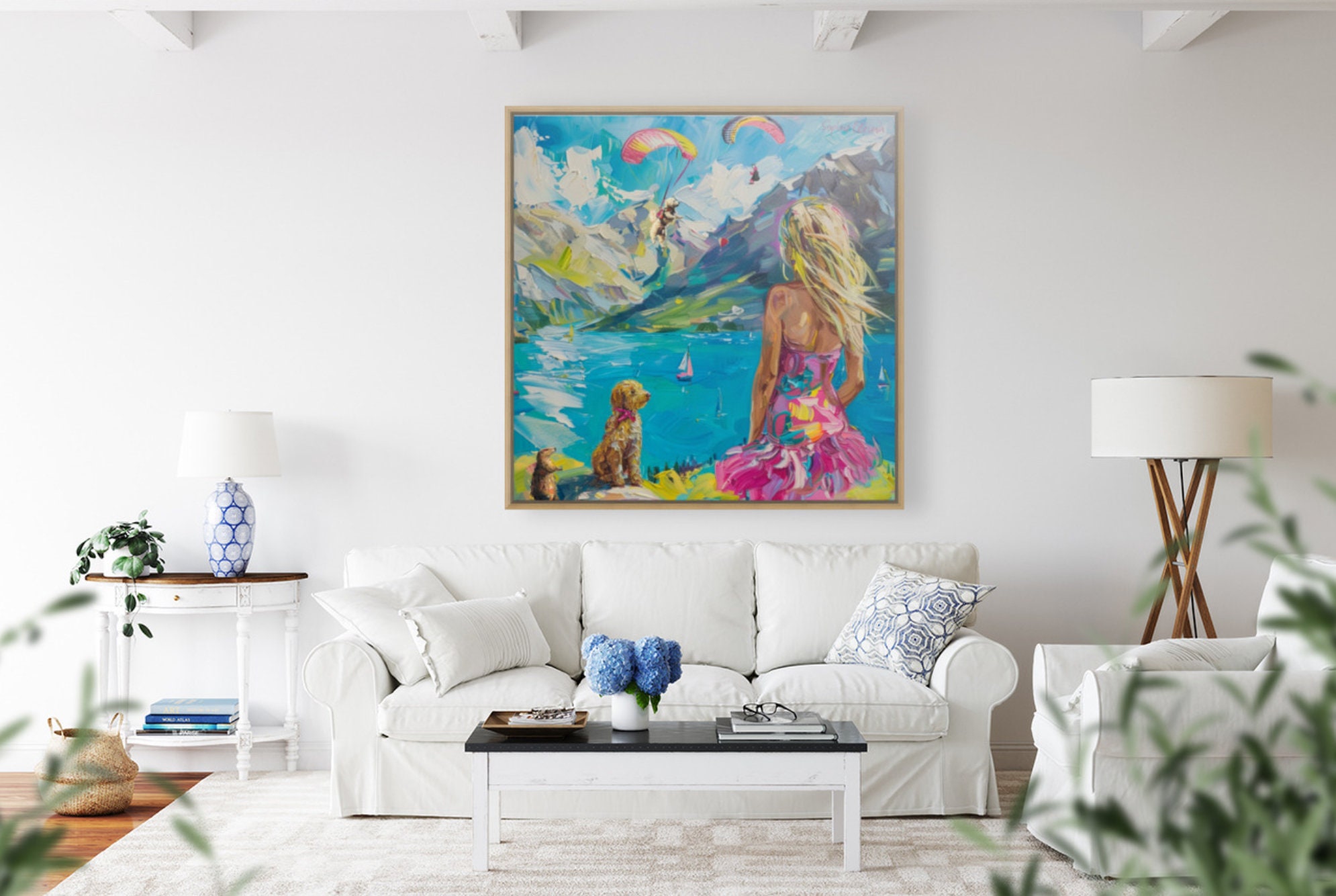 Grandmillennial art, Watching Paragliders in Annecy , whimsical fine art