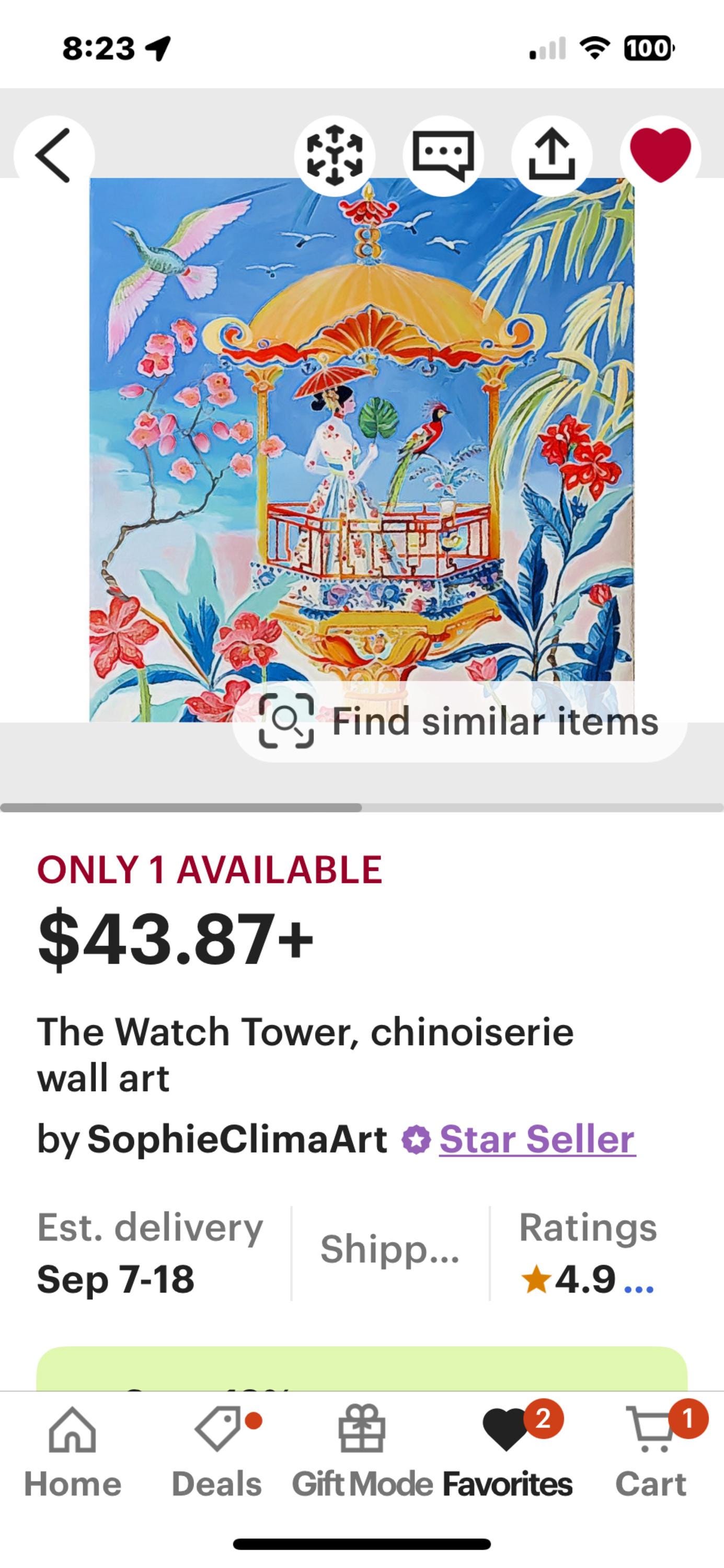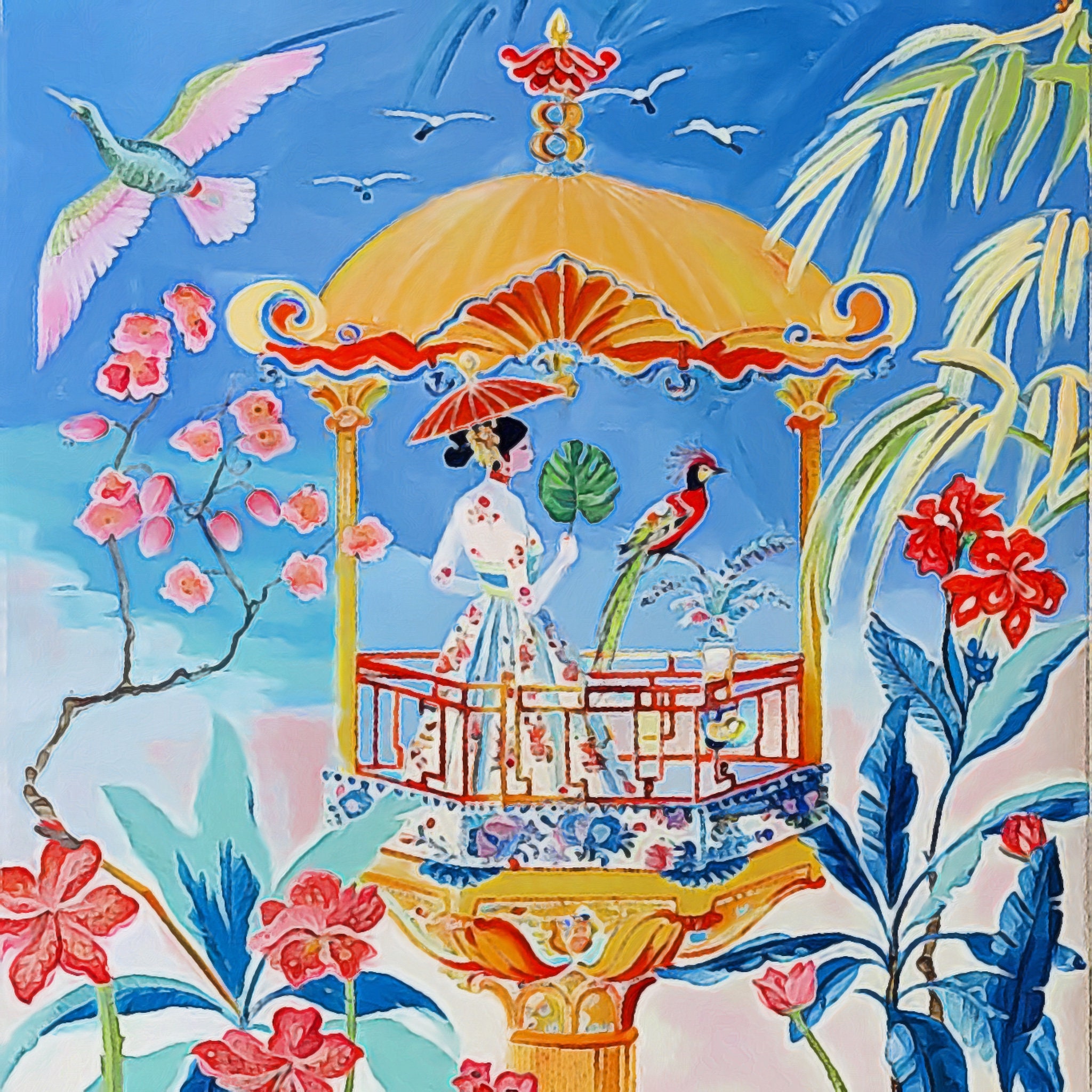 Sophie's art is the modern interpretation of Chinese artistic traditions featuring pagodas, landscapes, blue and white porcelain, ginger jars, pagodas, cheetahs and monkeys. Sophie developed her own recognizable style with bright colors and whimsical details.