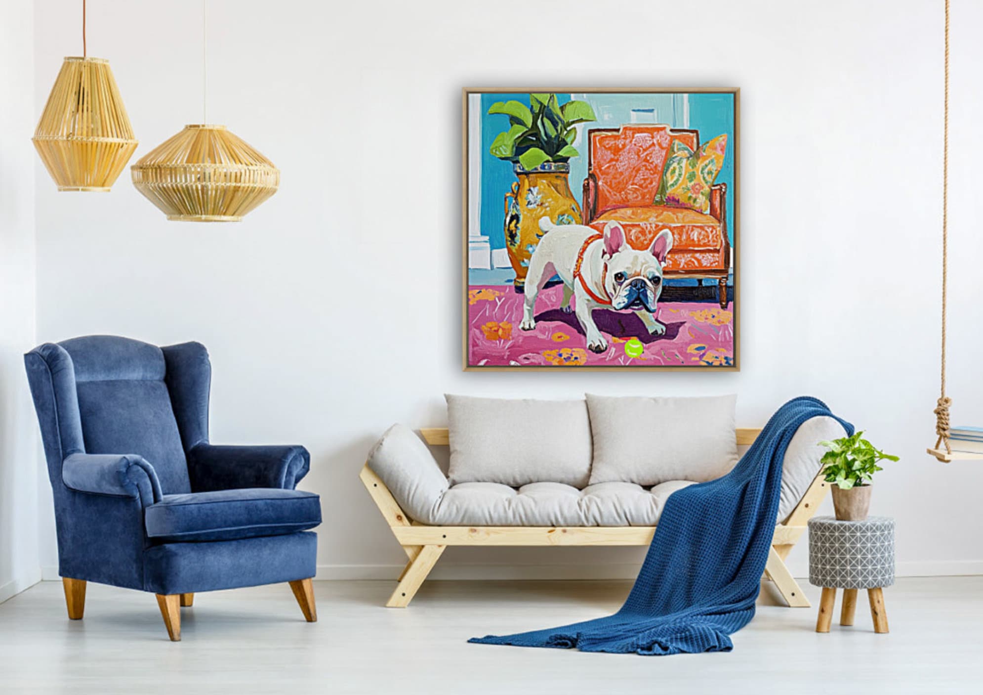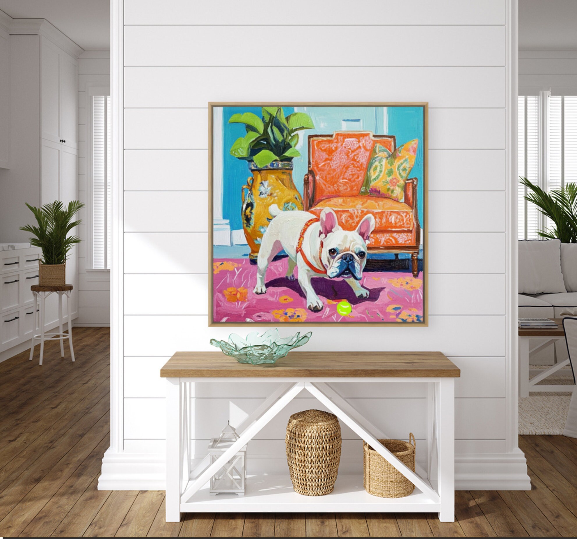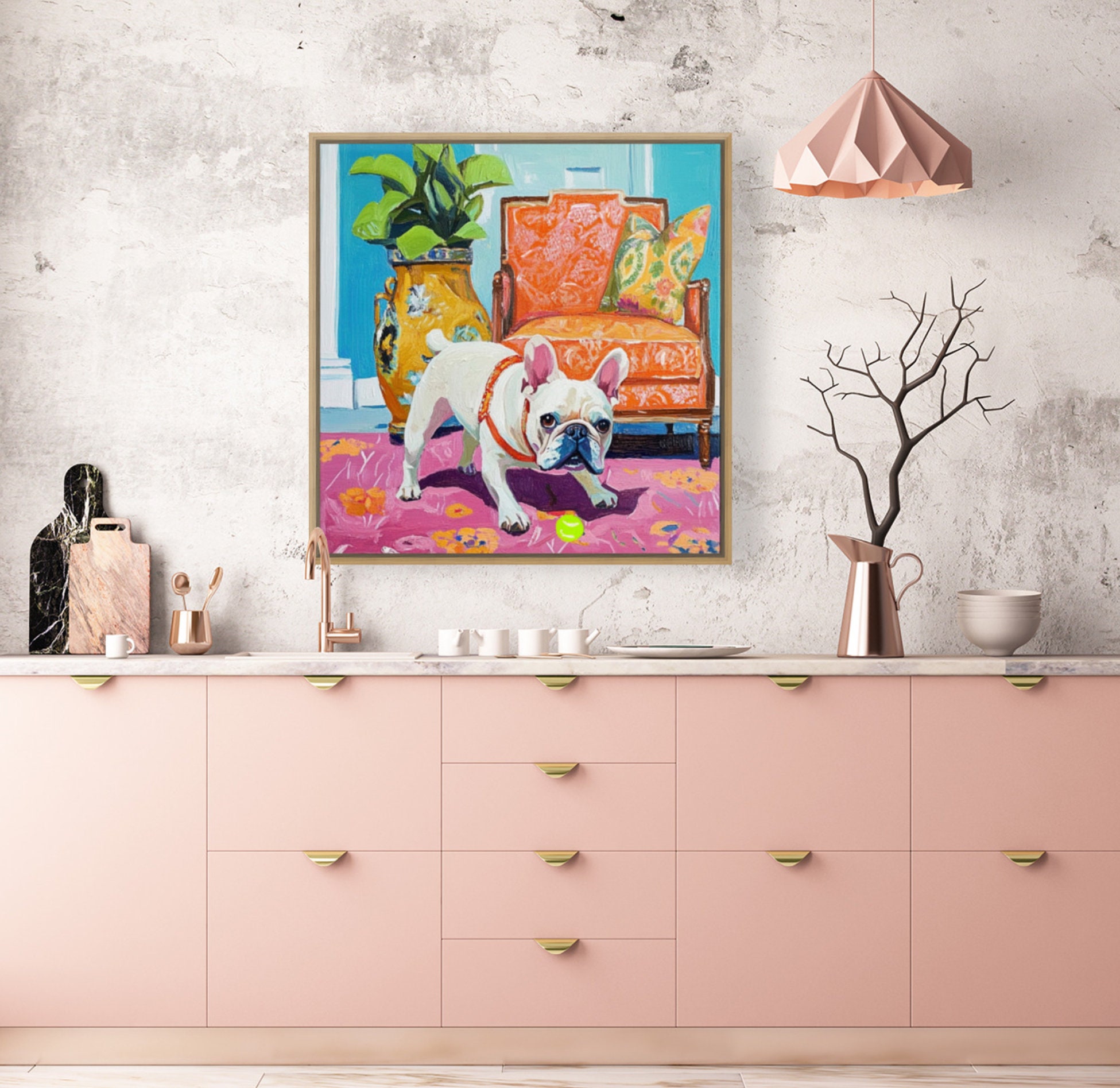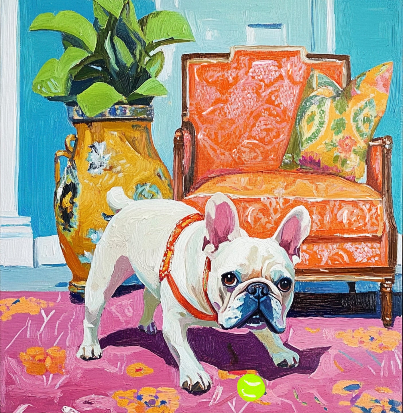 Grandmillennial art, Frenchie and the Orange Chair, whimsical fine art
