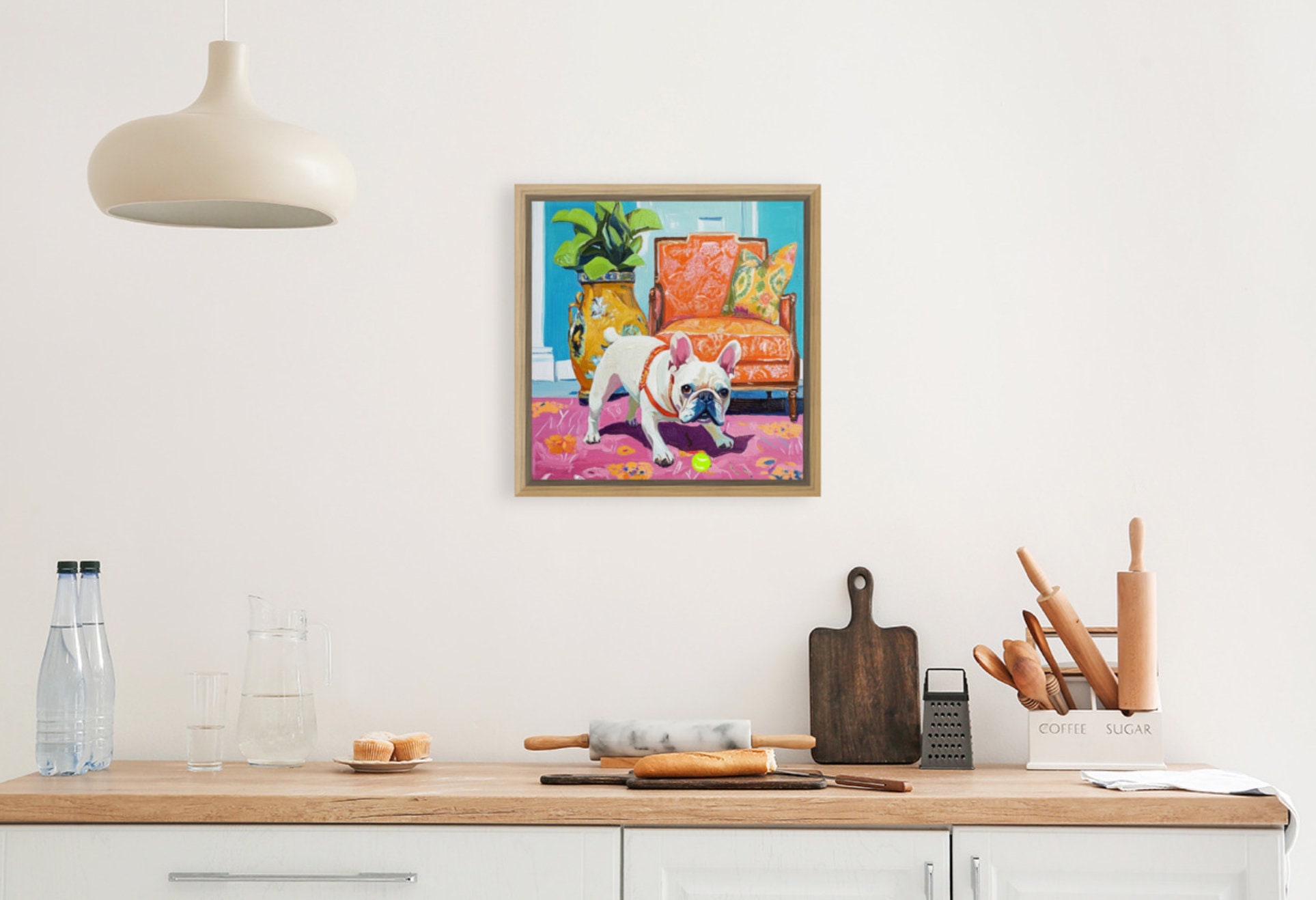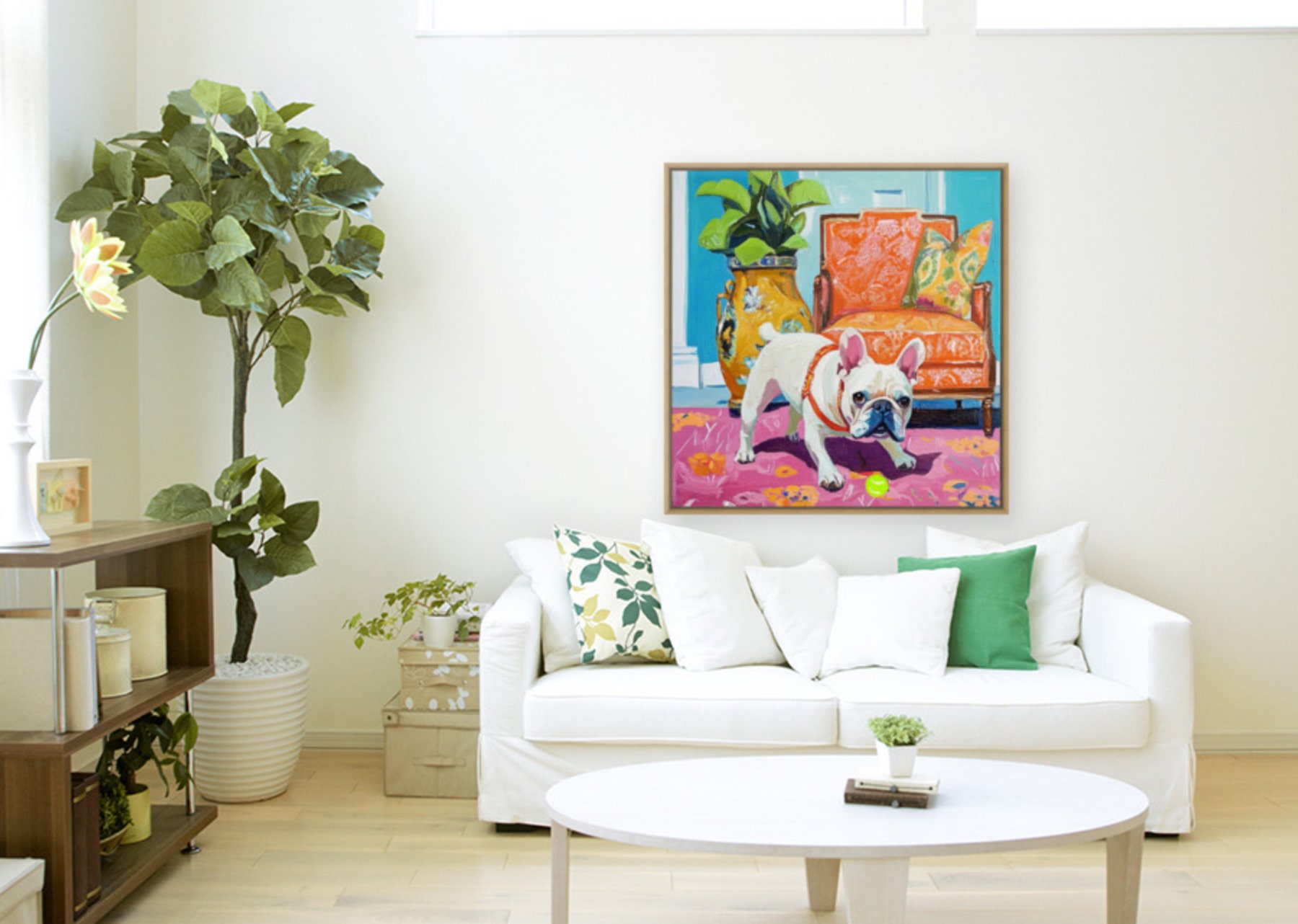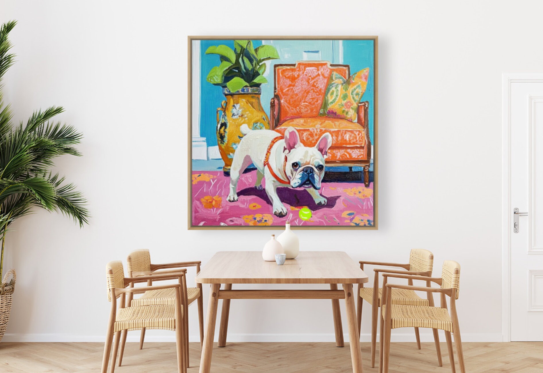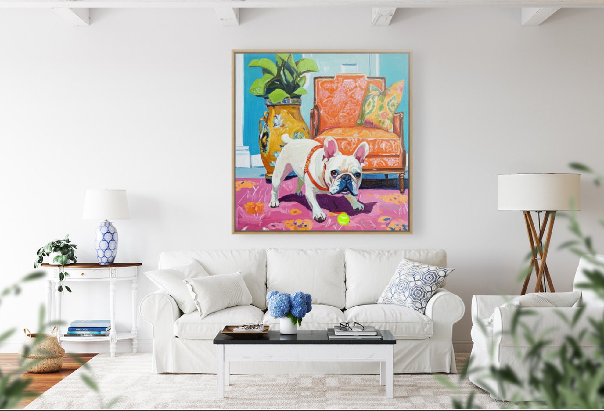 Grandmillennial art, Frenchie and the Orange Chair, whimsical fine art