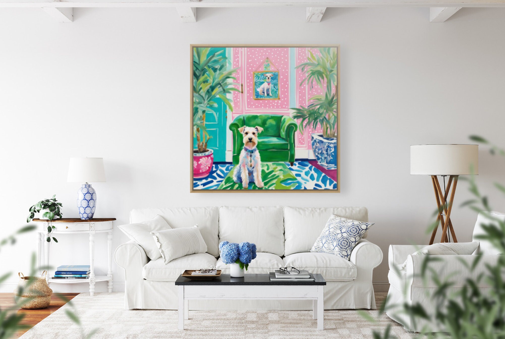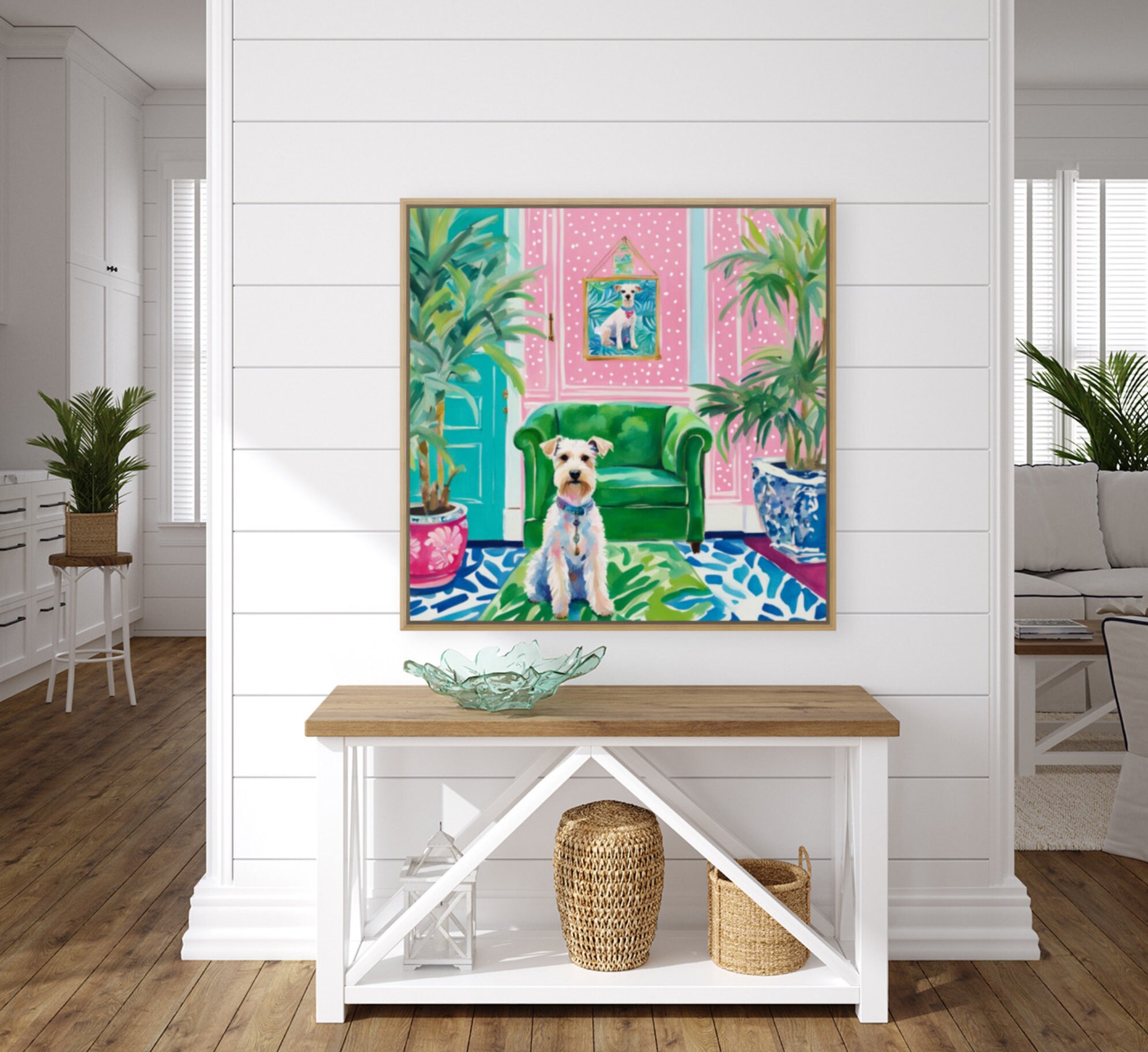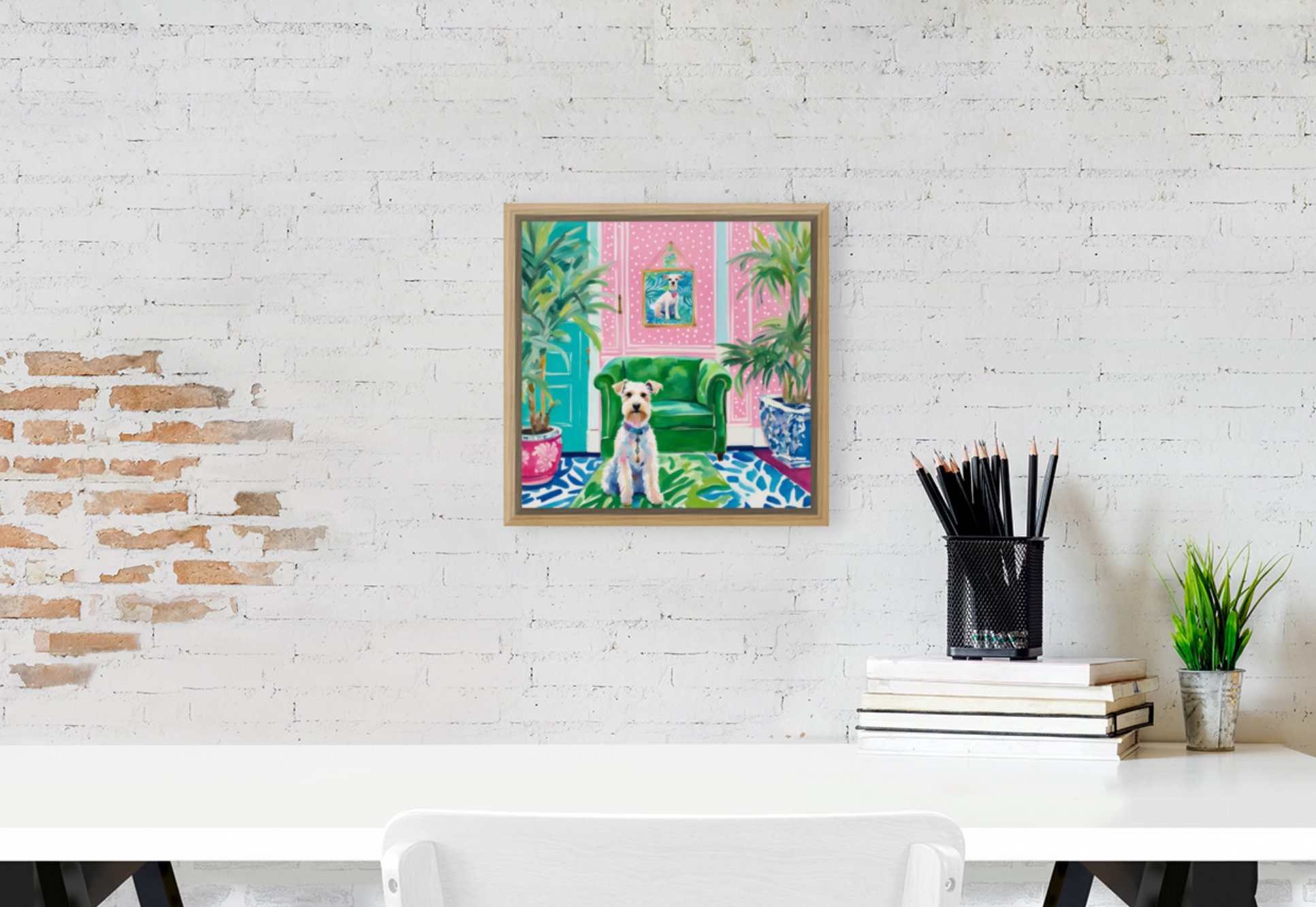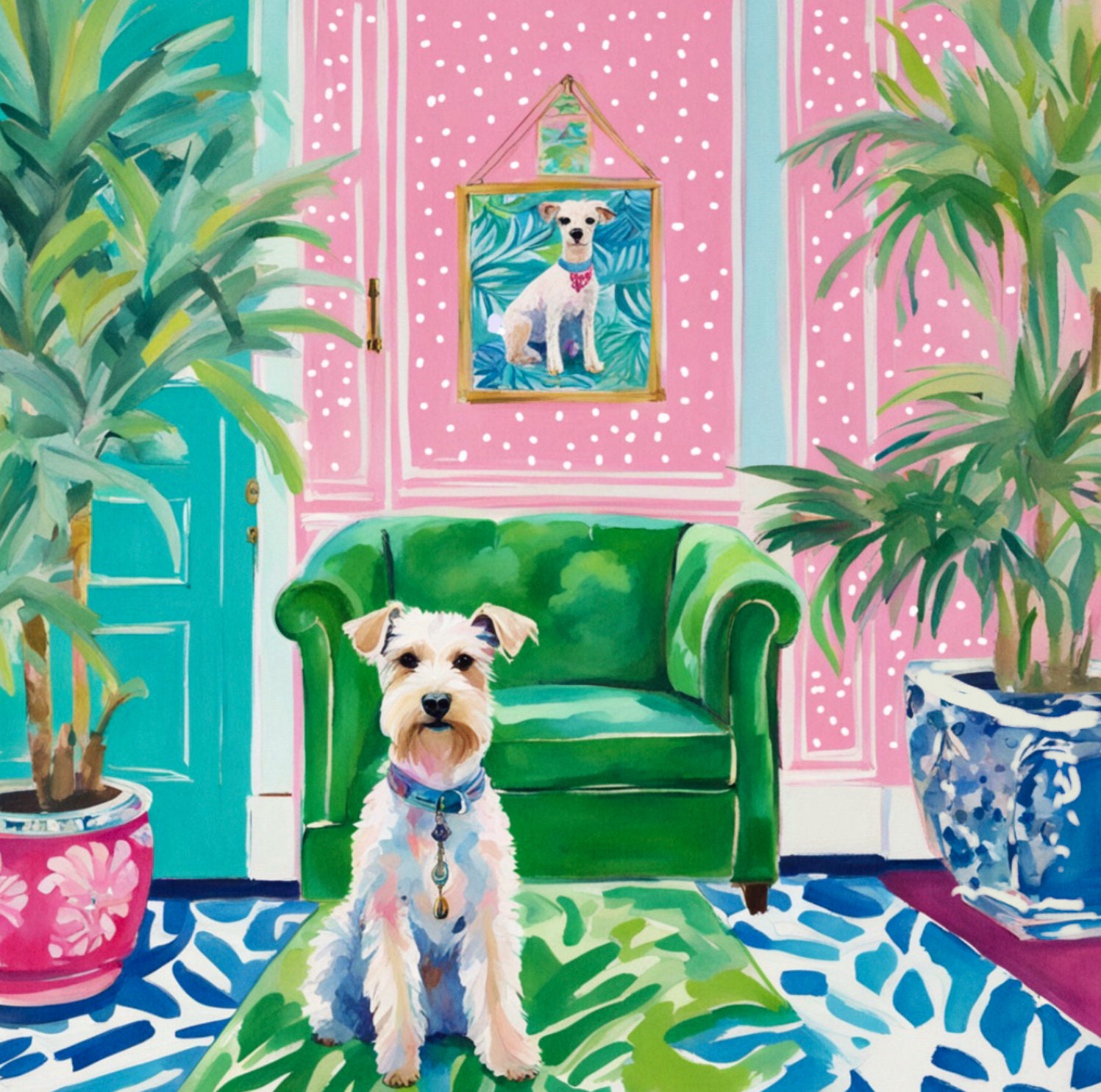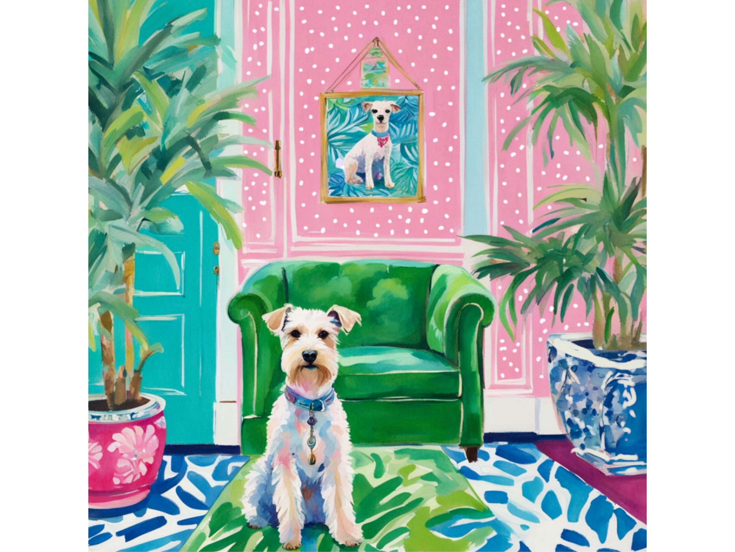 Grandmillennial art, White Wire Terrier in preppy pink and green interior, whimsical art