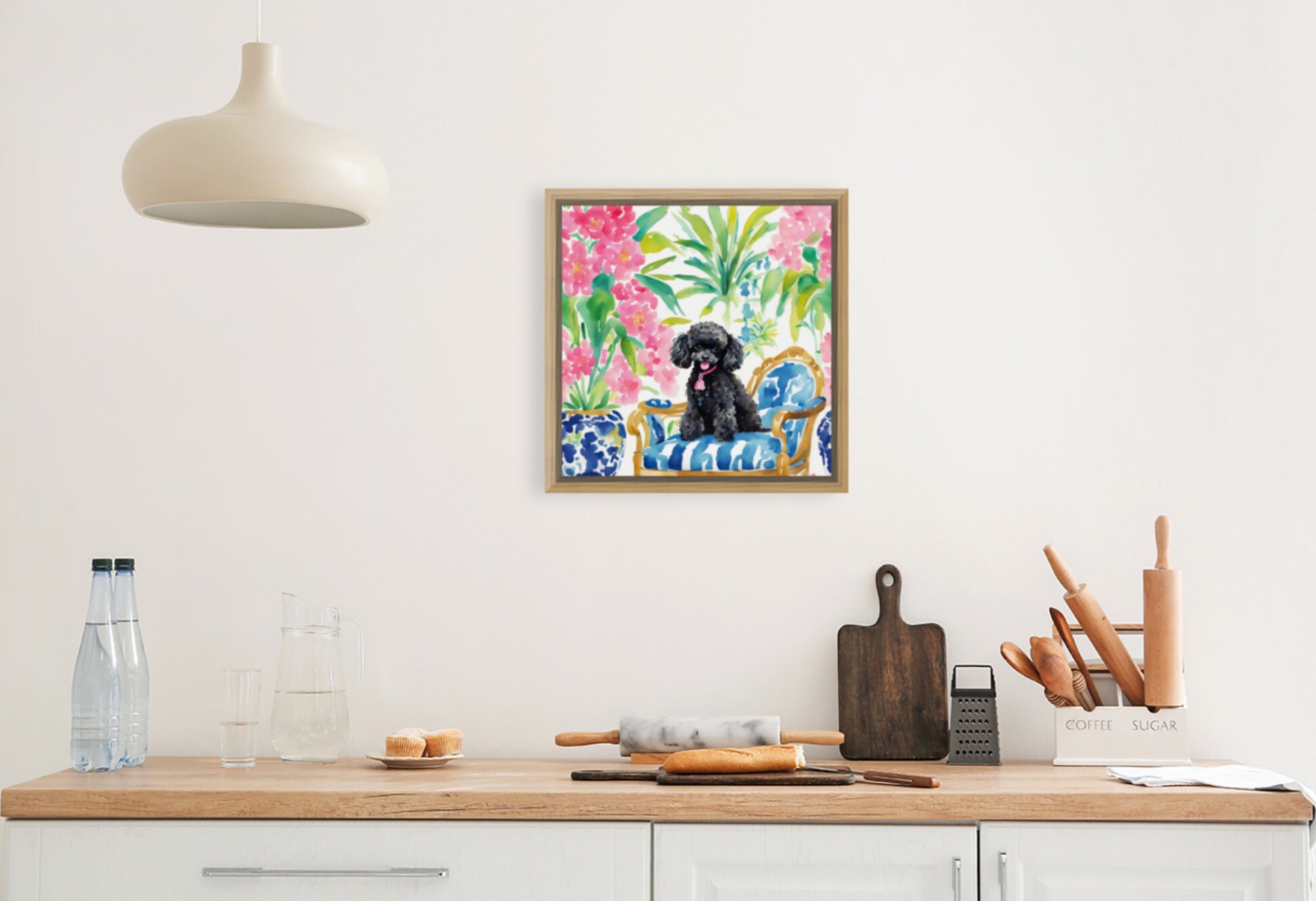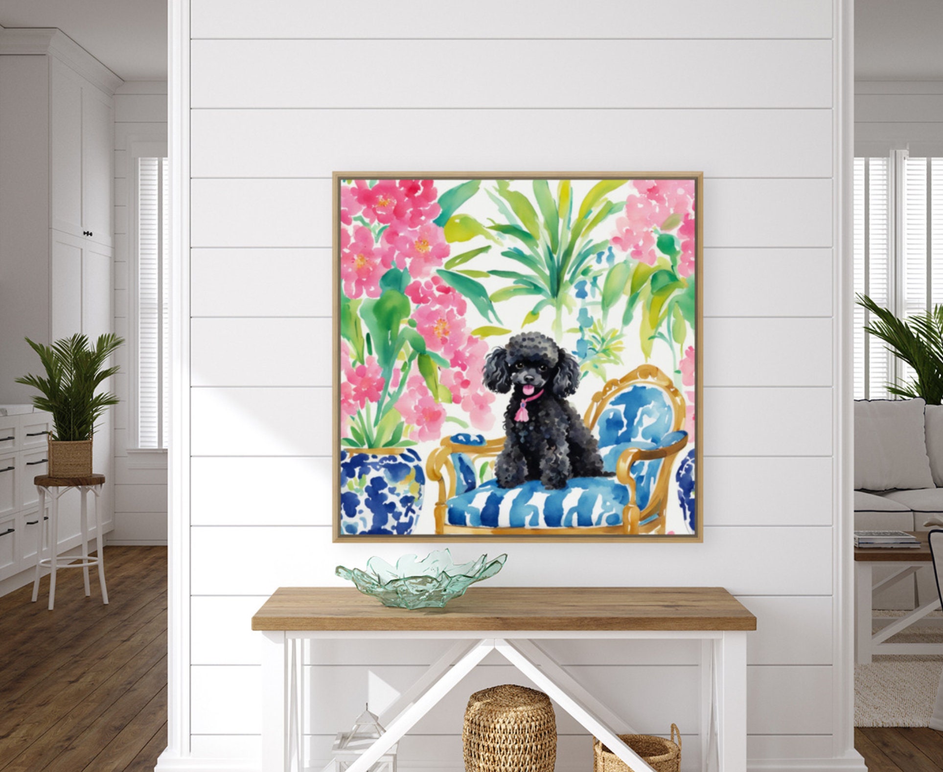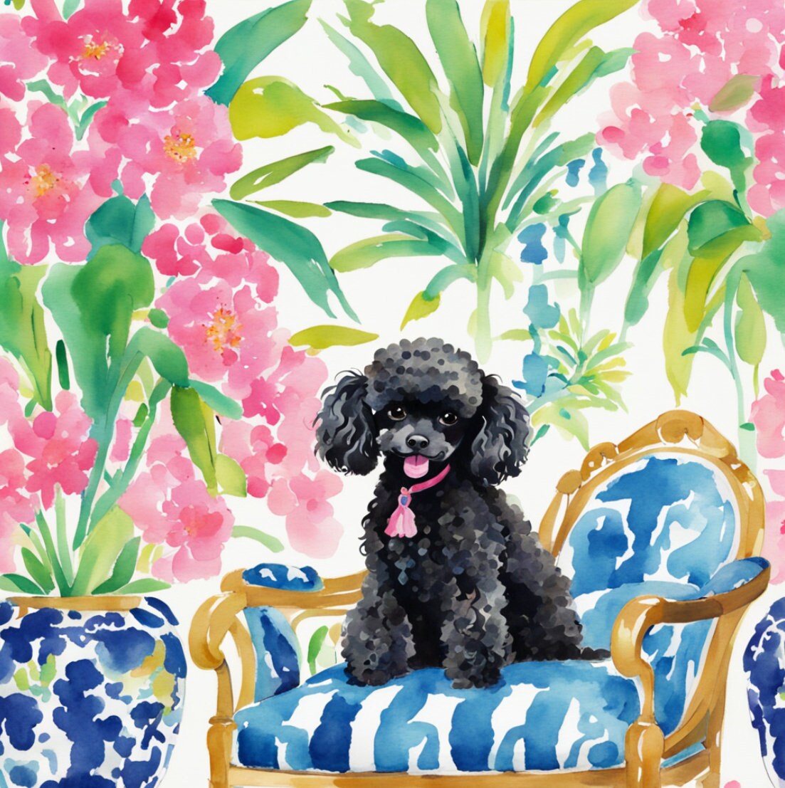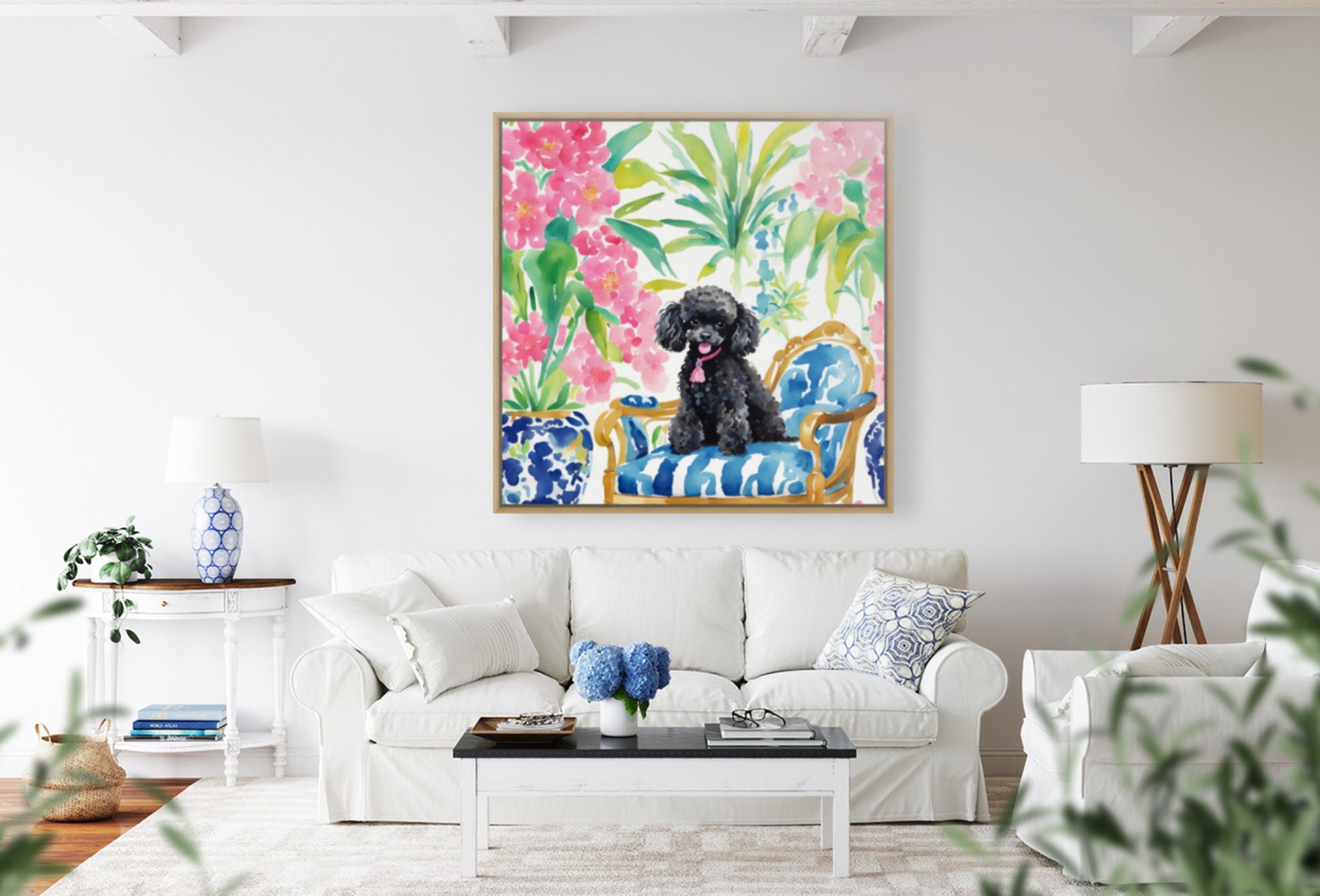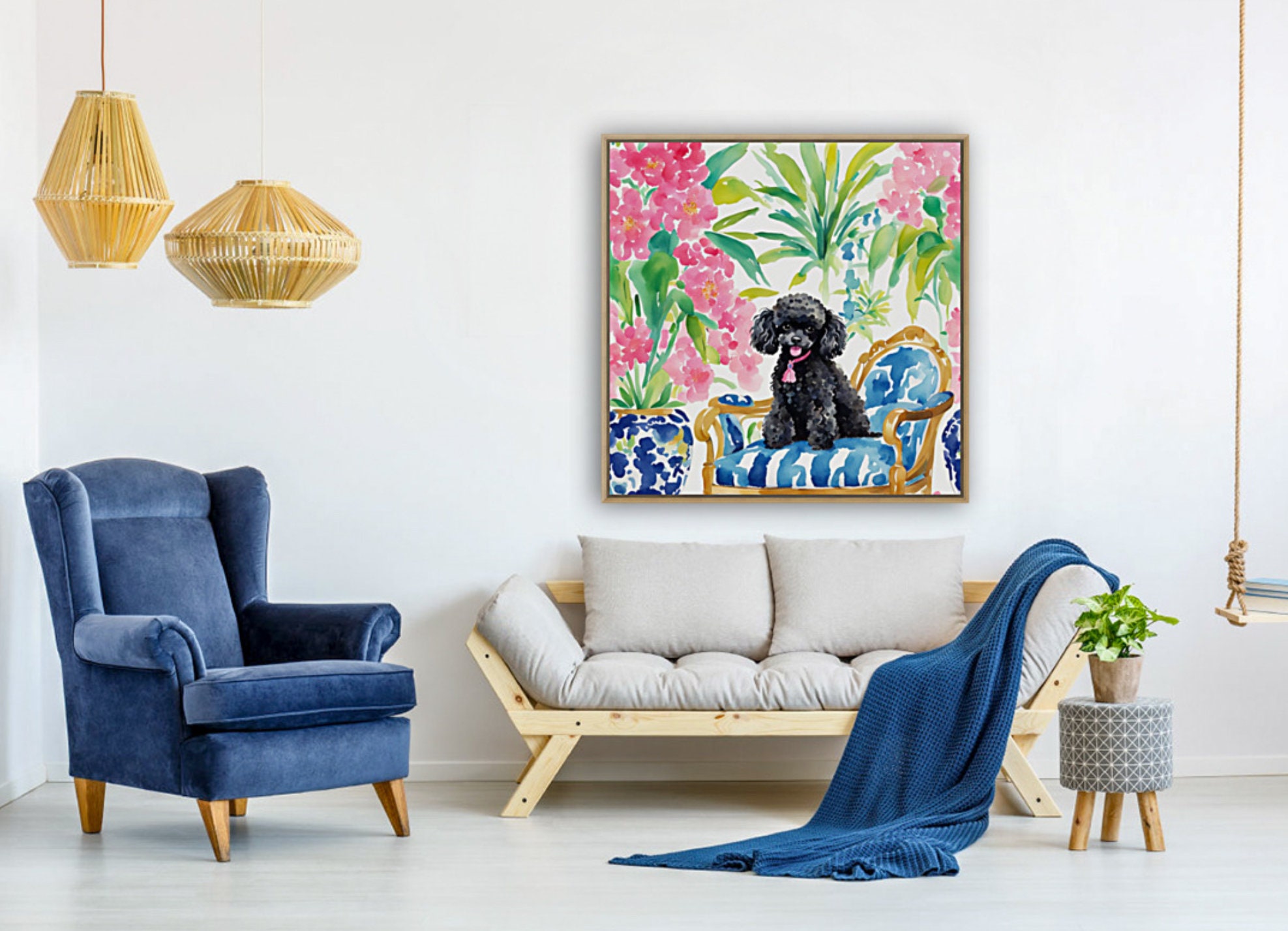 Grandmillennial art, Black Poodle on a Blue Chair, whimsical fine art