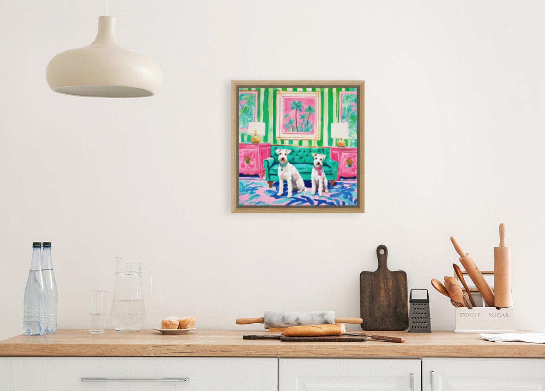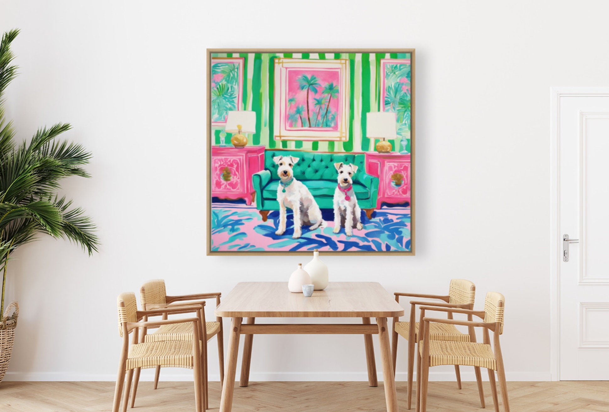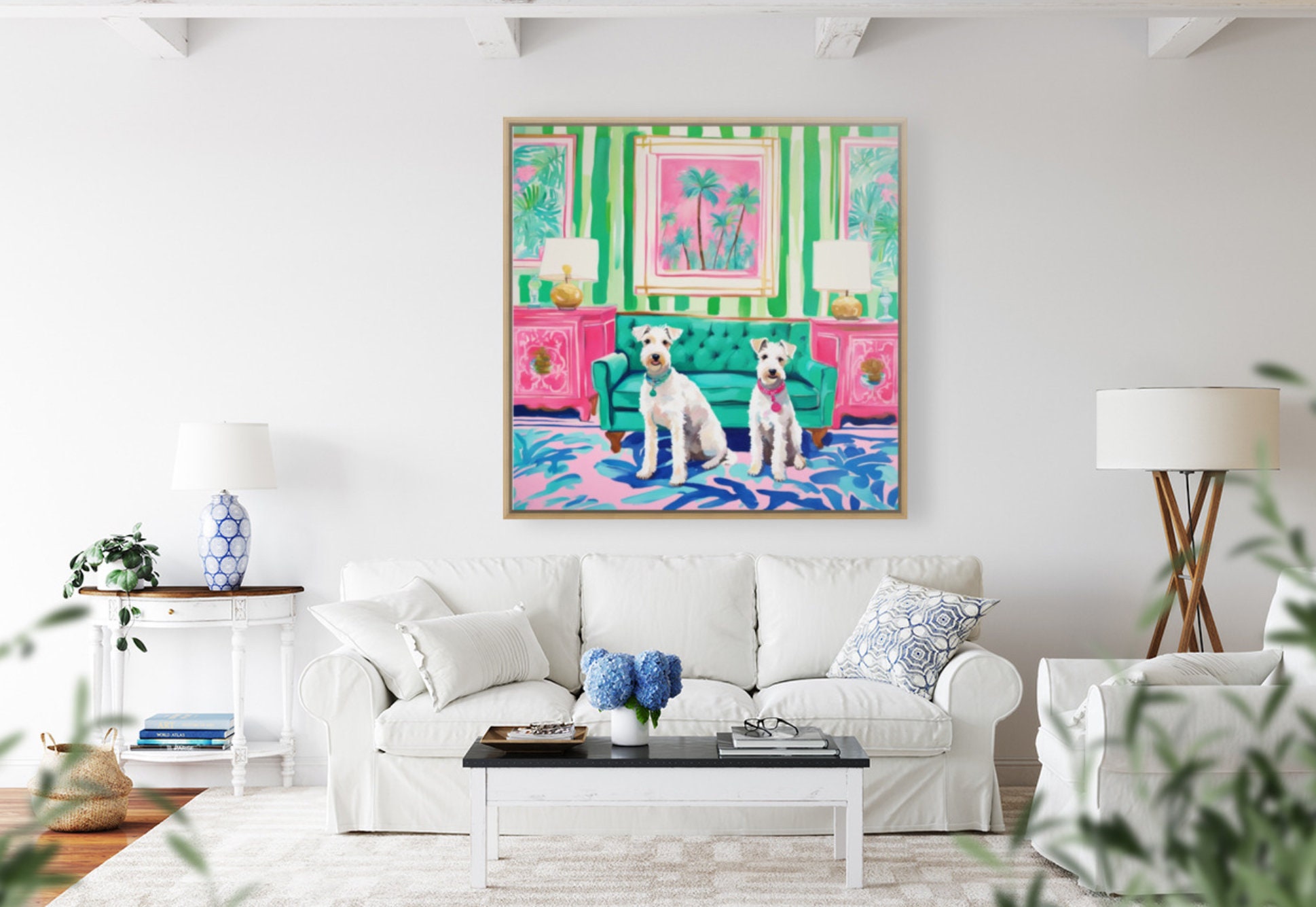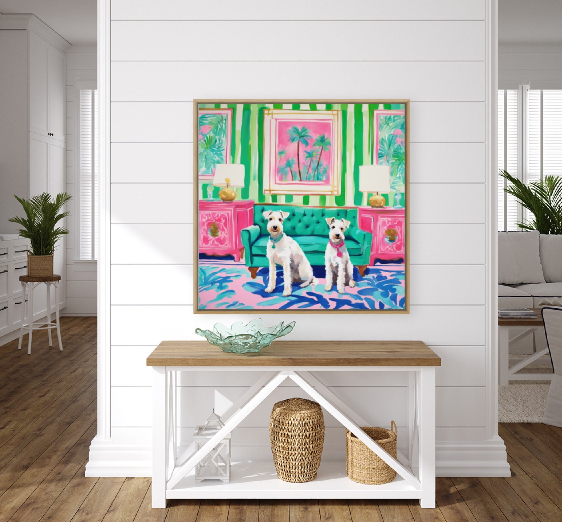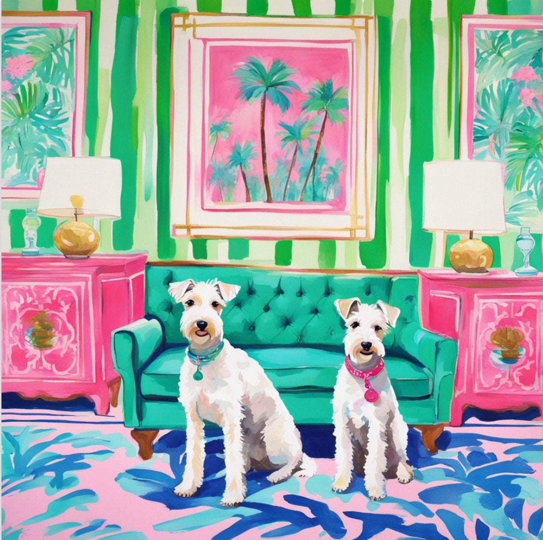 Grandmillennial art, Two White Wire Terriers in preppy Palm Beach interior, whimsical art