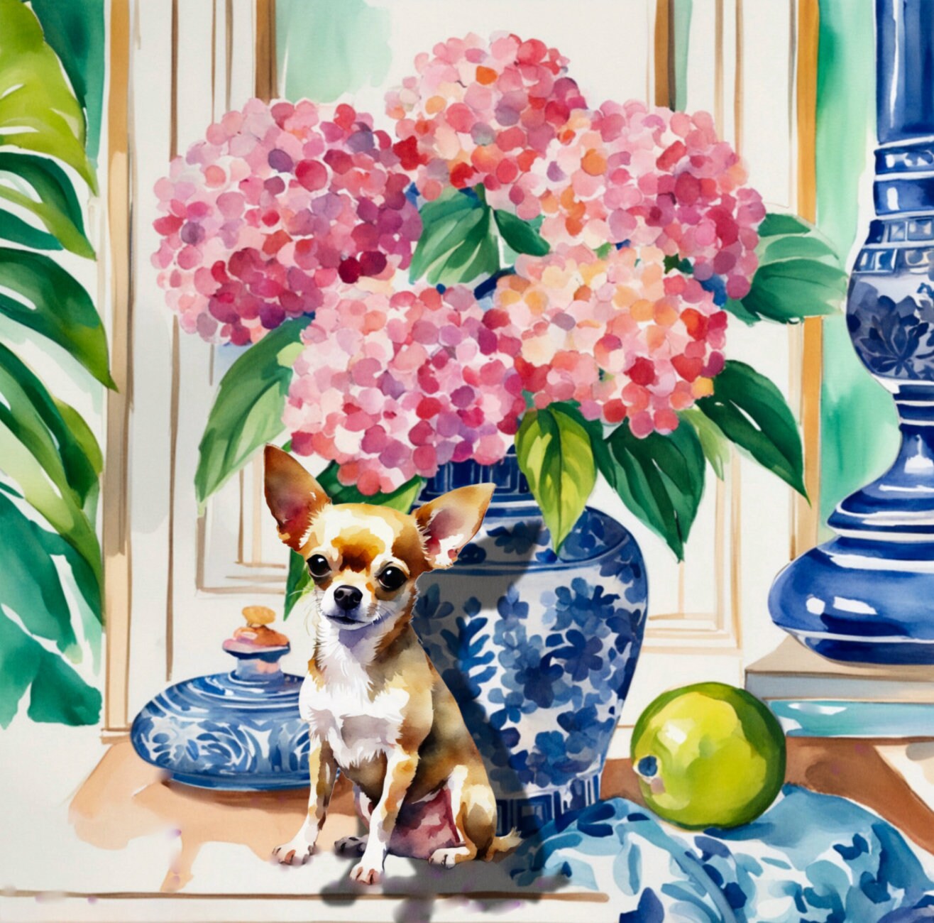 Grandmillennial art, Chihuahua pup and pink hydrangea, whimsical fine art