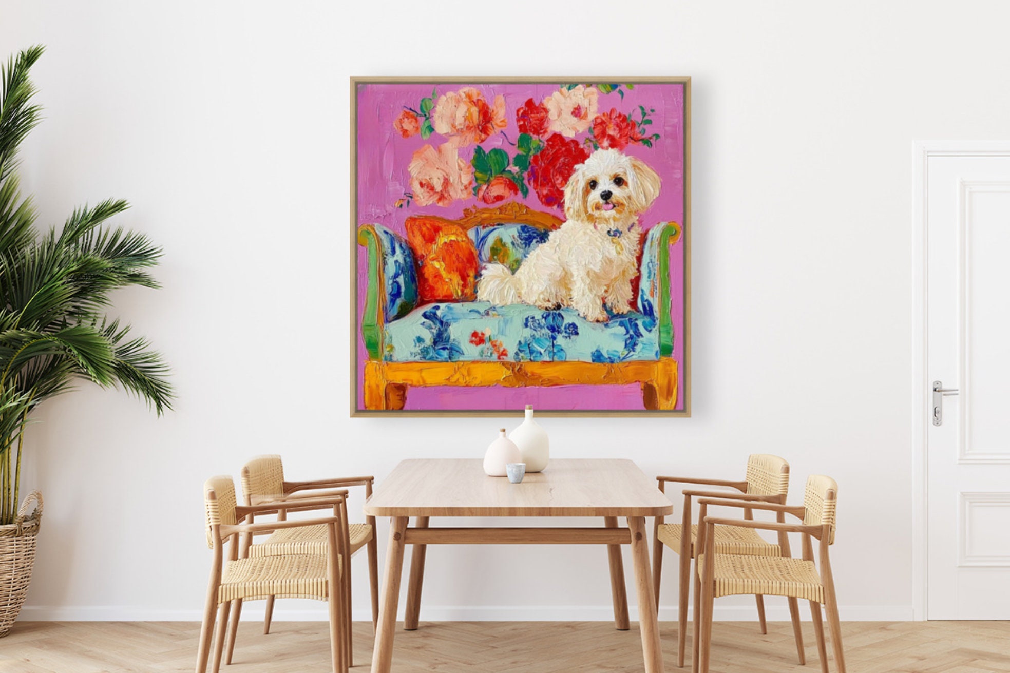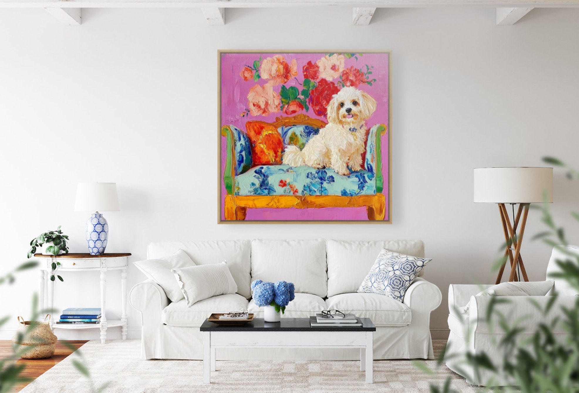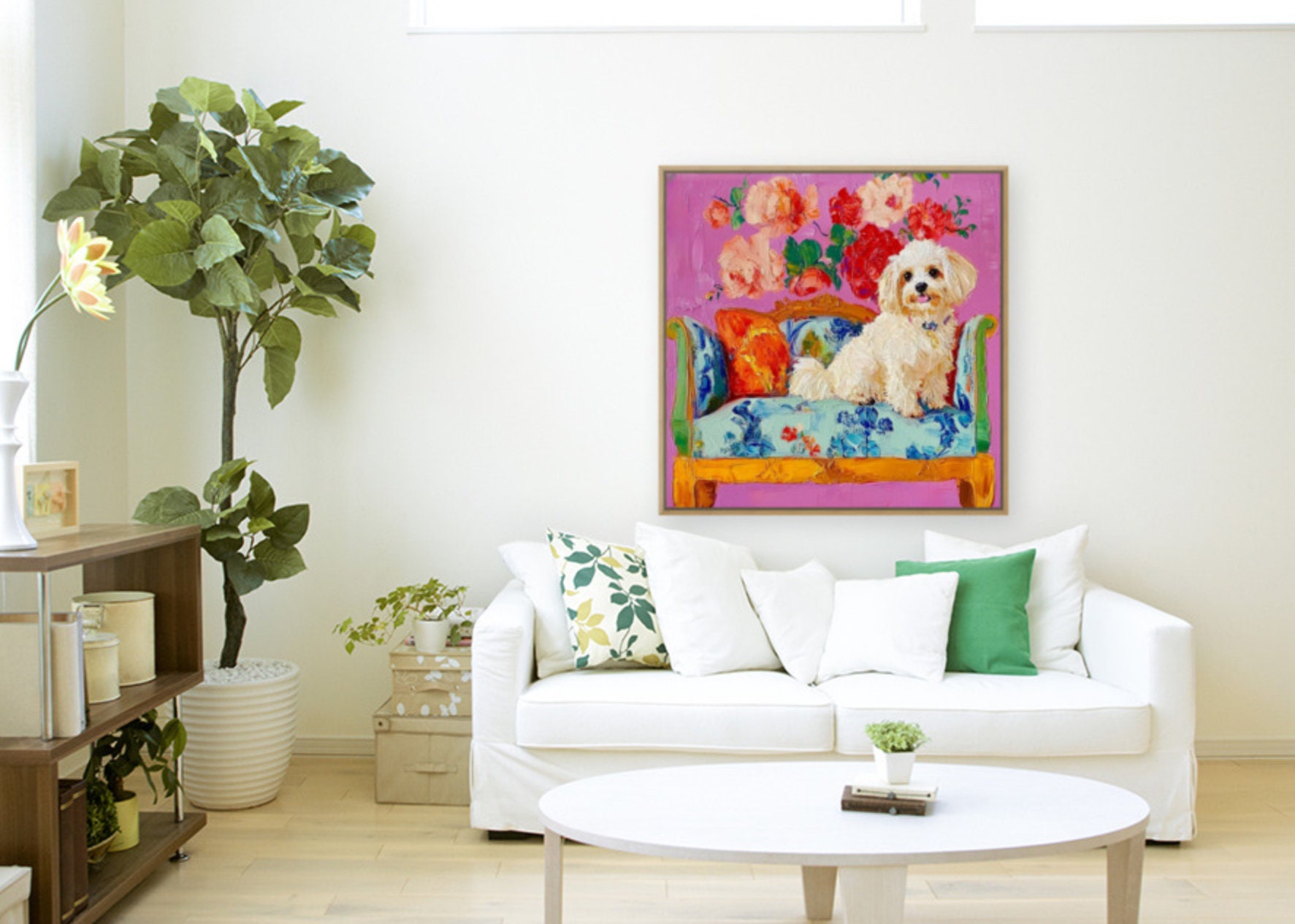 Grandmillennial art, Terrier on a Blue Sofa, whimsical fine art