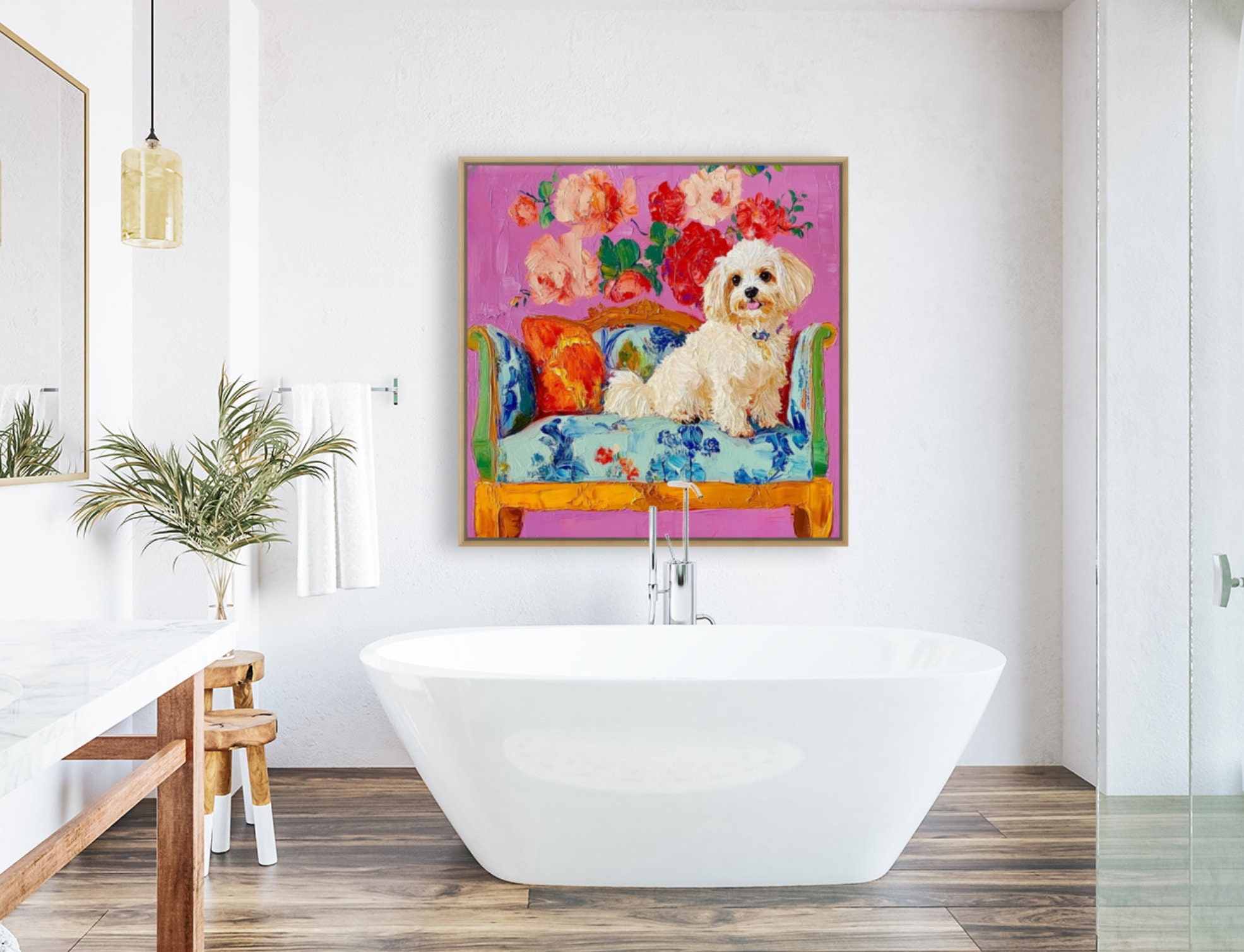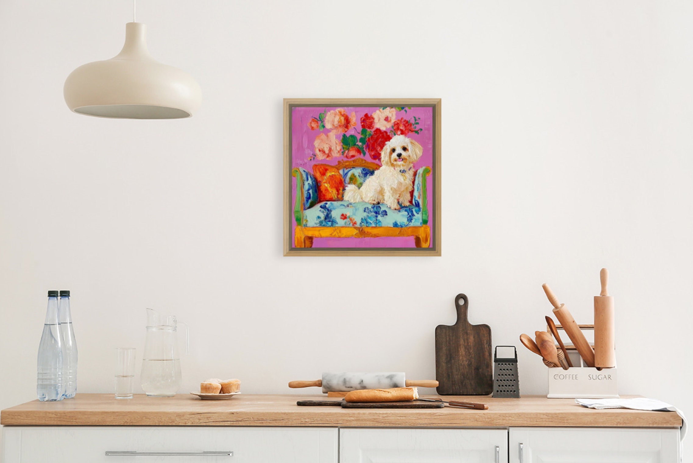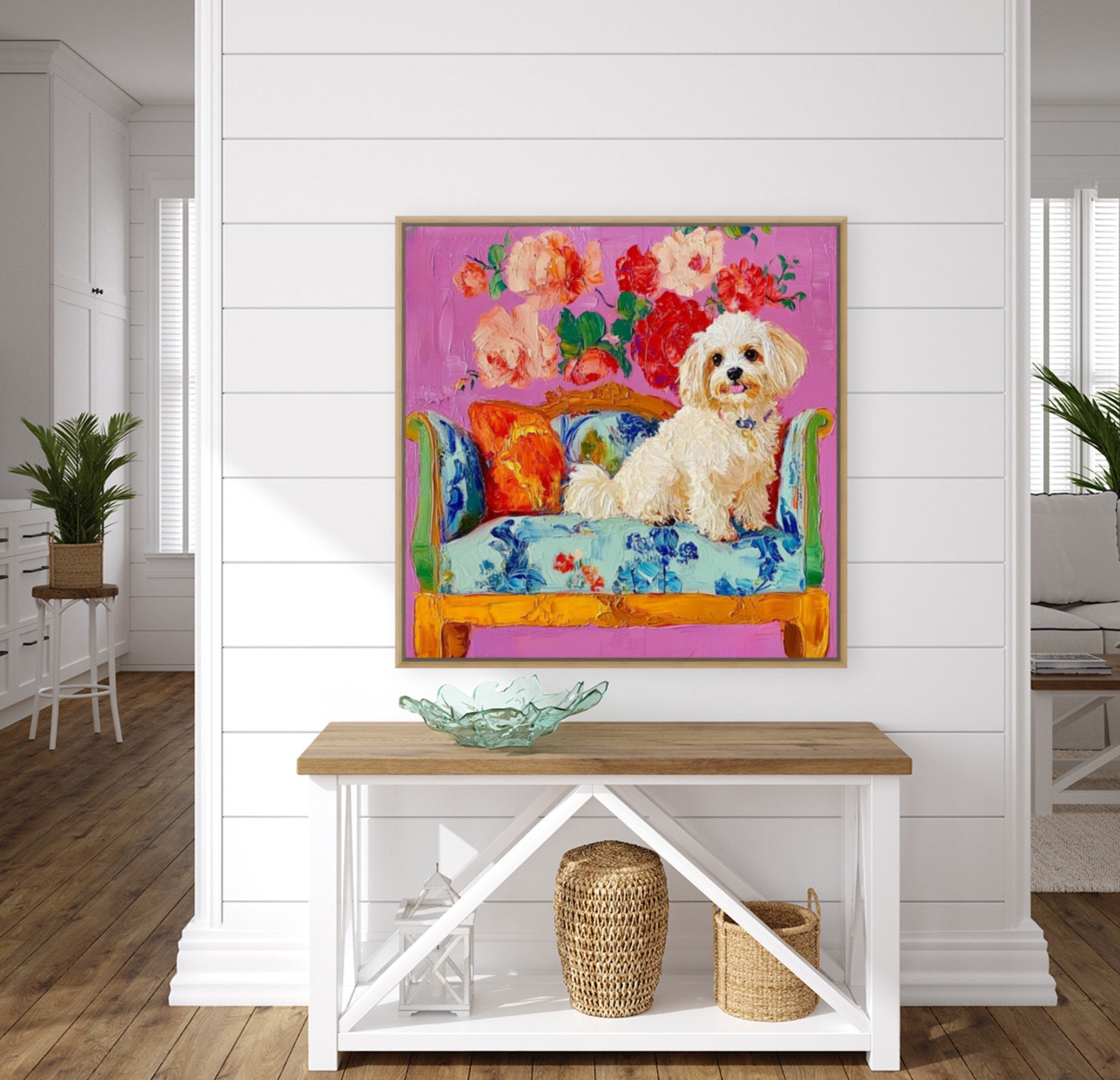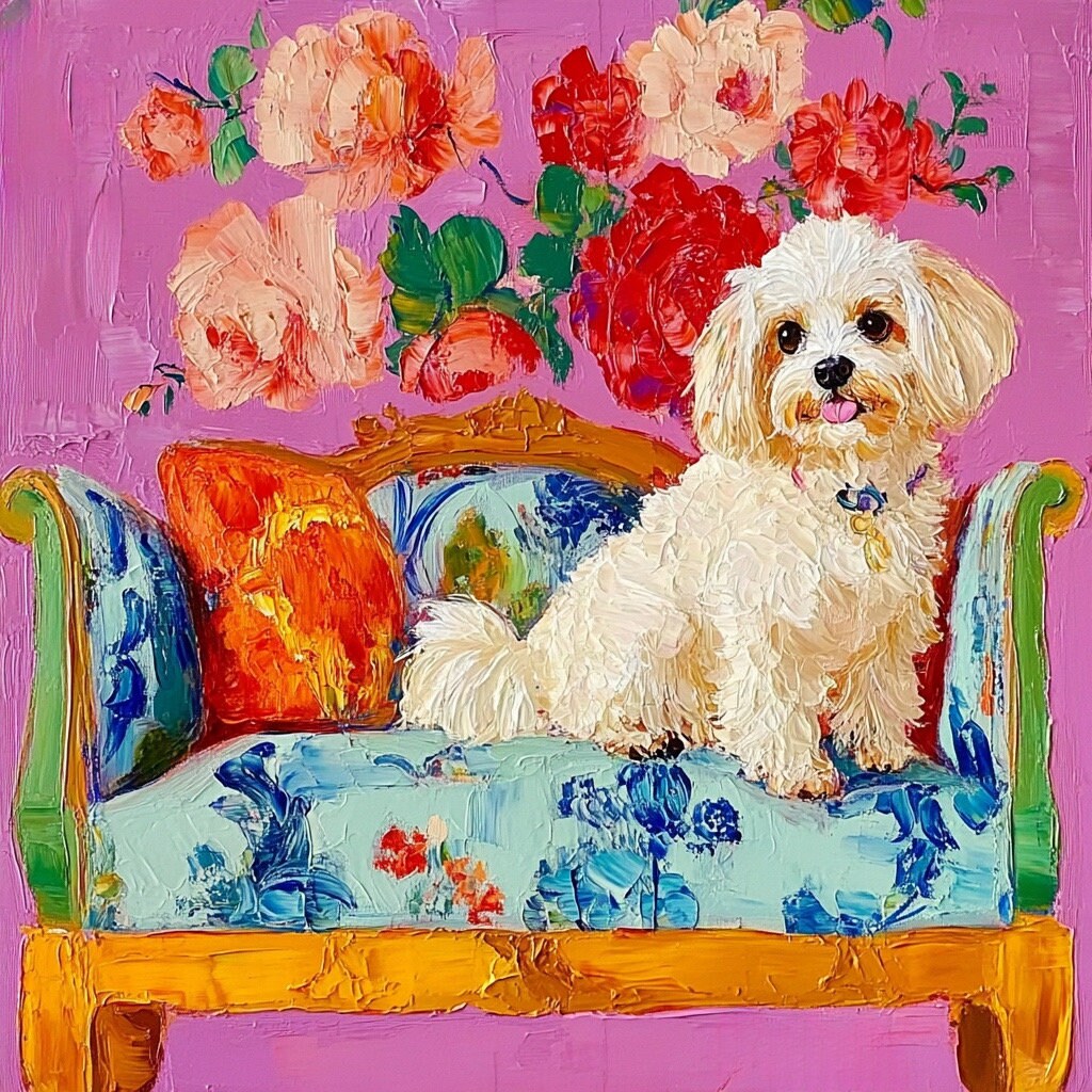 Grandmillennial art, Terrier on a Blue Sofa, whimsical fine art