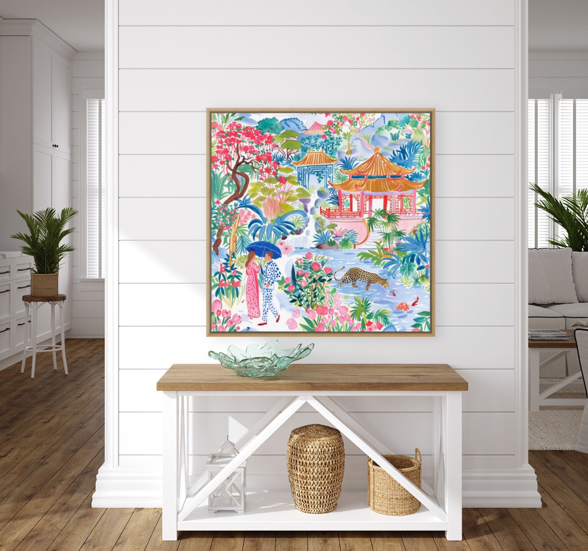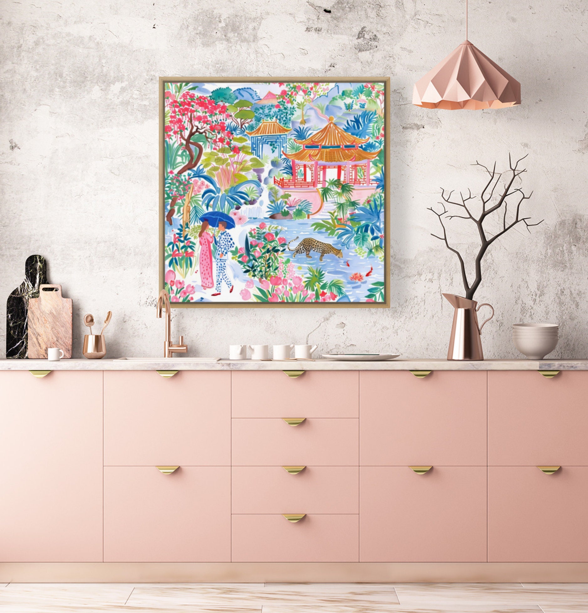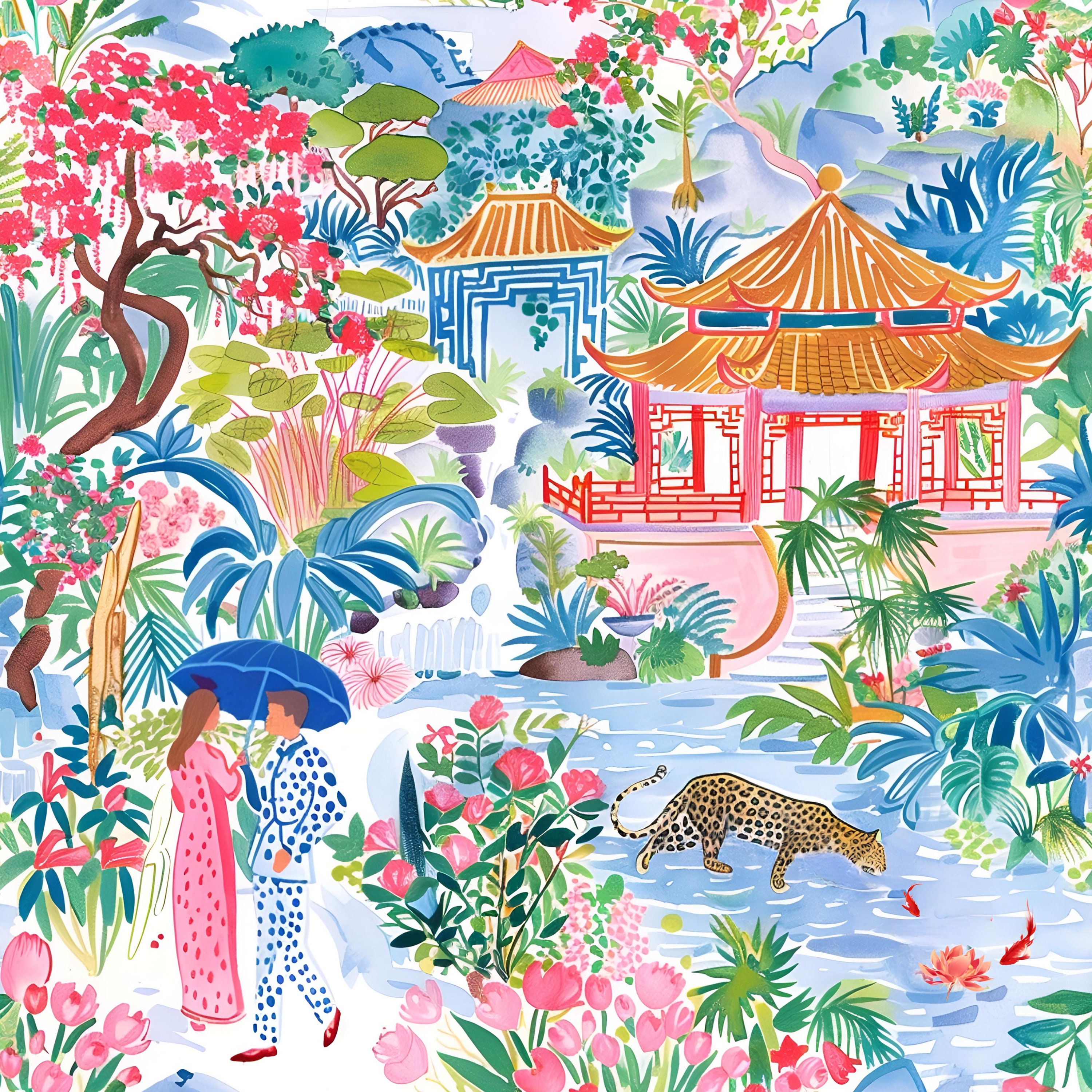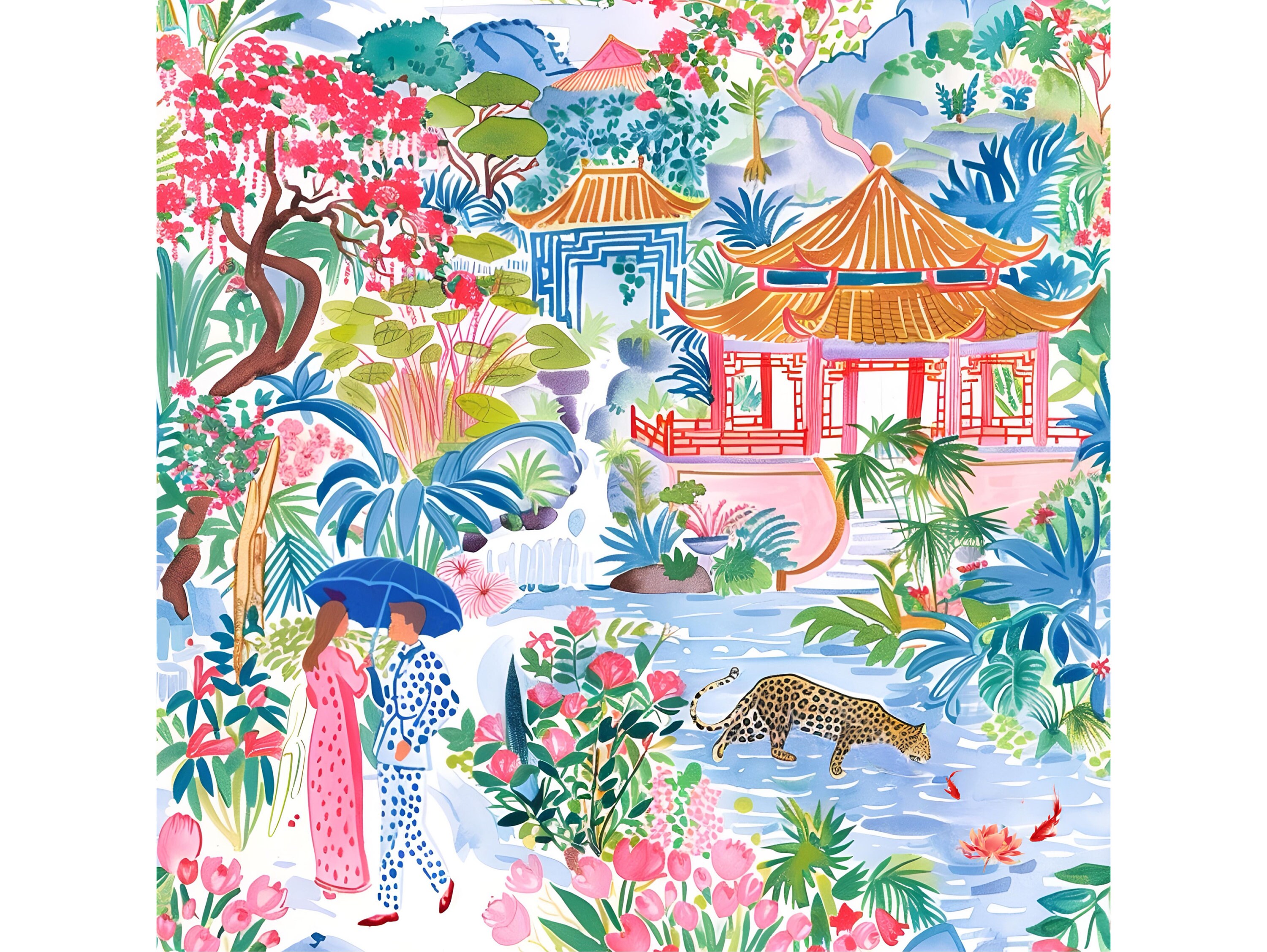 Grandmillennial art, Meeting in Pagoda Garden, chinoiserie art print
