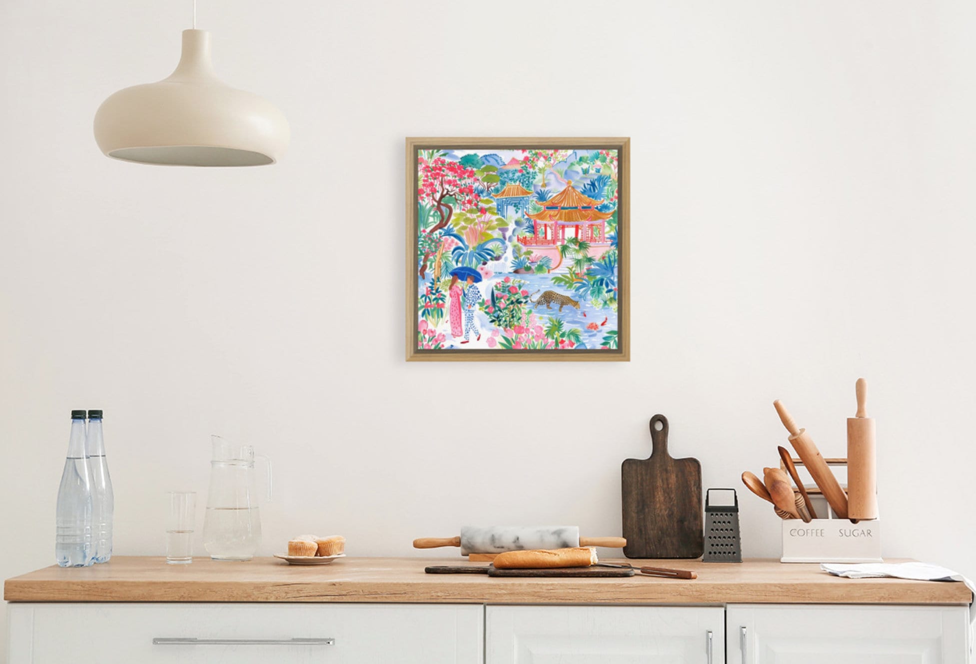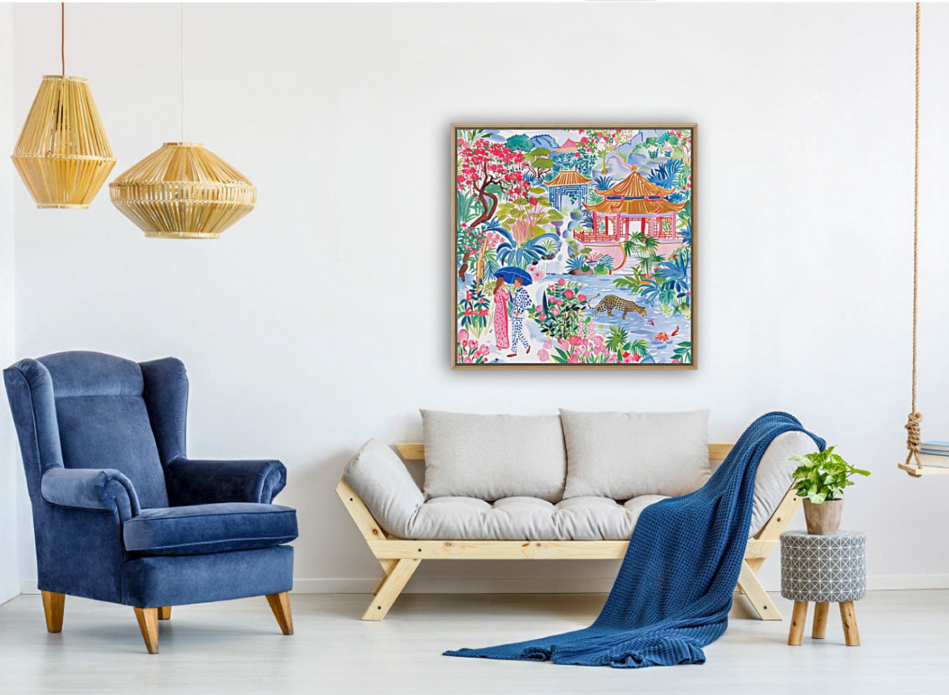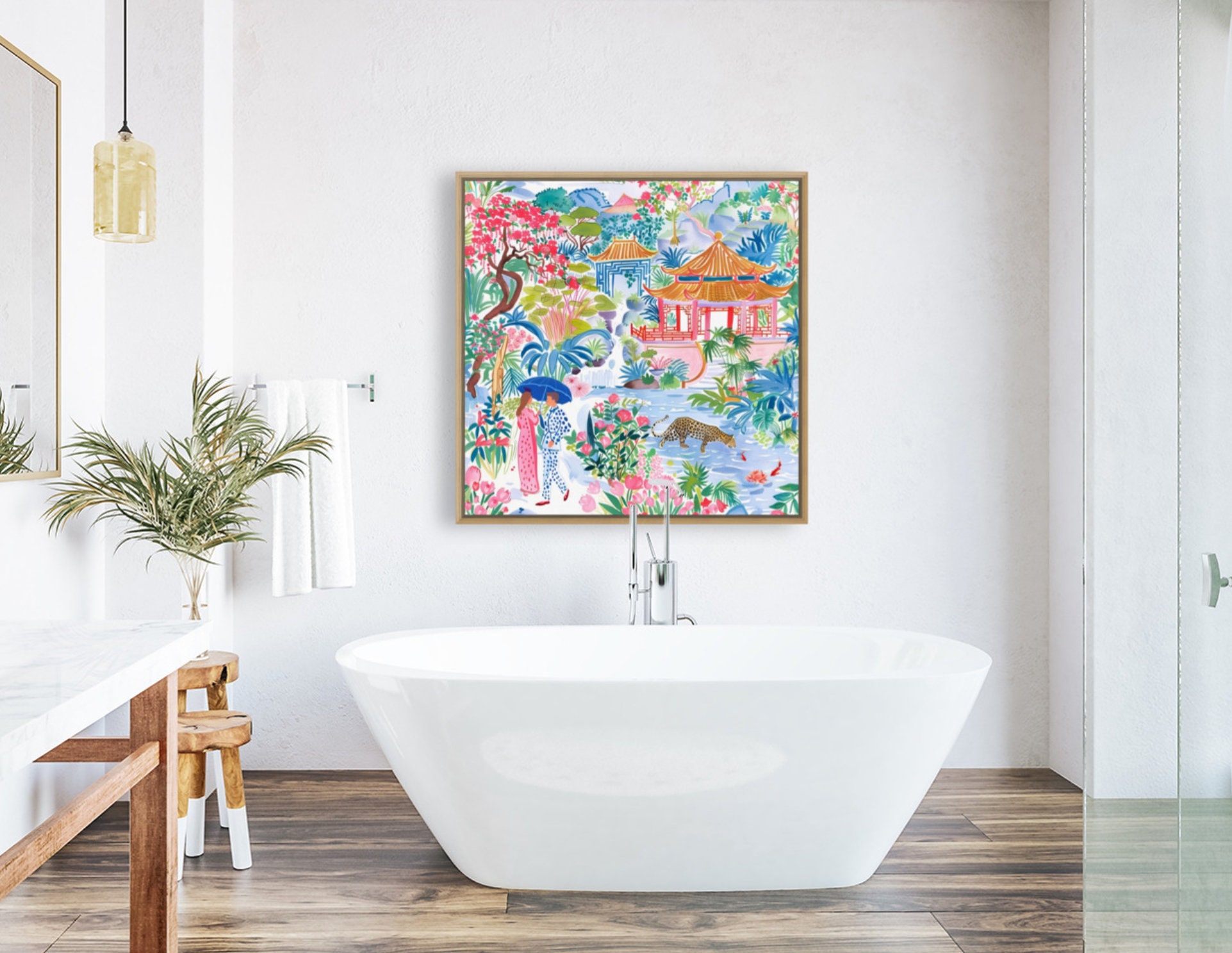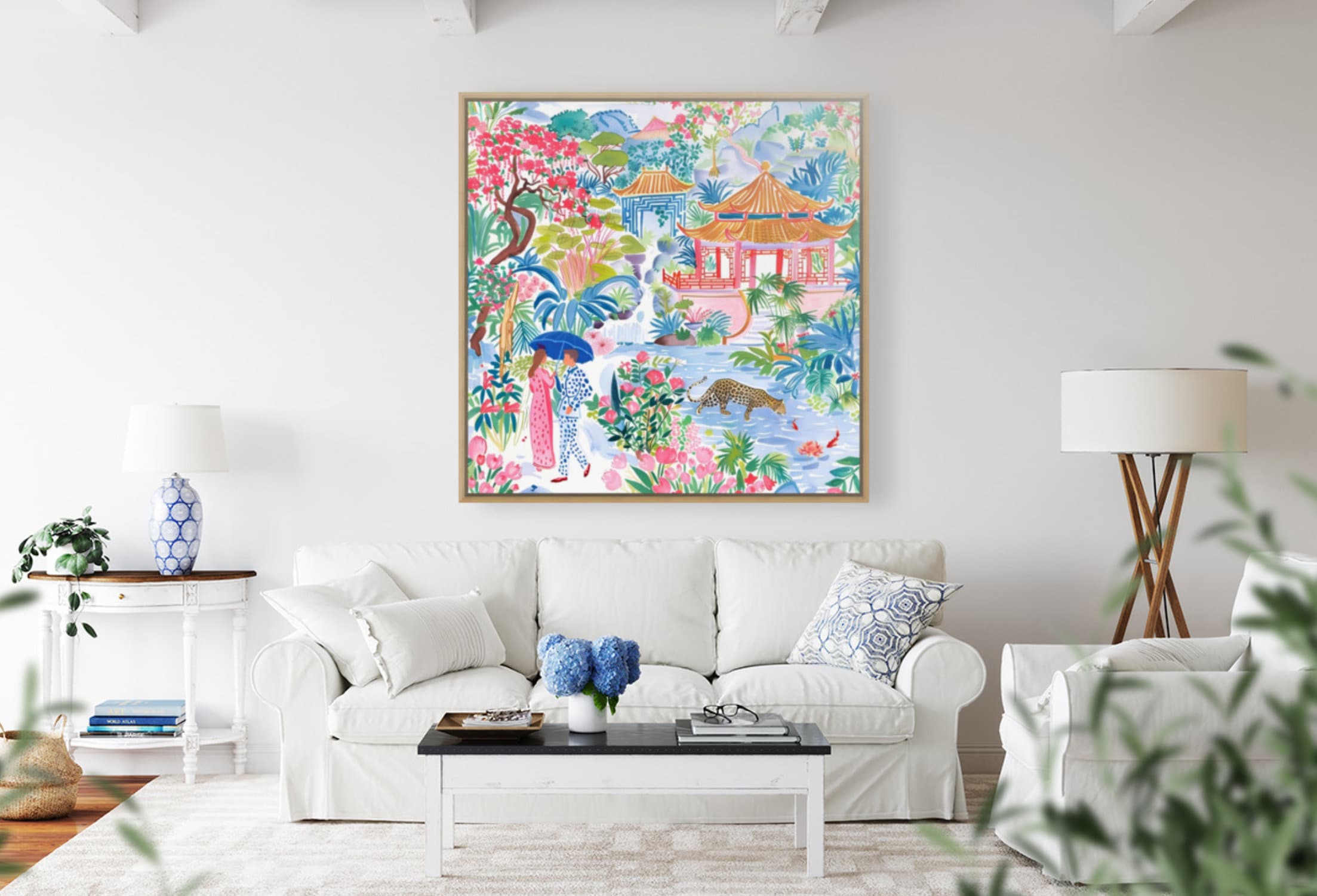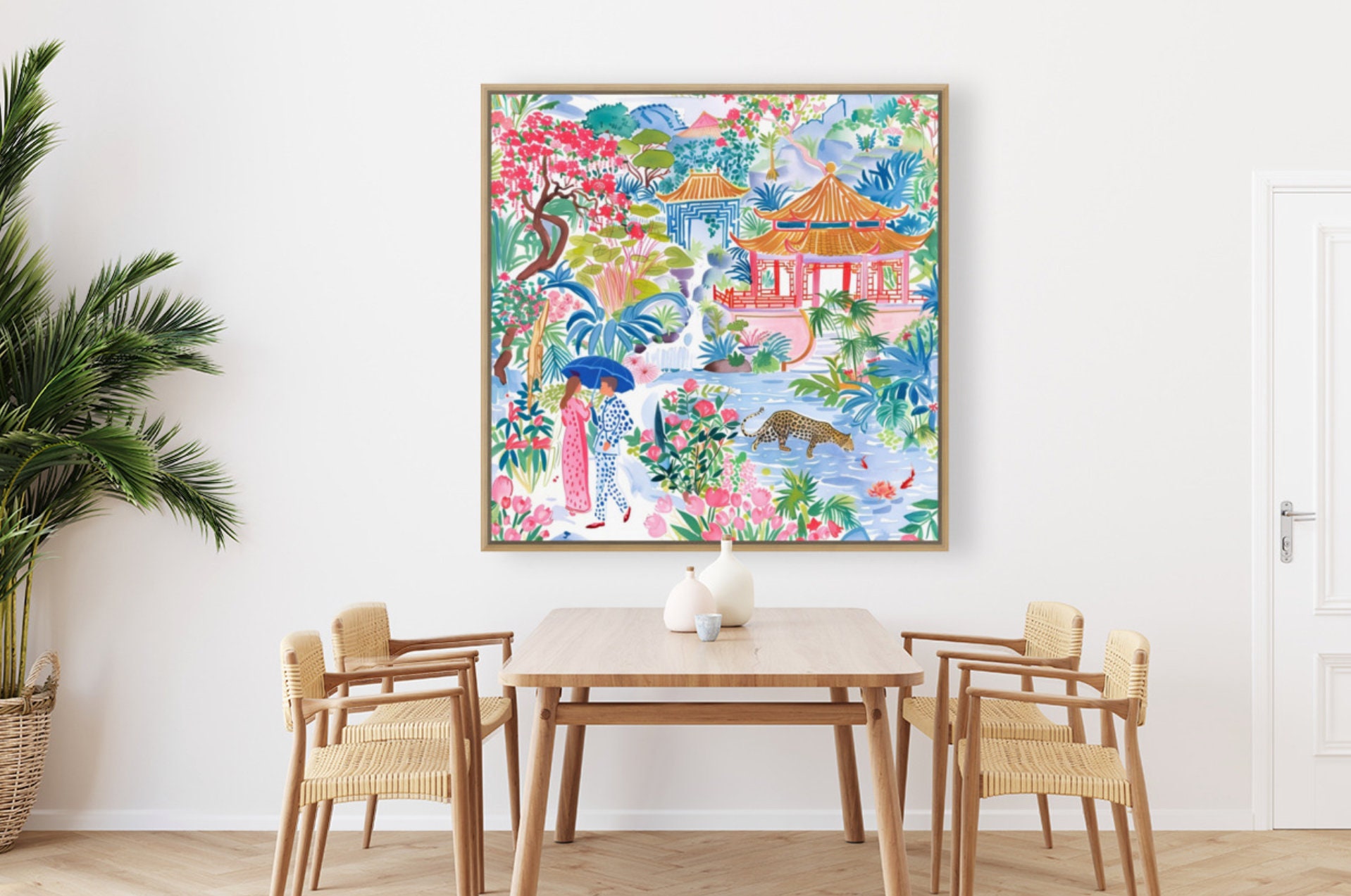 Grandmillennial art, Meeting in Pagoda Garden, chinoiserie art print
