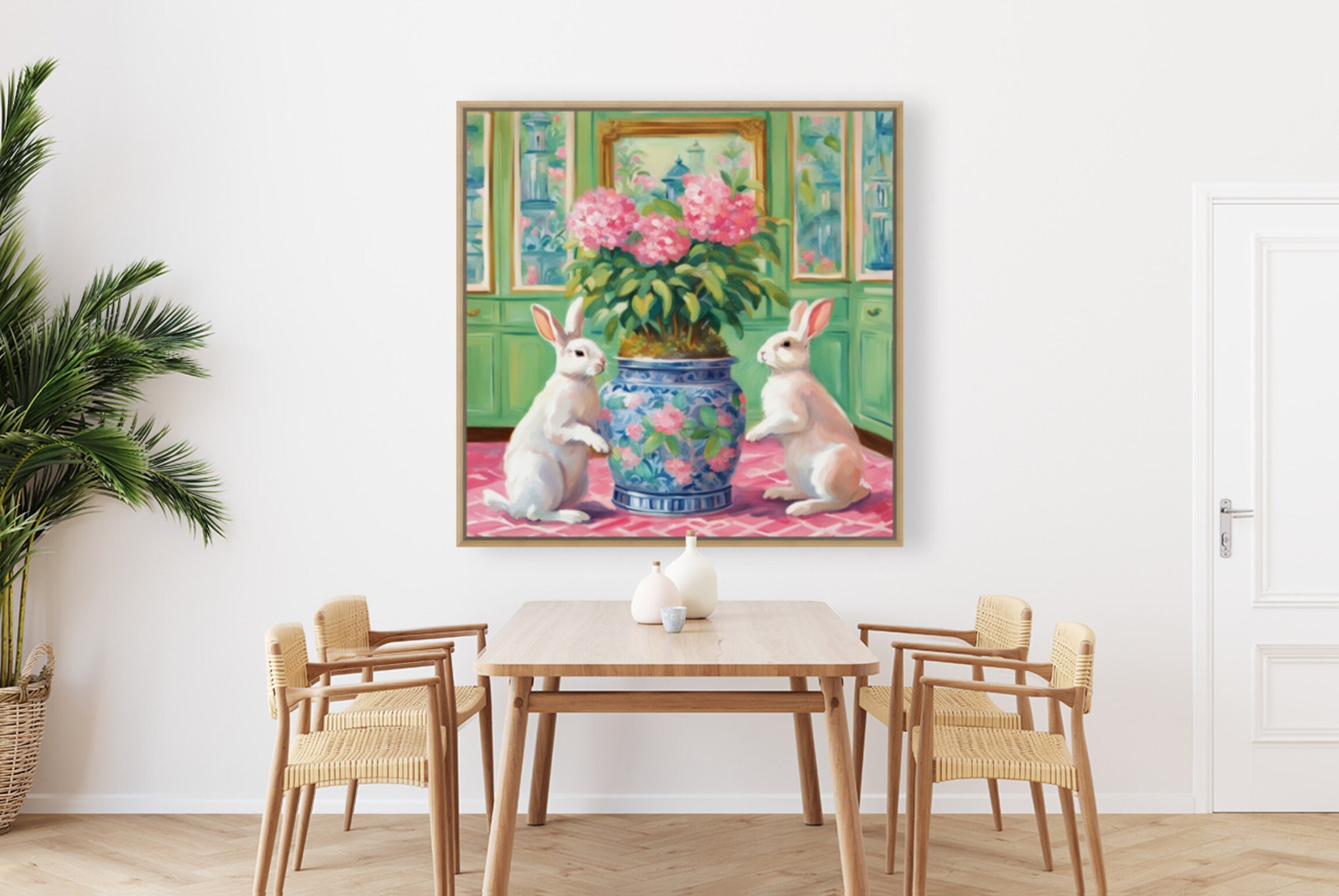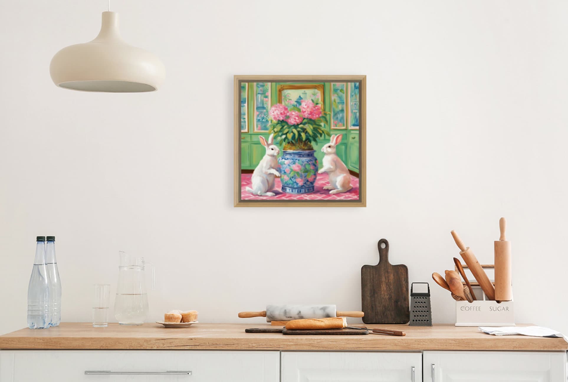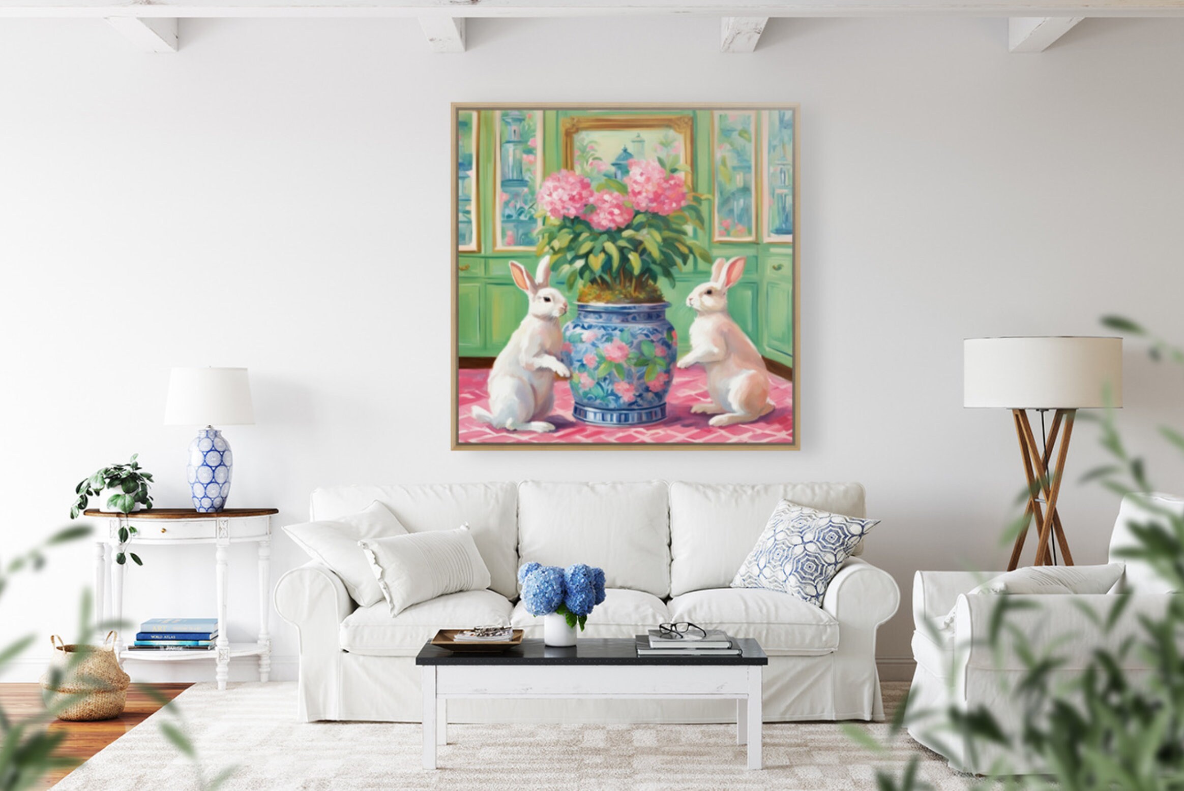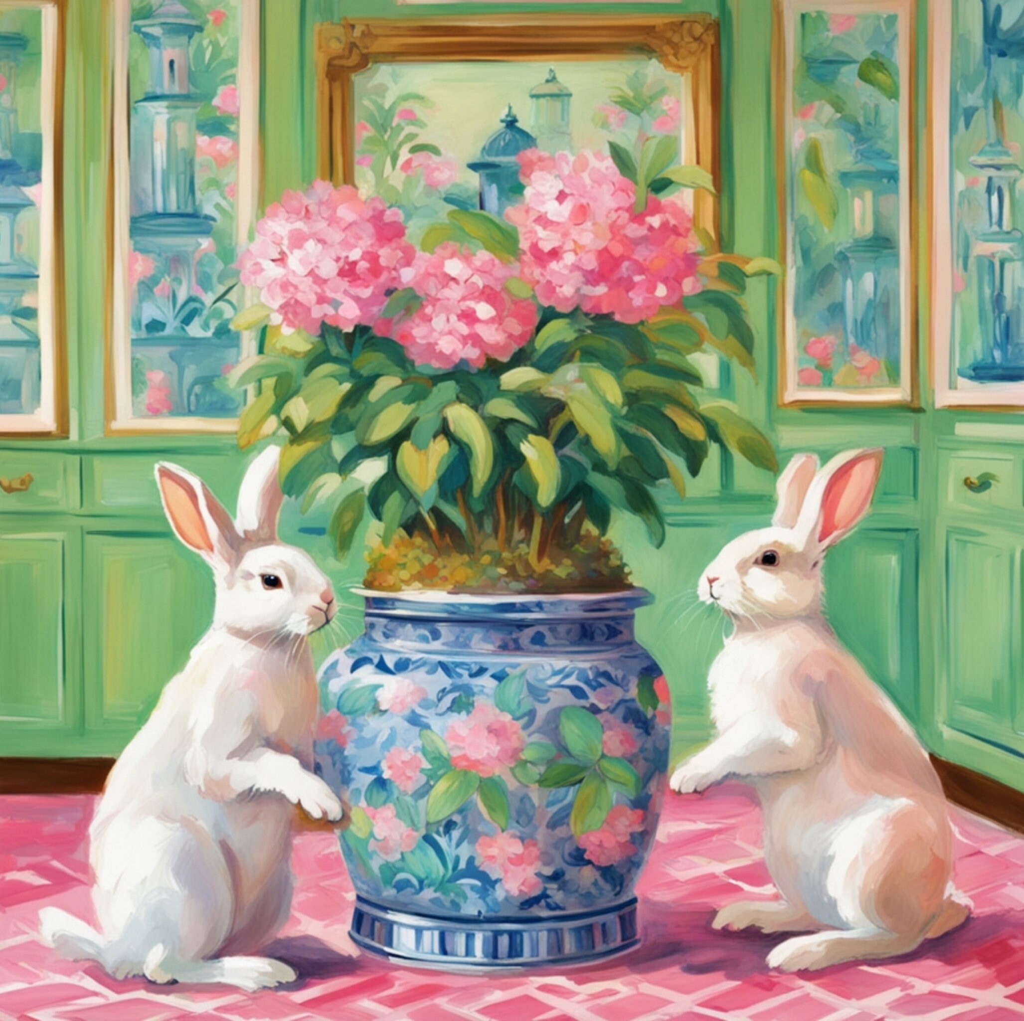 Grandmillennial art, Bunnies and hydrangea bush, whimsical fine art